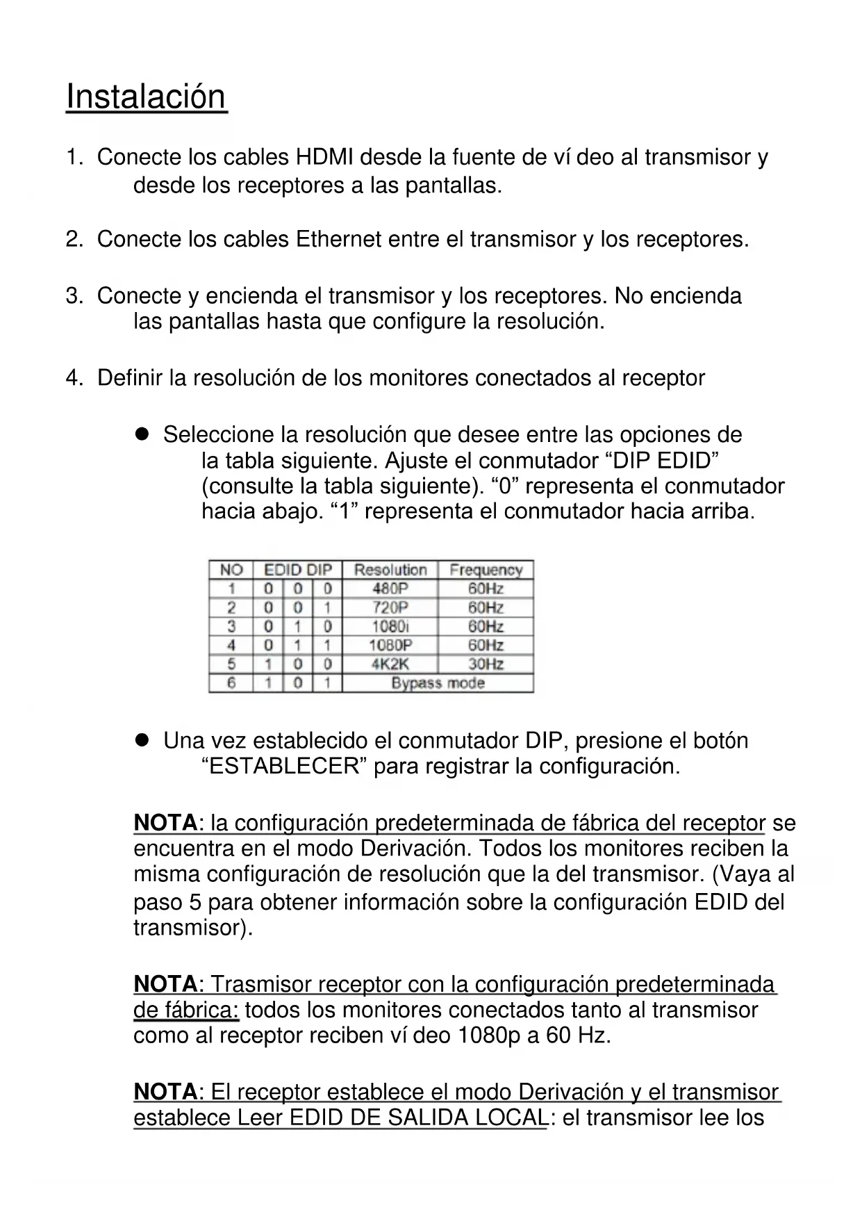 directamente al transmisor. Si la pantalla local no se necesita en el transmisor, omita este paso. Si la visualización no se muestra como se desea, o se necesita una resolución específica, defina la configuración como se indica a continuación. Seleccione la resolución que desee entre las opciones de la tabla siguiente. Ajuste el conmutador “DIP EDID” (consulte la tabla siguiente). “0” representa el conmutador hacia abajo. “1” representa el conmutador hacia arriba. Una vez establecido el conmutador DIP, presione el botón “ESTABLECER” para registrar la configuración. NOTA: La configuración predeterminada de fábrica del transmisor es vídeo 1080p a 60 Hz. NOTA: El receptor establece el modo Derivación y el transmisor establece Leer EDID DE SALIDA LOCAL: el transmisor lee los datos EDID automáticamente del monitor conectado y proporciona la misma configuración a todos los monitores conectados al receptor. Si no hay un monitor local directamente conectado al trasmisor, los datos EDID no se pueden detectar yse puede producir un error de visualización.