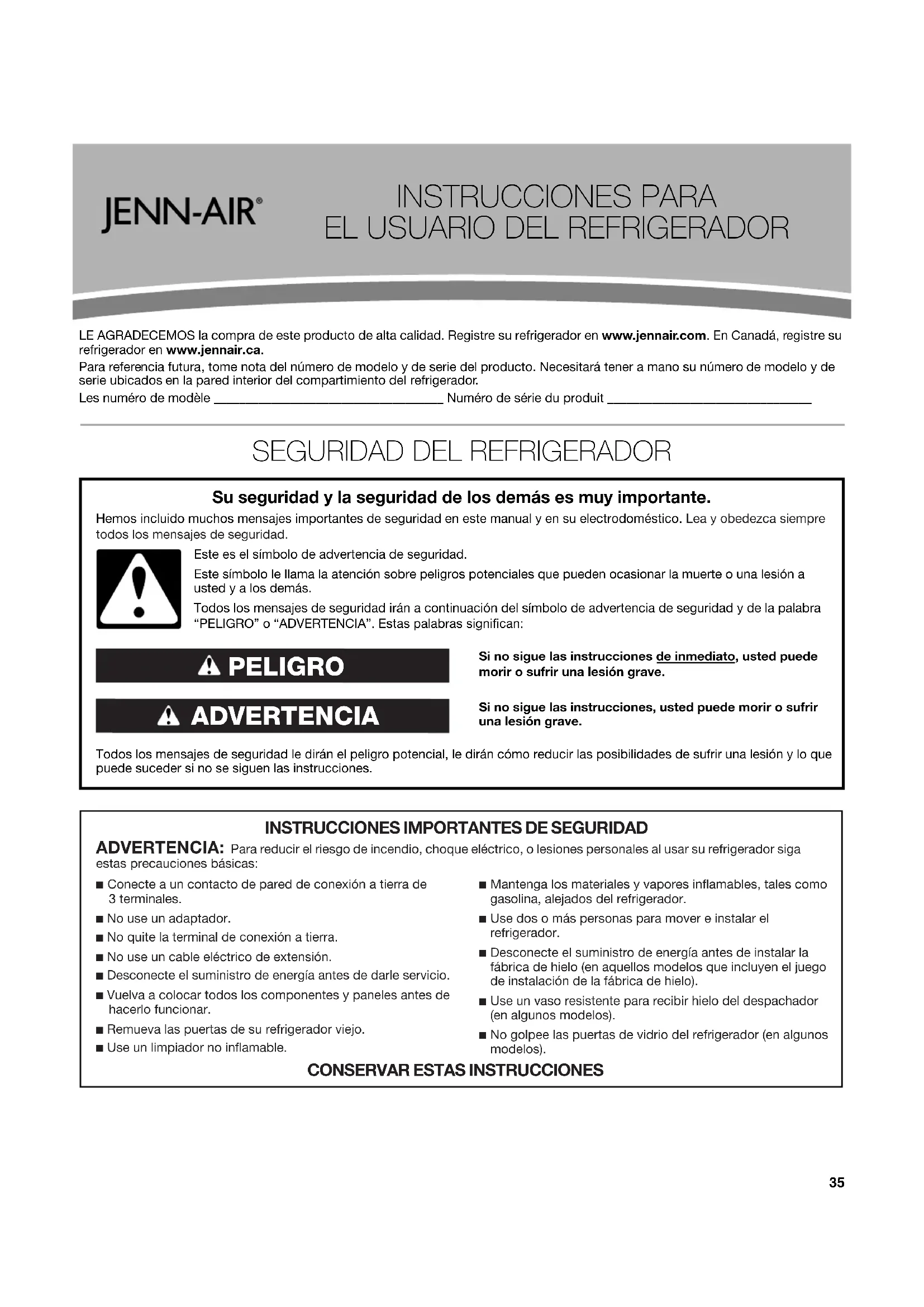 de serie/modelo originales removidos, alterados o no identificados con facilidad. El costo de la reparación o del reemplazo bajo estas circunstancias excluidas correrá por cuenta del cliente.69 2/14 EXCLUSIÓN DE GARANTÍAS IMPLÍCITAS LAS GARANTÍAS IMPLÍCITAS, INCLUYENDO CUALQUIER GARANTÍA IMPLÍCITA DE COMERCIABILIDAD O GARANTÍA IMPLÍCITA DE CAPACIDAD PARA UN PROPÓSITO PARTICULAR, SERÁN LIMITADAS A UN AÑO O AL PERÍODO MÁS CORTO PERMITIDO POR LEY. Algunos estados y provincias no permiten la limitación de la duración de las garantías implícitas de comerciabilidad o capacidad, de modo que la limitación arriba indicada quizá no le corresponda. Esta garantía le otorga derechos legales específicos y es posible que usted tenga también otros derechos que varían de un estado a otro o de una provincia a otra. EXCLUSIÓN DE DECLARACIONES FUERA DE LA GARANTÍA Jenn-Air no hace declaraciones acerca de la calidad, durabilidad o necesidad de servicio técnico o reparación de este electrodoméstico principal aparte de las declaraciones incluidas en esta garantía. Si usted desea una garantía con una duración más prolongada o más completa que la garantía limitada que se incluye con este electrodoméstico principal, deberá dirigirse a Jenn-Air o a su distribuidor acerca de la compra de una garantía extendida. LIMITACIÓN DE RECURSOS; EXCLUSIÓN DE DAÑOS INCIDENTALES Y CONSECUENTES SU ÚNICO Y EXCLUSIVO RECURSO SEGÚN LOS TÉRMINOS DE ESTA GARANTÍA LIMITADA SERÁ EL DE REPARAR EL PRODUCTO SEGÚN SE ESTIPULA EN LA PRESENTE. JENN-AIR NO SE RESPONSABILIZARÁ POR DAÑOS INCIDENTALES O CONSECUENTES. Algunos estados y provincias no permiten la exclusión o limitación de daños incidentales o consecuentes, de modo que estas limitaciones y exclusiones quizás no le correspondan. Esta garantía le otorga derechos legales específicos y es posible que usted tenga también otros derechos que varían de un estado a otro o de una provincia a otra.70 Nous vous REMERCIONS d'avoir acheté ce produit de haute qualité. Enregistrez le réfrigérateur sur www.jennair.ca. Pour référence ultérieure, consignez par écrit les numéros de modèle et de série de votre produit. Vous aurez besoin de vos numéros de modèle et de série situés sur la paroi interne du compartiment de réfrigération.Numéro de modèle du produit______________________________ Numéro de série du produit ________________________________