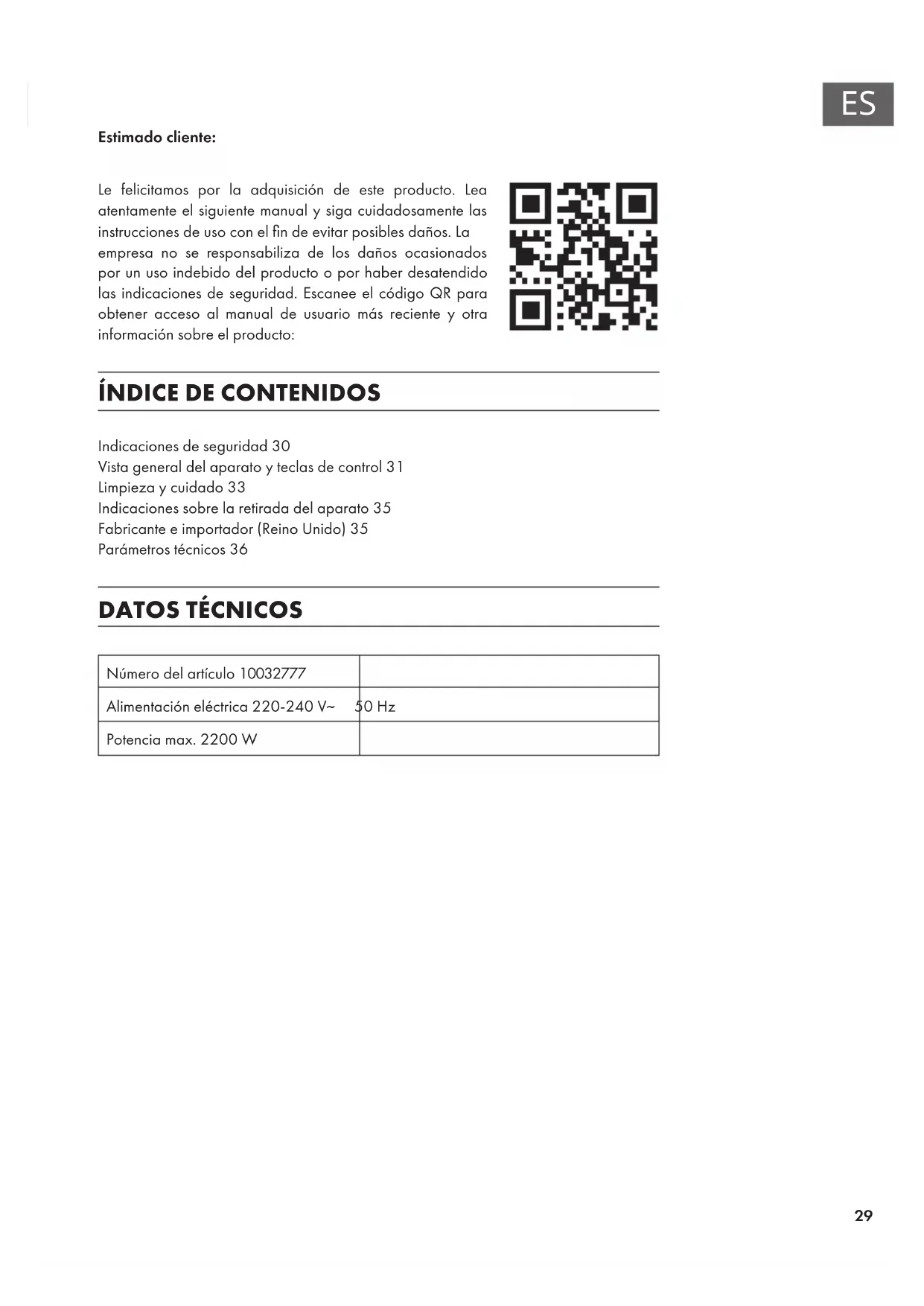 Indicaciones de seguridad 30 Vista general del aparato y teclas de control 31 Limpieza y cuidado 33 Indicaciones sobre la retirada del aparato 35 Fabricante e importador (Reino Unido) 35 Parámetros técnicos 36