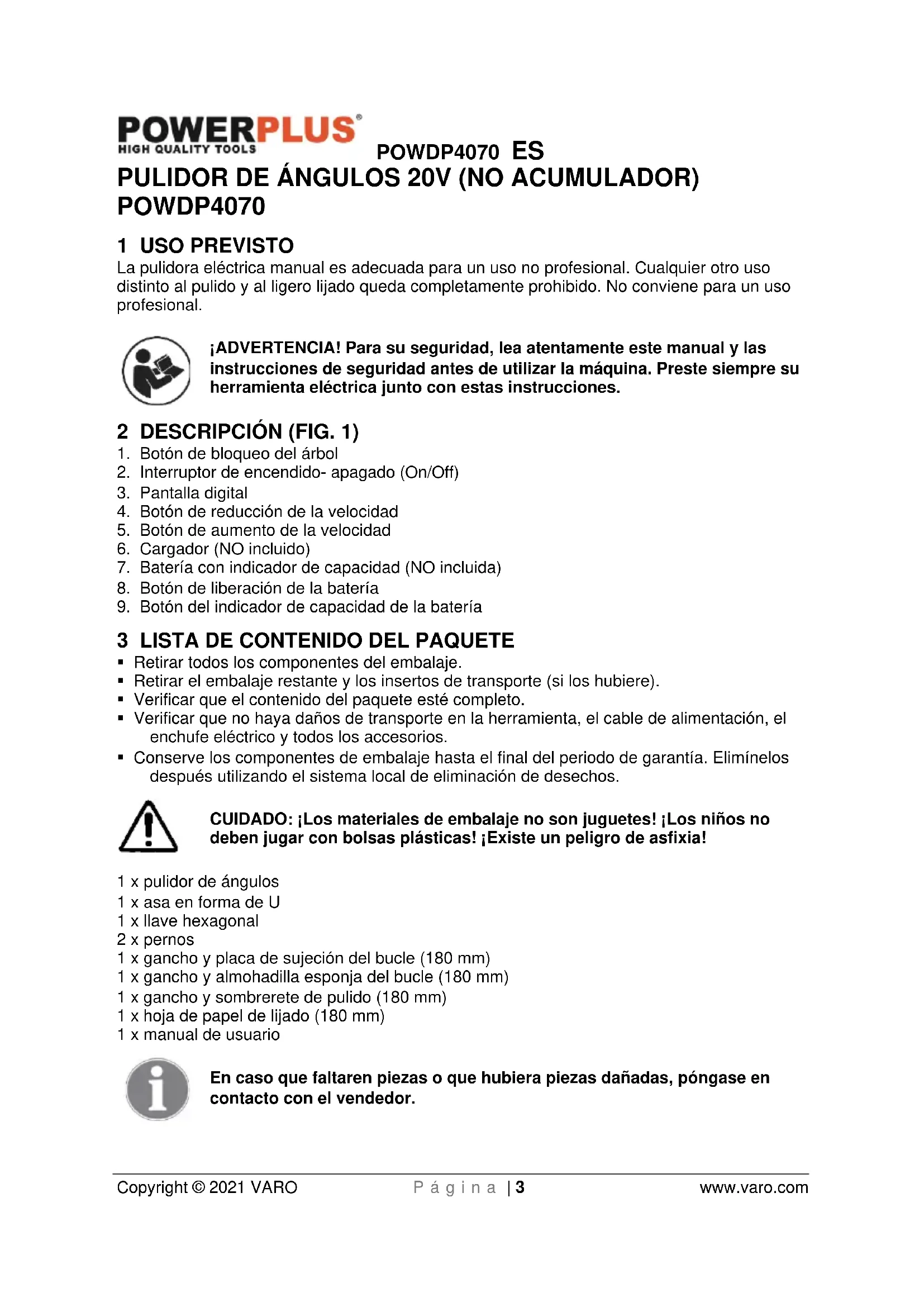 Copyright © 2021 VARO P á g i n a | 3 www.varo.com PULIDOR DE ÁNGULOS 20V (NO ACUMULADOR) POWDP4070 1 USO PREVISTO La pulidora eléctrica manual es adecuada para un uso no profesional. Cualquier otro uso distinto al pulido y al ligero lijado queda completamente prohibido. No conviene para un uso profesional. ¡ADVERTENCIA! Para su seguridad, lea atentamente este manual y las instrucciones de seguridad antes de utilizar la máquina. Preste siempre su herramienta eléctrica junto con estas instrucciones. 2 DESCRIPCIÓN (FIG. 1)