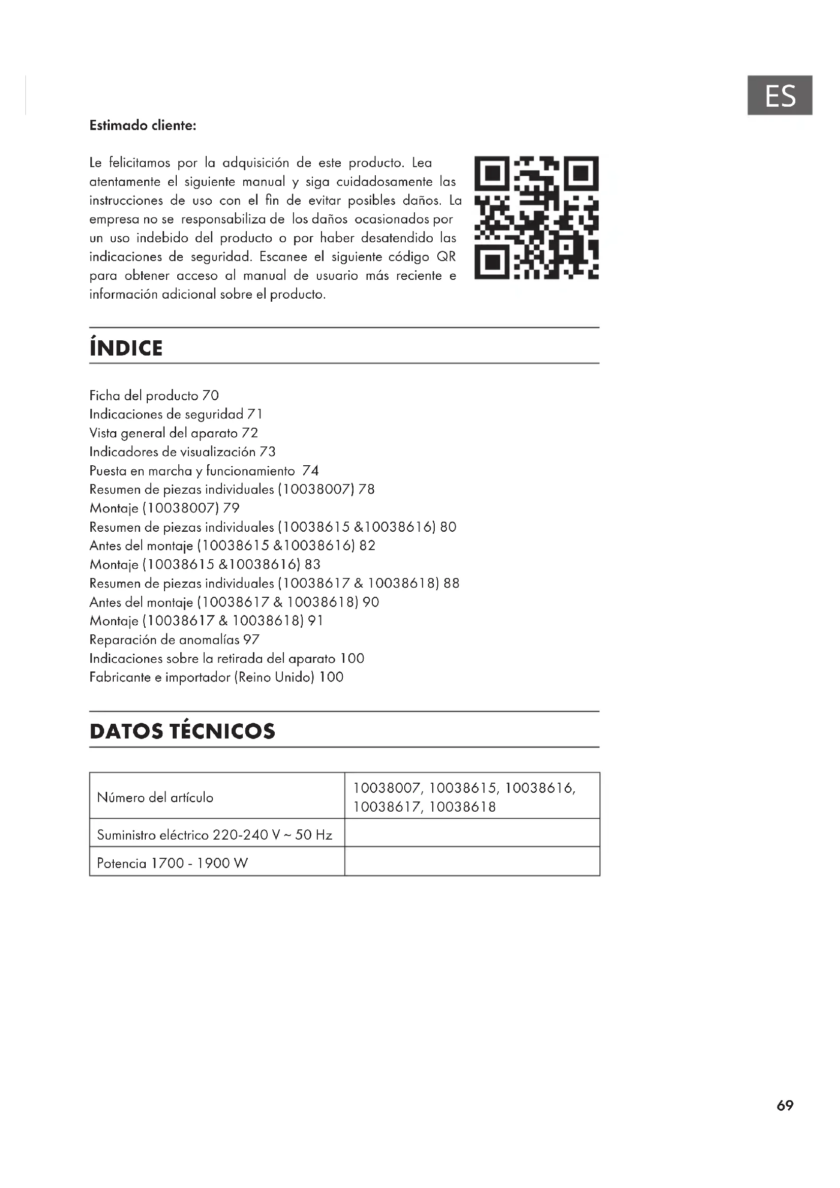 Estimado cliente: Le felicitamos por la adquisición de este producto. Lea atentamente el siguiente manual y siga cuidadosamente las instrucciones de uso con el n de evitar posibles daños. La empresa no se responsabiliza de los daños ocasionados por un uso indebido del producto o por haber desatendido las indicaciones de seguridad. Escanee el siguiente código QR para obtener acceso al manual de usuario más reciente e información adicional sobre el producto. ÍNDICE Ficha del producto70 Indicaciones de seguridad71 Vista general del aparato72 Indicadores de visualización73 Puesta en marcha y funcionamiento 74 Resumen de piezas individuales (10038007)78 Montaje (10038007)79 Resumen de piezas individuales (10038615 &10038616)80 Antes del montaje (10038615 &10038616)82 Montaje (10038615 &10038616)83 Resumen de piezas individuales (10038617 & 10038618)88 Antes del montaje (10038617 & 10038618)90 Montaje (10038617 & 10038618)91 Reparación de anomalías97 Indicaciones sobre la retirada del aparato100 Fabricante e importador (Reino Unido)100