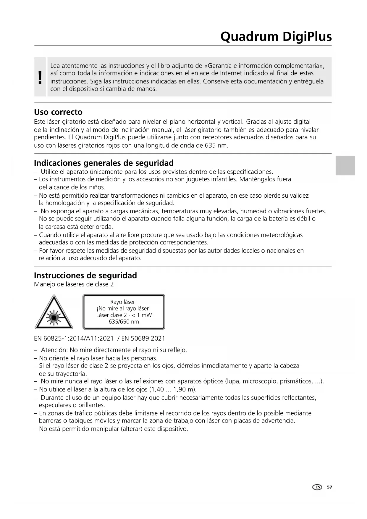 Uso correcto Este láser giratorio está diseñado para nivelar el plano horizontal y vertical. Gracias al ajuste digital de la inclinación y al modo de inclinación manual, el láser giratorio también es adecuado para nivelar pendientes. El Quadrum DigiPlus puede utilizarse junto con receptores adecuados diseñados para su uso con láseres giratorios rojos con una longitud de onda de 635 nm. – Utilice el aparato únicamente para los usos previstos dentro de las especicaciones. – Los instrumentos de medición y los accesorios no son juguetes infantiles. Manténgalos fuera del alcance de los niños. – No está permitido realizar transformaciones ni cambios en el aparato, en ese caso pierde su validez la homologación y la especicación de seguridad. – No exponga el aparato a cargas mecánicas, temperaturas muy elevadas, humedad o vibraciones fuertes. – No se puede seguir utilizando el aparato cuando falla alguna función, la carga de la batería es débil o la carcasa está deteriorada. – Cuando utilice el aparato al aire libre procure que sea usado bajo las condiciones meteorológicas adecuadas o con las medidas de protección correspondientes. – Por favor respete las medidas de seguridad dispuestas por las autoridades locales o nacionales en relación al uso adecuado del aparato. Indicaciones generales de seguridad EN 60825-1:2014/A11:2021 / EN 50689:2021 – Atención: No mire directamente el rayo ni su reejo. – No oriente el rayo láser hacia las personas. – Si el rayo láser de clase 2 se proyecta en los ojos, ciérrelos inmediatamente y aparte la cabeza de su trayectoria. – No mire nunca el rayo láser o las reexiones con aparatos ópticos (lupa, microscopio, prismáticos, ...). – No utilice el láser a la altura de los ojos (1,40 ... 1,90 m). – Durante el uso de un equipo láser hay que cubrir necesariamente todas las supercies reectantes, especulares o brillantes. – En zonas de tráco públicas debe limitarse el recorrido de los rayos dentro de lo posible mediante barreras o tabiques móviles y marcar la zona de trabajo con láser con placas de advertencia. – No está permitido manipular (alterar) este dispositivo. Rayo láser! ¡No mire al rayo láser! Láser clase 2 · < 1 mW 635/650 nm Instrucciones de seguridad Manejo de láseres de clase 258