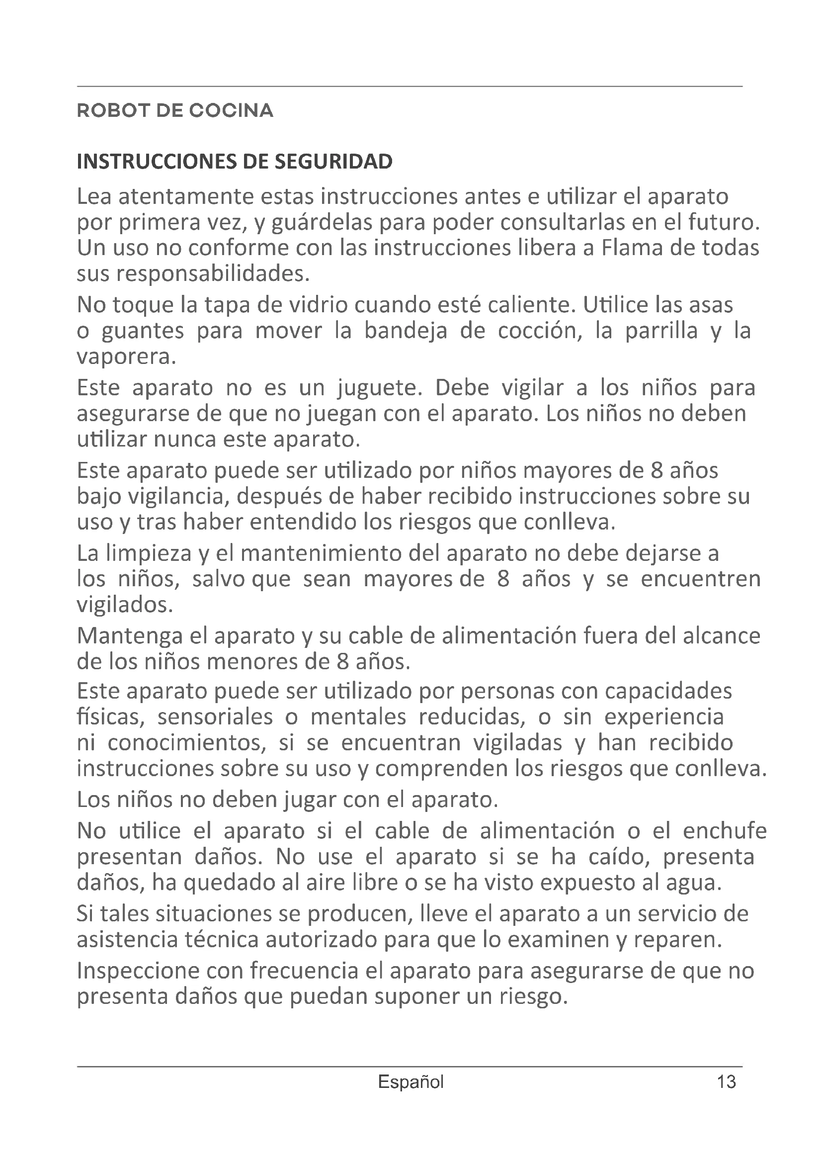 Lea atentamente estas instrucciones antes e ulizar el aparato por primera vez, y guárdelas para poder consultarlas en el futuro. Un uso no conforme con las instrucciones libera a Flama de todas sus responsabilidades. No toque la tapa de vidrio cuando esté caliente. Ulice las asas o guantes para mover la bandeja de cocción, la parrilla y la vaporera. Este aparato no es un juguete. Debe vigilar a los niños para asegurarse de que no juegan con el aparato. Los niños no deben ulizar nunca este aparato. Este aparato puede ser ulizado por niños mayores de 8 años bajo vigilancia, después de haber recibido instrucciones sobre su uso y tras haber entendido los riesgos que conlleva. La limpieza y el mantenimiento del aparato no debe dejarse a los niños, salvo que sean mayores de 8 años y se encuentren vigilados. Mantenga el aparato y su cable de alimentación fuera del alcance de los niños menores de 8 años. Este aparato puede ser ulizado por personas con capacidades sicas, sensoriales o mentales reducidas, o sin experiencia ni conocimientos, si se encuentran vigiladas y han recibido instrucciones sobre su uso y comprenden los riesgos que conlleva. Los niños no deben jugar con el aparato. No ulice el aparato si el cable de alimentación o el enchufe presentan daños. No use el aparato si se ha caído, presenta daños, ha quedado al aire libre o se ha visto expuesto al agua. Si tales situaciones se producen, lleve el aparato a un servicio de asistencia técnica autorizado para que lo examinen y reparen. Inspeccione con frecuencia el aparato para asegurarse de que no presenta daños que puedan suponer un riesgo. ROBOT DE COCINA14 www.ama.pt Para evitar descargas eléctricas, no sumerja el cable, el enchufe o el aparato ni en agua ni en ningún otro líquido. Las descargas eléctricas pueden provocar lesiones y/o dañar el aparato. Mantenga el cable de alimentación alejado de supercies calientes, y no cubra los sistemas de venlación del aparato. No deje que el cable cuelgue por el borde de la mesa o de la encimera. No coloque el aparato en las proximidades o encima de un fogón de gas, eléctrico o vitrocerámico, ni sobre un horno caliente. Desenchufe siempre el aparato al terminar de usarlo y antes de proceder a su limpieza. Espere a que se enfríe antes de limpiarlo o guardarlo. Todas las labores de mantenimiento —excepto la limpieza— deben ser llevadas a cabo en un servicio de asistencia técnica autorizado. El uso de accesorios no recomendados ni comercializados por Flama podría provocar un incendio, una descarga eléctrica, lesiones o daños en el aparato. Ulice exclusivamente la bandeja de cocción y la parrilla que se proporcionan. No coloque ninguna otra bandeja ni parrilla sobre la base de calentamiento. Este aparato no ha sido diseñado para ser puesto en marcha mediante un temporizador externo o un sistema independiente de operación a distancia. Este aparato ha sido diseñado exclusivamente para un uso domésco, no profesional o industrial. No ulice el aparato en vehículos o embarcaciones en movimiento. Un uso inadecuado podría provocar lesiones. Este aparato no ha sido diseñado para ser ulizado: - En zonas de cocina reservadas a los empleados de endas, ocinas y otros entornos profesionales - En cabañas - Por los clientes de hoteles, moteles y otras unidades de po residencial - En posadas y similares15 Español Para evitar el riesgo de incendio, no ulice el aparato en presencia de vapores explosivos o inamables. Lleve mucho cuidado al ulizar o mover el aparato cuando contenga alimentos o líquidos calientes. No mueva el aparato durante la cocción. Coloque el aparato sobre una supercie seca, estable, plana, resistente al calor y al agua, a salvo de salpicaduras y alejado de otras fuentes de calor. Este aparato debe colocarse de manera estable y lejos de cualquier fuente de calor, y debe usarse con las asas instaladas, para evitar el derrame de los líquidos calientes. Coloque el aparato alejado de paredes, cornas y otros materiales sensibles al calor y al vapor. El aparato debe colocarse al menos a 20 cenmetros de cualquier otro objeto. Al ulizar el aparato, deje espacio por encima y por los lados para que circule el aire. Antes de ulizarlo, asegúrese de que el aparato se encuentra correctamente montado. No encienda el aparato sin la bandeja de cocción o la parrilla sobre la base de calentamiento. No coloque alimentos o líquidos directamente sobre la base de calentamiento. Solo la bandeja de cocción y la parrilla han sido diseñadas para ser ulizadas sobre la base de calentamiento. No pona en marcha el aparato sin alimentos o líquidos en la bandeja de cocción o la parrilla. Antes de encender el aparato, asegúrese de que los alimentos y los líquidos que desea cocinar alcanzan al menos la mitad de la bandeja de cocción. La tapa de vidrio no es irrompible. Si la golpea con fuerza, el vidrio podría quebrarse, o incluso debilitarse y romperse posteriormente sin causa aparente. Asegúrese de colocar correctamente la tapa sobre la bandeja de cocción o la vaporera. No coloque la bandeja de cocción ni la parrilla sobre ninguna supercie que pueda dañarse con el calor. No ulice la bandeja de cocción, la parrilla, la vaporera o la tapa en un horno convencional.16 www.ama.pt No deje que el agua de la tapa gotee sobre la base de calentamiento. Mantenga el aparato y sus accesorios siempre limpios. Siga las instrucciones de limpieza y mantenimiento. No deje utensilios de plásco o sensibles al calor sobre de la bandeja de cocción o la parrilla con el aparato en funcionamiento. Conecte siempre el aparato a un enchufe con toma de erra. Mantenga el aparato y el cable de alimentación fuera del alcance de los niños. Si el cable de alimentación presenta daños, debe sustuirse en un servicio de asistencia técnica. Este producto respeta las direcvas de compabilidad electromagnéca y de baja tensión. Este manual de instrucciones también se encuentra disponible en forma