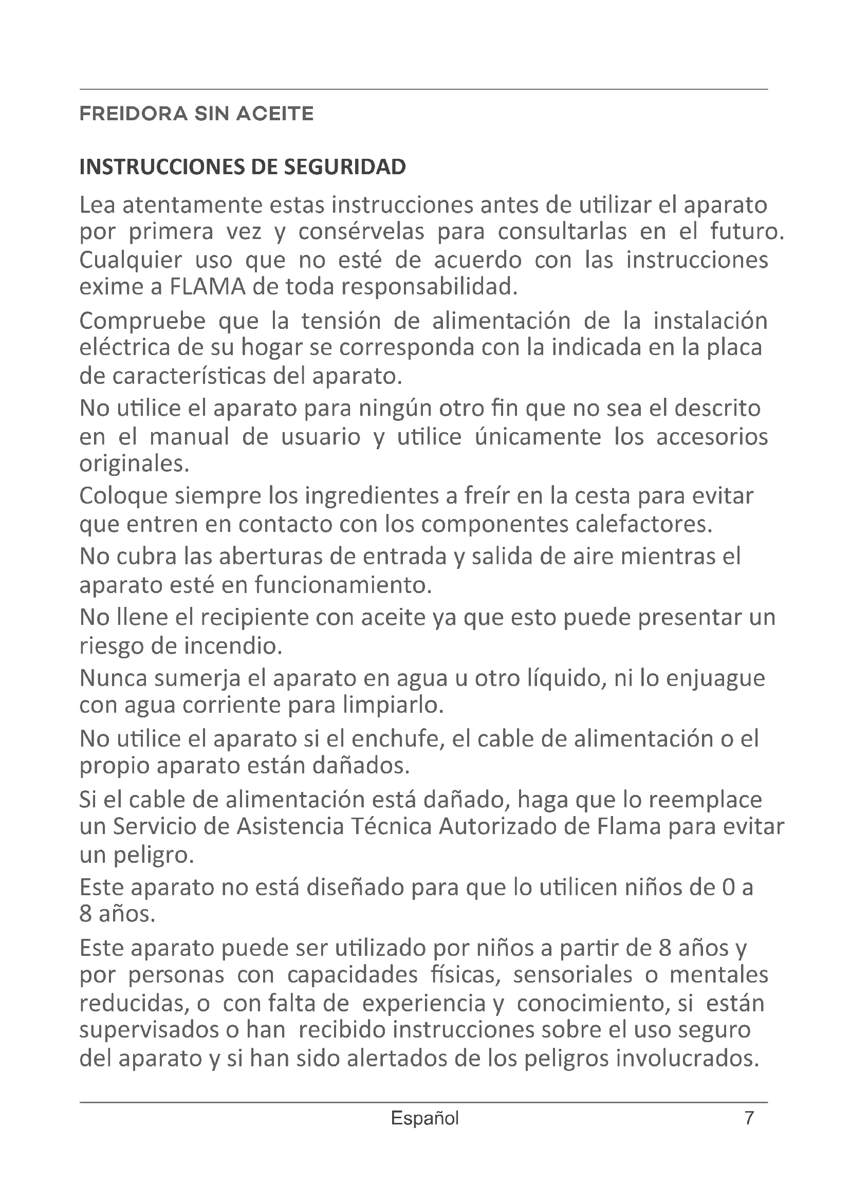 Lea atentamente estas instrucciones antes de ulizar el aparato por primera vez y consérvelas para consultarlas en el futuro. Cualquier uso que no esté de acuerdo con las instrucciones exime a FLAMA de toda responsabilidad. Compruebe que la tensión de alimentación de la instalación eléctrica de su hogar se corresponda con la indicada en la placa de caracteríscas del aparato. No ulice el aparato para ningún otro n que no sea el descrito en el manual de usuario y ulice únicamente los accesorios originales. Coloque siempre los ingredientes a freír en la cesta para evitar que entren en contacto con los componentes calefactores. No cubra las aberturas de entrada y salida de aire mientras el aparato esté en funcionamiento. No llene el recipiente con aceite ya que esto puede presentar un riesgo de incendio. Nunca sumerja el aparato en agua u otro líquido, ni lo enjuague con agua corriente para limpiarlo. No ulice el aparato si el enchufe, el cable de alimentación o el propio aparato están dañados. Si el cable de alimentación está dañado, haga que lo reemplace un Servicio de Asistencia Técnica Autorizado de Flama para evitar un peligro. Este aparato no está diseñado para que lo ulicen niños de 0 a 8 años. Este aparato puede ser ulizado por niños a parr de 8 años y por personas con capacidades sicas, sensoriales o mentales reducidas, o con falta de experiencia y conocimiento, si están supervisados o han recibido instrucciones sobre el uso seguro del aparato y si han sido alertados de los peligros involucrados.8 www.ama.pt Los niños no pueden jugar con el disposivo. La limpieza y el mantenimiento del usuario no pueden ser realizados por niños. Mantenga el aparato y su cable fuera del alcance de los niños menores de 8 años. Mantenga el cable de alimentación alejado de supercies calientes. Este aparato solo debe conectarse a una toma de erra. Compruebe siempre que el enchufe esté completamente insertado en la toma. Coloque y ulice siempre el aparato sobre una supercie seca, estable y horizontal con las asas (si las hay) colocadas para evitar el derrame de líquidos calientes. Este aparato no está diseñado para ser operado por un temporizador externo o un sistema de control remoto independiente. No apoye el disposivo contra una pared u otros disposivos. Deje al menos 10 cm de espacio libre en la parte posterior y los lados y 10 cm de espacio libre por encima del aparato. No coloque nada encima del disposivo. Durante la fritura con aire caliente, se libera vapor caliente por las aberturas de salida de aire. Mantenga las manos y la cara a una distancia segura de las salidas de vapor y de escape. También tenga cuidado con el vapor y el aire calientes al sacar el recipiente del aparato. Las supercies accesibles pueden calentarse durante el uso. Los accesorios del aparato se calientan cuando los usa. Tenga cuidado al manipularlos. Antes de cada uso del disposivo, asegúrese de que el componente de calentamiento y su área circundante estén limpios y libres de restos de comida para garanzar un funcionamiento correcto. No coloque el aparato cerca o sobre una cocina de gas o cualquier po de cocina eléctrica o fogones, o en un horno caliente. Este aparato está diseñado para uso domésco normal9 Español únicamente. No está diseñado para entornos como despensas de personal en endas, ocinas, granjas y otros entornos de trabajo. Tampoco es adecuado para que lo ulicen clientes en hoteles, moteles, posadas y otros entornos residenciales. Este aparato está diseñado para ser ulizado a temperaturas ambiente entre 5 ° C y 40 ° C. Apague siempre el aparato después de cada uso quitando el enchufe de la toma de corriente. Deje que el aparato se enfríe durante aproximadamente 30 minutos antes de manipularlo o limpiarlo. No llene demasiado la cesta. Llene la cesta solo hasta la indicación MAX. Asegúrese de que los ingredientes preparados en este aparato sean de color amarillo dorado en lugar de oscuros o marrones. Elimine los residuos quemados. No freír patatas frescas a más de 180 ° C (para reducir la producción de acrilamida). Después de sacar el recipiente con la cesta del aparato, colóquelo sobre una supercie adecuada y déjelo reposar durante 30 segundos antes de sacar la cesta del recipiente. Tenga cuidado al limpiar la zona superior de la cámara de preparación: resistencia al calor, bordes de piezas metálicas. No ulice el aparato para ningún otro n que no sea el descrito en el manual de instrucciones y ulice únicamente accesorios originales. Cualquier intervención más allá de la limpieza debe ser realizada únicamente por agentes autorizados de FLAMA. Cualquier intervención más allá de la limpieza debe ser realizada únicamente por agentes autorizados de FLAMA. Este producto cumple con las Direcvas de compabilidad electromagnéca y de bajo voltaje. Este manual de instrucciones también está disponible en formato PDF en www.ama.pt10 www.ama.pt DESCRIPCIÓN