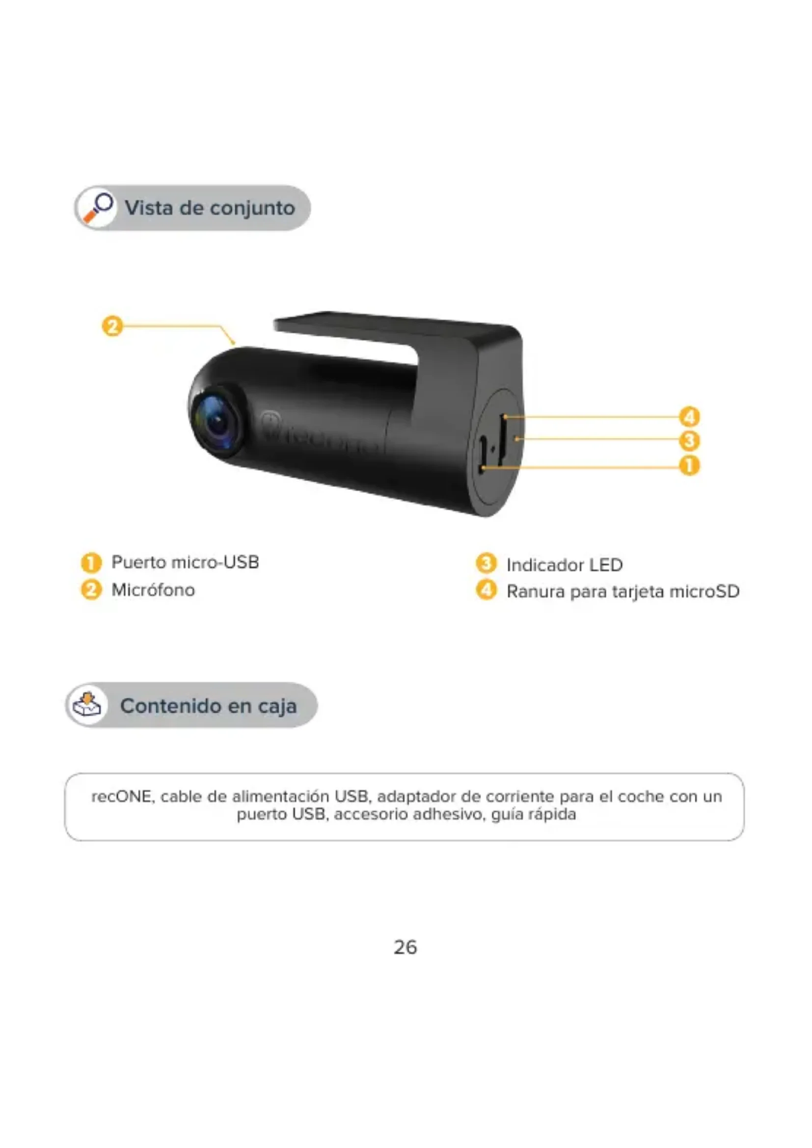 - Para grabar vídeos y tomar fotografías, recONE necesita una tarjeta microSD. (No se incluye la tarjeta microSD.)