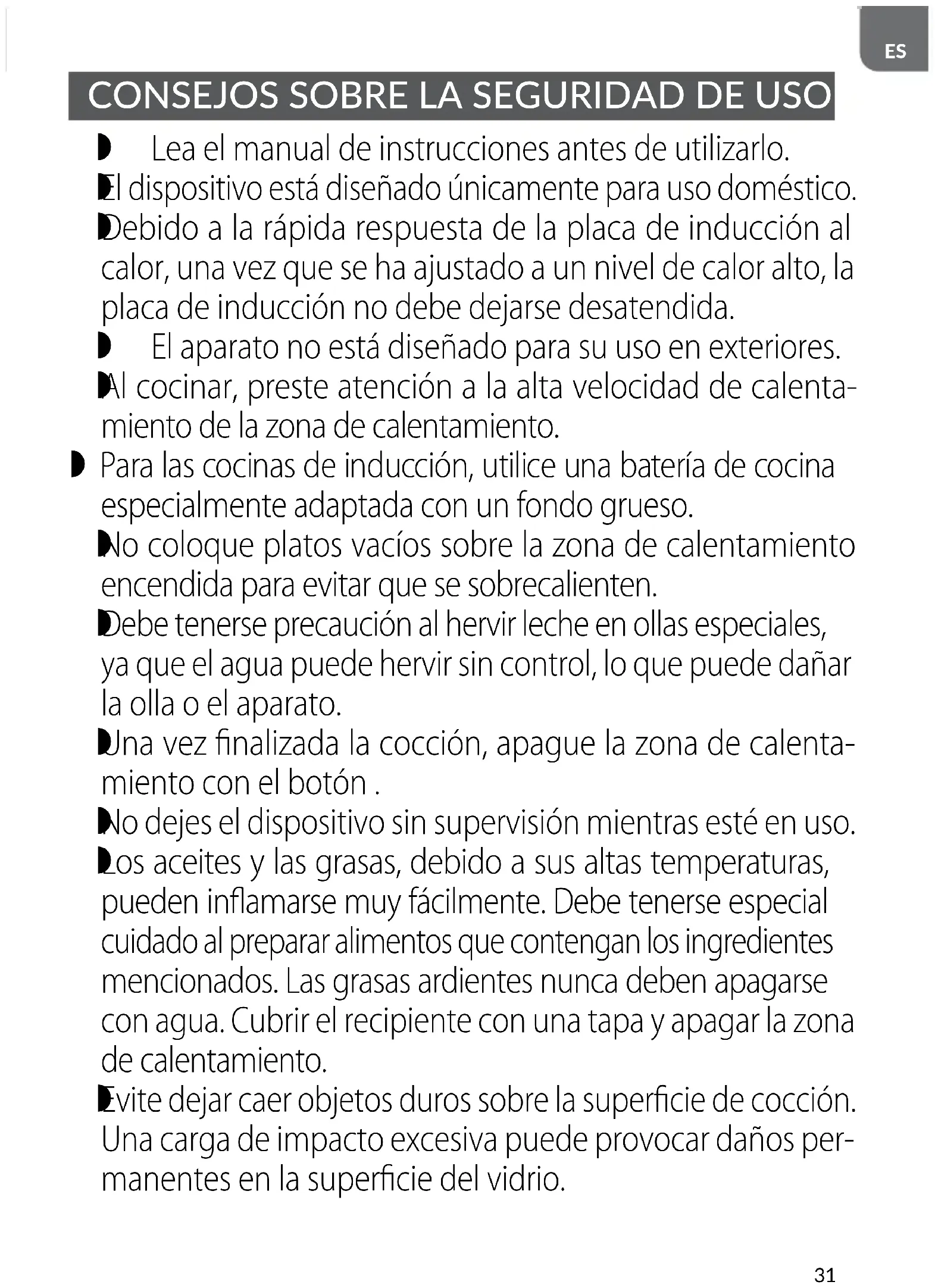 Los aceites y las grasas, deben a sus altas temperatas, poder inflamarse muy fácilmente. Debe tenerse especial cuidado al preparar alimentos que contenga los ingredientes Mentionados. Las grasas ardientes nunca deben apagarse con agua. Cubrir el recipiente con una tapa y apagar la zona de calentimiento.
