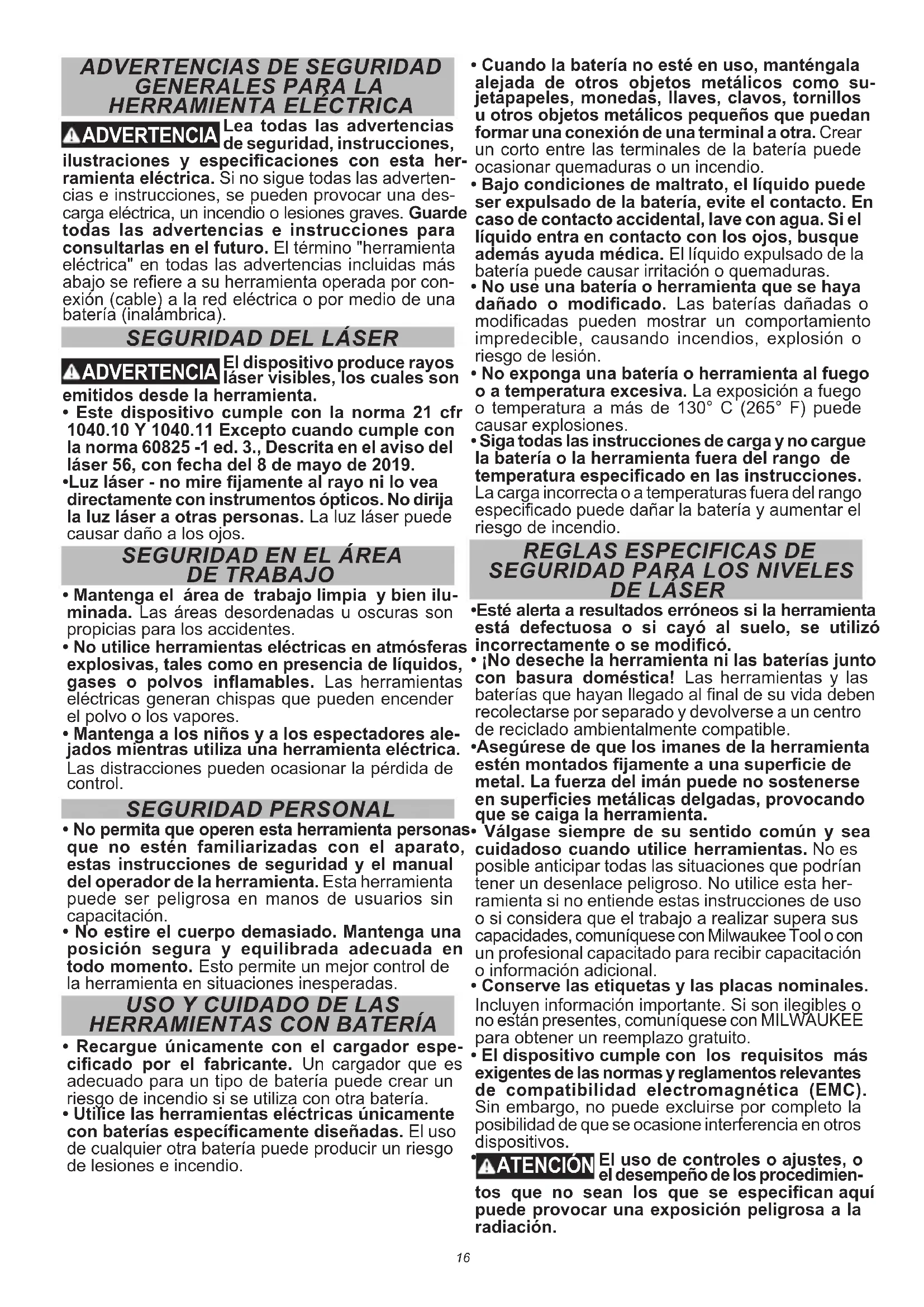 - Válgase siempre de su sentido común y sea cuidadoso cuando utilice herramientas. No es posible anticipar todas las situaciones que podrían tener un desenlace peligroso. No utilice esta her- ramienta si no entiende estas instrucciones de uso o si considera que el trabajo a realizar supera sus capacidades, comuníquese con Milwaukee Tool o con un profesional capacitado para recibir capacitación o información adicional.