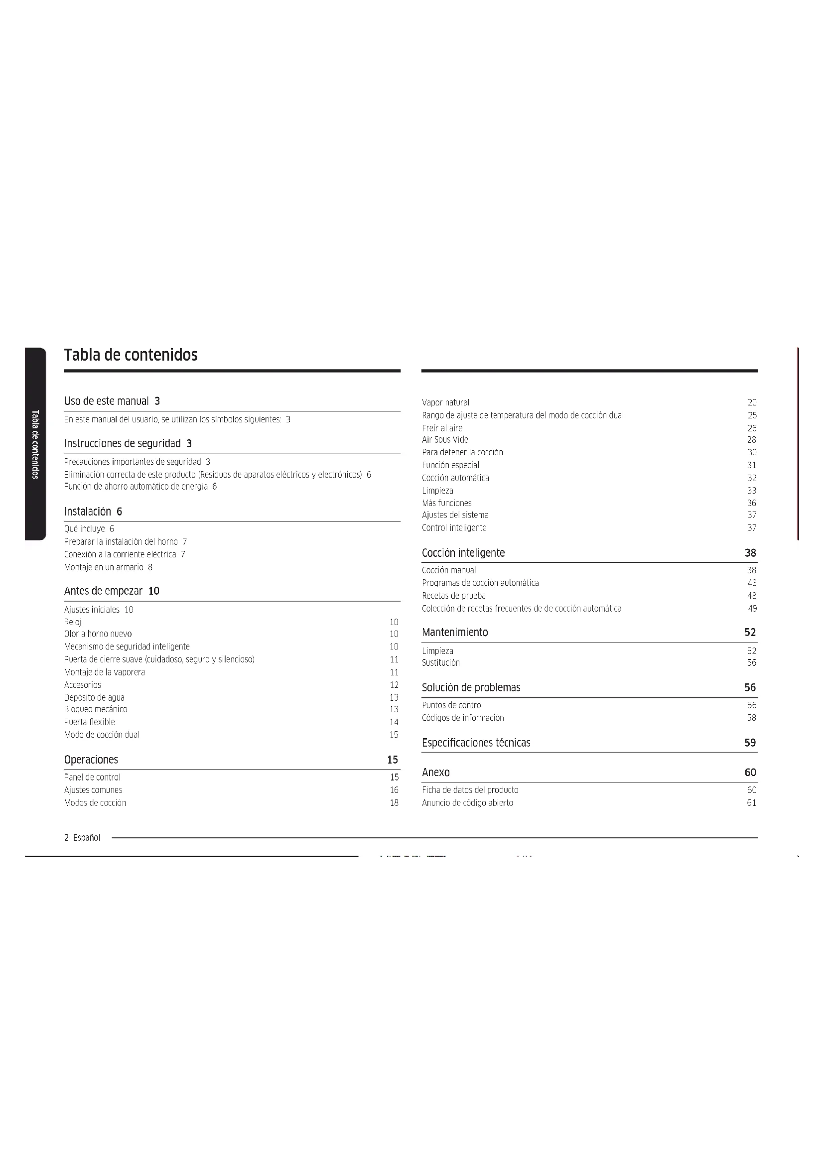 Horno empotrable Manual del usuario y de instalación NV7B564**** / NV7B565**** / NV7B566**** / NV7B567**** / NV7B568**** / NV7B564**C* / NV7B566**C* / NV7B568**C* / NV7B574**** / NV7B575**** / NV7B576**** / NV7B577**** / NV7B578****2 Español Tabla de contenidos Tabla de contenidos Uso de este manual 3 En este manual del usuario, se utilizan los símbolos siguientes: 3 Instrucciones de seguridad 3 Precauciones importantes de seguridad 3 Eliminación correcta de este producto (Residuos de aparatos eléctricos y electrónicos) 6 Función de ahorro automático de energía 6 Instalación 6 Qué incluye 6 Preparar la instalación del horno 7 Conexión a la corriente eléctrica 7 Montaje en un armario 8 Antes de empezar 10 Ajustes iniciales 10 Reloj 10 Olor a horno nuevo 10 Mecanismo de seguridad inteligente 10 Puerta de cierre suave (cuidadoso, seguro y silencioso) 11 Montaje de la vaporera 11 Accesorios 12 Depósito de agua 13 Bloqueo mecánico 13 Puerta exible 14 Modo de cocción dual 15 Operaciones 15 Panel de control 15 Ajustes comunes 16 Modos de cocción 18 Vapor natural 20 Rango de ajuste de temperatura del modo de cocción dual 25 Freír al aire 26 Air Sous Vide 28 Para detener la cocción 30 Función especial 31 Cocción automática 32 Limpieza 33 Más funciones 36 Ajustes del sistema 37 Control inteligente 37 Cocción inteligente 38 Cocción manual 38 Programas de cocción automática 43 Recetas de prueba 48 Colección de recetas frecuentes de de cocción automática 49 Mantenimiento 52 Limpieza 52 Sustitución 56 Solución de problemas 56 Puntos de control 56 Códigos de información 58 Especicaciones técnicas 59 Anexo 60 Ficha de datos del producto 60 Anuncio de código abierto 61Español 3 Uso de este manual Uso de este manual Gracias por elegir un horno empotrable SAMSUNG. Este manual del usuario contiene información de seguridad importante e instrucciones cuyo propósito es ayudar al usuario a hacer funcionar y a realizar el mantenimiento del electrodoméstico. Antes de usar el horno, lea atentamente el presente manual del usuario y guárdelo para consultas posteriores. En este manual del usuario, se utilizan los símbolos siguientes: ADVERTENCIA Riesgos o prácticas no seguras que pueden provocar lesiones graves, muerte o daños materiales. PRECAUCIÓN Riesgos o prácticas no seguras que pueden provocar lesiones o daños materiales. NOTA Información, consejos y recomendaciones útiles que ayudan a los usuarios a utilizar el producto. Instrucciones de seguridad La instalación de este horno la debe realizar únicamente un técnico electricista autorizado. El instalador es el responsable de la conexión del electrodoméstico a la corriente eléctrica, de acuerdo con las recomendaciones de seguridad pertinentes.