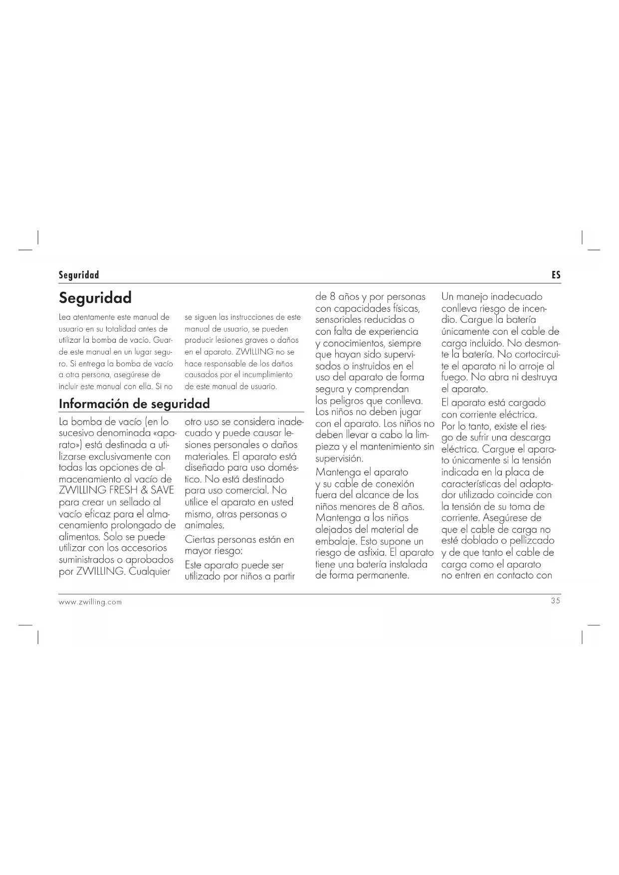 Seguridad Lea atentamente este manual de usuario en su totalidad antes de utilizar la bomba de vacío. Guar- de este manual en un lugar segu- ro. Si entrega la bomba de vacío a otra persona, asegúrese de incluir este manual con ella. Si no se siguen las instrucciones de este manual de usuario, se pueden producir lesiones graves odaños en el aparato. ZWILLING no se hace responsable de los daños causados por el incumplimiento de este manual de usuario. Información de seguridad La bomba de vacío (en lo sucesivo denominada «apa- rato») está destinada a uti- lizarse exclusivamente con todas las opciones deal- macenamiento al vacío de