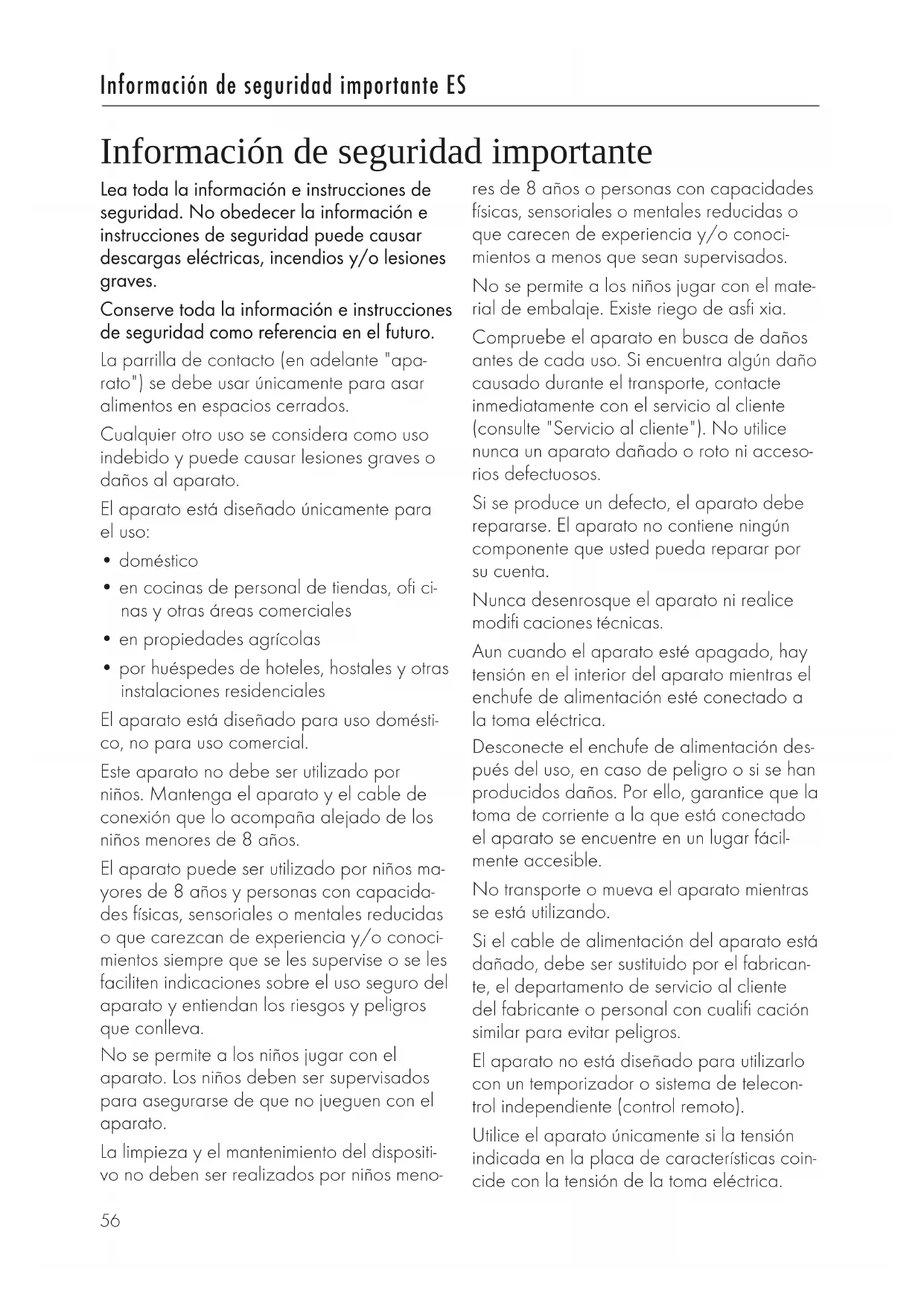 - por huéspedes de hoteles, hostales y otras instalaciones residenciales El aparato está diseñado para uso domésti- co, no para uso comercial. Este aparato no debe ser utilizado por niños. Mantenga el aparato y el cable de conexión que lo acompaña alejado de los niños menores de 8 años. El aparato puede ser utilizado por niños ma- yores de 8 años y personas con capacida- des físicas, sensoriales o mentales reducidas o que carezcan de experiencia y/o conoci- mientos siempre que se les supervise o se les faciliten indicaciones sobre el uso seguro del aparato y entiendan los riesgos y peligros que conlleva. No se permite a los niños jugar con el aparato. Los niños deben ser supervisados para asegurarse de que no jueguen con el aparato. La limpieza y el mantenimiento del dispositi- vo no deben ser realizados por niños meno- Información de seguridad importante res de 8 años o personas con capacidades físicas, sensoriales o mentales reducidas o que carecen de experiencia y/o conoci- mientos a menos que sean supervisados. No se permite a los niños jugar con el mate- rial de embalaje. Existe riego de asfi xia. Compruebe el aparato en busca de daños antes de cada uso. Si encuentra algún daño causado durante el transporte, contacte inmediatamente con el servicio al cliente (consulte "Servicio al cliente"). No utilice nunca un aparato dañado o roto ni acceso- rios defectuosos. Si se produce un defecto, el aparato debe repararse. El aparato no contiene ningún componente que usted pueda reparar por su cuenta. Nunca desenrosque el aparato ni realice modifi caciones técnicas. Aun cuando el aparato esté apagado, hay tensión en el interior del aparato mientras el enchufe de alimentación esté conectado a la toma eléctrica. Desconecte el enchufe de alimentación des- pués del uso, en caso de peligro o si se han producidos daños. Por ello, garantice que la toma de corriente a la que está conectado el aparato se encuentre en un lugar fácil- mente accesible. No transporte o mueva el aparato mientras se está utilizando. Si el cable de alimentación del aparato está dañado, debe ser sustituido por el fabrican- te, el departamento de servicio al cliente del fabricante o personal con cualifi cación similar para evitar peligros. El aparato no está diseñado para utilizarlo con un temporizador o sistema de telecon- trol independiente (control remoto). Utilice el aparato únicamente si la tensión indicada en la placa de características coin- cide con la tensión de la toma eléctrica. ES57 Información de seguridad importante ES Coloque el aparato sobre una superficie antideslizante, nivelada y seca. No coloque el aparato sobre una superficie caliente o cerca de fuentes de calor intenso. No utilice el aparato en el exterior o en es- pacios con alta humedad en el aire. No haga funcionar el aparato dentro de un armario. No haga funcionar el aparato sin la placa de parrilla. La comida a la parrilla puede quemarse. No utilice nunca el aparato cerca o debajo de materiales combustibles (por ejemplo, cortinas o armarios colgantes). El área sobre el aparato debe estar siempre despejada y sin obstáculos. No haga funcionar nunca el aparato cerca de materiales combustibles que sean alta- mente inflamables, como gasolina o alcohol. No coloque el aparato sobre superficies que sean altamente inflamables (por ejem- plo, servilletas de papel). Las superficies del aparato pueden calentar- se mucho. Utilice siempre el asa o, si es ne- cesario, trapos o guantes resistentes al calor. La superficie exterior del aparato puede ca- lentarse mucho mientras el aparato esté en funcionamiento. Utilice siempre el asao, si es necesario, guantes para horno. Desconecte el enchufe de alimentación de la toma de corriente cuando no supervise el aparato. No deje desatendido el aparato durante el asado. Apague el aparato y desconecte el enchufe de alimentación de la toma de corriente an- tes de limpiarlo o realizar el mantenimiento. No toque nunca el cable de alimentación con las manos mojadas. No toque el apa- rato con las manos mojadas cuando esté en funcionamiento o esté colocado sobre una superficie mojada. Cuando desconecte el enchufe de alimen- tación de la toma de corriente, tire siempre directamente del enchufe de alimentación. No transporte el aparato por el cable. Asegúrese de que el cable de alimentación no se doble ni se quede atrapado, y de que el aparato ni el cable de alimentación entren en contacto con fuentes de calor (por ejemplo, las placas o las llamas de los quemadores). No permita que el cable de alimentación cuelgue libremente. Guarde el cable en el compartimento para el cable en la parte inferior del aparato después de usarlo. Retire o cambie las placas de la parrilla so- lamente cuando el aparato se haya enfriado completamente. No sumerja nunca el aparato en agua ni otros líquidos, no lo limpie bajo agua co- rriente ni lo coloque en el lavavajillas. No vierta agua fría ni líquidos inflamables sobre las placas de parrilla calientes. Transporte y limpie el aparato solamente después de que se haya enfriado comple- tamente. No utilice utensilios de limpieza rígidos para limpiar el aparato, como estropajos de acero, ni productos de limpieza abrasivos o agresivos. Antes de guardar el aparato: Desconecte el enchufe de alimentación y deje que el apa- rato se enfríe completamente. Guarde el aparato en un lugar fresco y seco fuera del alcance de los niños y mascotas.58 Información de seguridad importante ES Símbolos usados Lea atentamente el manual de instrucciones y consérvelo como referencia en el futuro. ¡PRECAUCIÓN! Posible riesgo de accidentes, lesiones y daños materiales graves. Riesgo de quemaduras debido a superficies calientes No utilice el aparato en el exterior ni en un ambiente húmedo. Clase de protección I El aparato cumple con las directivas de marcado CE. Datos técnicos Alimentación 220–240V, 50–60Hz Potencia de salida 2000W Potencia de salida en