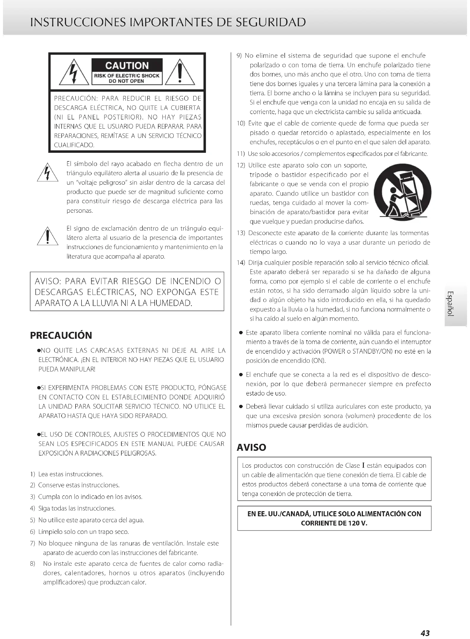 dores, calentadores, hornos u otros aparatos (incluyendo amplificadores) que produzcan calor.9) No elimine el sistema de seguridad que supone el enchufe polarizado o con toma de tierra. Un enchufe polarizado tiene dos bornes, uno más ancho que el otro. Uno con toma de tierra tiene dos bornes iguales y una tercera lámina para la conexión a tierra. El borne ancho o la lámina se incluyen para su seguridad. Si el enchufe que venga con la unidad no encaja en su salida de corriente, haga que un electricista cambie su salida anticuada.10) Evite que el cable de corriente quede de forma que pueda ser pisado o quedar retorcido o aplastado, especialmente en los enchufes, receptáculos o en el punto en el que salen del aparato.11) Use solo accesorios / complementos especificados por el fabricante.12) Utilice este aparato solo con un soporte, trípode o bastidor especificado por el fabricante o que se venda con el propio aparato. Cuando utilice un bastidor con ruedas, tenga cuidado al mover la com-binación de aparato/bastidor para evitar que vuelque y puedan producirse daños.13) Desconecte este aparato de la corriente durante las tormentas eléctricas o cuando no lo vaya a usar durante un periodo de tiempo largo.14) Dirija cualquier posible reparación solo al servicio técnico oficial. Este aparato deberá ser reparado si se ha dañado de alguna forma, como por ejemplo si el cable de corriente o el enchufe están rotos, si ha sido derramado algún líquido sobre la uni-dad o algún objeto ha sido introducido en ella, si ha quedado expuesto a la lluvia o la humedad, si no funciona normalmente o si ha caído al suelo en algún momento. o Este aparato libera corriente nominal no válida para el funciona- miento a través de la toma de corriente, aún cuando el interruptor de encendido y activación (POWER o STANDBY/ON) no esté en la posición de encendido (ON). o El enchufe que se conecta a la red es el dispositivo de desco- nexión, por lo que deberá permanecer siempre en prefecto estado de uso. o Deberá llevar cuidado si utiliza auriculares con este producto, ya que una excesiva presión sonora (volumen) procedente de los mismos puede causar perdidas de audición. AVISO Los productos con construcción de Clase ! están equipados con un cable de alimentación que tiene conexión de tierra. El cable de estos productos deberá conectarse a una toma de corriente que tenga conexión de protección de tierra.EN EE. UU./CANADÁ, UTILICE SOLO ALIMENTACIÓN CON CORRIENTE DE 120 V.44 INSTRUCCIONES IMPORTANTES DE SEGURIDAD (continuación) PRECAUCIÓN o No exponga este aparato a salpicaduras ni goteras. o No coloque objetos que contengan líquidos, como por ejem- plo jarrones, sobre el aparato. o No instale este aparato en lugares cerrados tales como estan- terías o similares. o Este aparato debe situarse lo suficientemente cerca de una toma de electricidad como para poder alcanzar fácilmente el cable de corriente en cualquier momento. o Si el producto utiliza pilas (esto incluye las pilas instaladas y los “packs” de pilas), se evitará su exposición directa al sol, al fuego o a cualquier otra fuente de calor excesivo. o PRECAUCIÓN con los productos que emplean baterías de litio reemplazables: existe peligro de explosión si la batería se reemplaza por otra de tipo incorrecto. Reemplácela sólo por otra igual o de tipo equivalente. Modelo para EE. UU. Este dispositivo cumple con el apartado 15 de las Normas de la FCC. Su funcionamiento está sujeto a las dos siguientes con- diciones: (1) este dispositivo no puede causar interferencias perjudiciales y (2) este dispositivo debe aceptar cualquier inter- ferencia recibida, incluidas interferencias que puedan causar anomalías de funcionamiento. Se ha comprobado que este equipo cumple con los límites esta- blecidos para los dispositivos digitales de Clase B, de acuerdo con el apartado 15 de las Normas de la FCC. Estos límites están diseñados para proporcionar una protección razonable contra interferencias perjudiciales en instalaciones residenciales. Este equipo genera, utiliza y puede irradiar energía de radiofrecuencia y, si no se instala y se utiliza de acuerdo con las instrucciones, puede causar interferencias perjudiciales en las comunicaciones por radio. Sin embargo, no se puede garantizar que dichas inter- ferencias no se produzcan en instalaciones particulares. Si este equipo causa interferencias perjudiciales en la recepción de radio o televisión, que se comprueban apagando y encendiendo el equipo, se recomienda al usuario que intente corregirla mediante una o varias de las siguientes medidas: