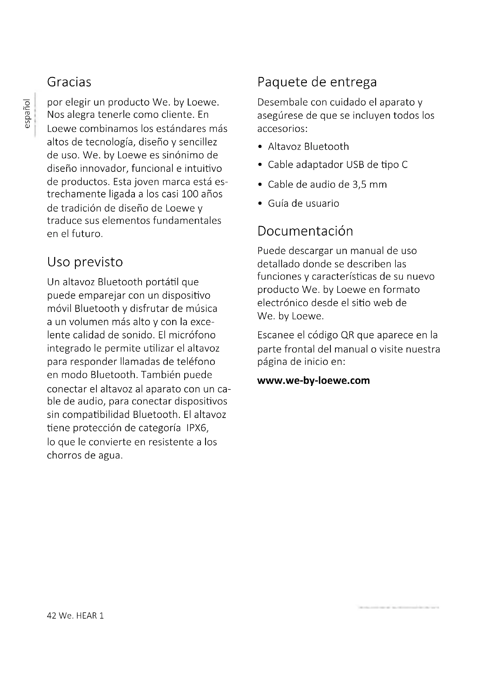 dor luminoso se apagará. 9 Protección IPX6 contra la entrada de agua Este disposivo ene protección de categoría IPX6, lo que signica que los chorros de agua no afectarán al altavoz. Para que la protección sea efecva, no puede haber disposivos externos conectados al altavoz a través de cables (como un teléfono a través de un cable de audio o un cargador a través de un cable USB) y el comparmento del co- nector debe estar rmemente sellado.48 We. HEAR 1 español Resolución de problemas Si el disposivo fallara, le recomendamos que compruebe la lista siguiente antes de llamar a la línea de asistencia. Problema Posible causa Corrección/observaciones No se puede encender al altavoz. El nivel de la batería es muy bajo. Cargue el altavoz. El altavoz tarda demasiado en cargarse. El cargado USB suministra corriente demasiado baja. Ulice un cargador USB de 5V/2A. El altavoz no reproduce ningún sonido. a. El volumen es demasiado bajo o no se oye nada. b. No hay ningún disposivo emparejado con el dis- posivo. a. Pulse el botón de volumen (+) varias veces o aumente el volumen del disposivo. b. Empareje y conecte su disposivo Bluetooth. El sonido se oye distorsionado. a. El disposivo Bluetooth está demasiado lejos del altavoz. b. Existe interferencia inalámbrica. a. Acerque el disposivo al altavoz. b. Aleje el altavoz de otros disposivos inalámbricos. Datos técnicos Tipo de aparato de We. by Loewe: We. HEAR 1 Número de pieza: 60701x10 Tipo de batería: Ión litio integrada de 7,4V/2000mAh Corriente de carga: 5V/2A Tiempo de reproducción: 12 – 14 h Tiempo de carga: 2 – 3 h Unidad del altavoz 2x 10 W RMS Protección contra la entrada de agua IPX6 Versión Bluetooth V5.0 Potencia/rango de frecuencias Bluetooth: Potencia máxima <10 mW a 2402 - 2480 MHz Protocolos Bluetooth: A2DP, AVRCP Dimensiones del aparato (An x Al x Pr) 90 x 220 x 83 mm Peso del aparato: 0,74 kg Temperatura ambiente: 0 °C - 40 °C Humedad relativa (%) (sin condensación): Del 20 al 70%We. HEAR 1 49 español50 We. HEAR 1 português Obrigado por ter escolhido um produto We. by Loewe. Alegramo-nos por tê-lo como cliente. Na Loewe aliamos os mais elevados padrões tecnológicos, o design e a simplicidade. We. by Loewe signi- ca um design de produto inovador, funcional e intuivo. A jovem marca está associada de perto à tradição quase centenária de design da Loewe e transporte os seus elementos essenciais para o futuro. Uso previsto Um alfalante portál Bluetooth que pode emparelhar com um disposivo móvel com Bluetooth e desfrutar da música com um volume mais alto e excelente qualidade do som. O micro- fone incorporado permite-lhe usar o alfalante para atender telefonemas no modo Bluetooth. Há também a opção de ligar o alfalante ao disposivo com um cabo de áudio, o que pode ser úl para ligar disposivos sem Bluetooth. O alfalante está protegido por IPX6, o que o torna resistente a jatos fortes de água. Conteúdo da encomenda Desembale o disposivo com cuidado e cerque-se de que todos os acessórios estão presentes: