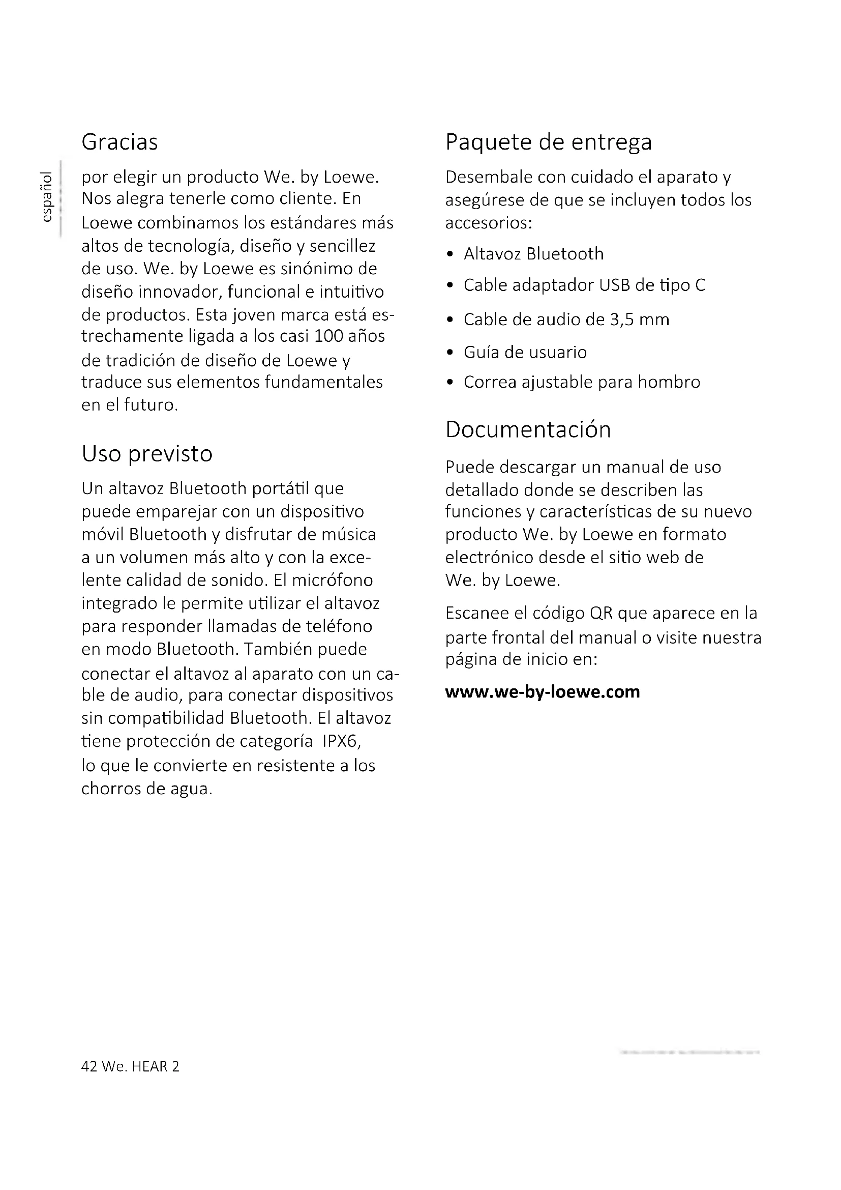 dor luminoso se apagará. 9 Protección IPX6 contra la entrada de agua Este disposivo ene protección de categoría IPX6, lo que signica que los chorros de agua no afectarán al altavoz. Para que la protección sea efecva, no puede haber disposivos externos conectados al altavoz a través de cables (como un teléfono a través de un cable de audio o un cargador a través de un cable USB) y el comparmento del co- nector debe estar rmemente sellado.48 We. HEAR 2 español Resolución de problemas Si el disposivo fallara, le recomendamos que compruebe la lista siguiente antes de llamar a la línea de asistencia. Problema Posible causa Corrección/observaciones No se puede encender al altavoz. El nivel de la batería es muy bajo. Cargue el altavoz. El altavoz tarda demasiado en cargarse. El cargado USB suministra corriente demasiado baja. Ulice un cargador USB de 5V/2A. El altavoz no reproduce ningún sonido. a. El volumen es demasiado bajo o no se oye nada. b. No hay ningún disposivo emparejado con el dis- posivo. a. Pulse el botón de volumen (+) varias veces o aumente el volumen del disposivo. b. Empareje y conecte su disposivo Bluetooth. El sonido se oye distorsionado. a. El disposivo Bluetooth está demasiado lejos del altavoz. b. Existe interferencia inalámbrica. a. Acerque el disposivo al altavoz. b. Aleje el altavoz de otros disposivos inalámbricos. Datos técnicos Tipo de aparato de We. by Loewe: We. HEAR 2 Número de pieza: 60702x10 Tipo de batería: Ión litio integrada de 7,4V/4000mAh Corriente de carga: 5V/2A Tiempo de reproducción: 15 – 17 h Tiempo de carga: 4 – 5 h Unidad del altavoz 2x 15 W RMS Protección contra la entrada de agua IPX6 Versión Bluetooth V5.0 Potencia/rango de frecuencias Bluetooth: Potencia máxima <10 mW a 2402 - 2480 MHz Protocolos Bluetooth: A2DP, AVRCP Dimensiones del aparato (An x Al x Pr) 118 x 290 x 112 mm Peso del aparato: 2 kg Temperatura ambiente: 0 °C - 40 °C Humedad relativa (%) (sin condensación): Del 20 al 70%We. HEAR 2 49 español50 We. HEAR 2 português Obrigado por ter escolhido um produto We. by Loewe. Alegramo-nos por tê-lo como cliente. Na Loewe aliamos os mais elevados padrões tecnológicos, o design e a simplicidade. We. by Loewe signi- ca um design de produto inovador, funcional e intuivo. A jovem marca está associada de perto à tradição quase centenária de design da Loewe e transporte os seus elementos essenciais para o futuro. Uso previsto Um alfalante portál Bluetooth que pode emparelhar com um disposivo móvel com Bluetooth e desfrutar da música com um volume mais alto e excelente qualidade do som. O micro- fone incorporado permite-lhe usar o alfalante para atender telefonemas no modo Bluetooth. Há também a opção de ligar o alfalante ao disposivo com um cabo de áudio, o que pode ser úl para ligar disposivos sem Bluetooth. O alfalante está protegido por IPX6, o que o torna resistente a jatos fortes de água. Conteúdo da encomenda Desembale o disposivo com cuidado e cerque-se de que todos os acessórios estão presentes:
