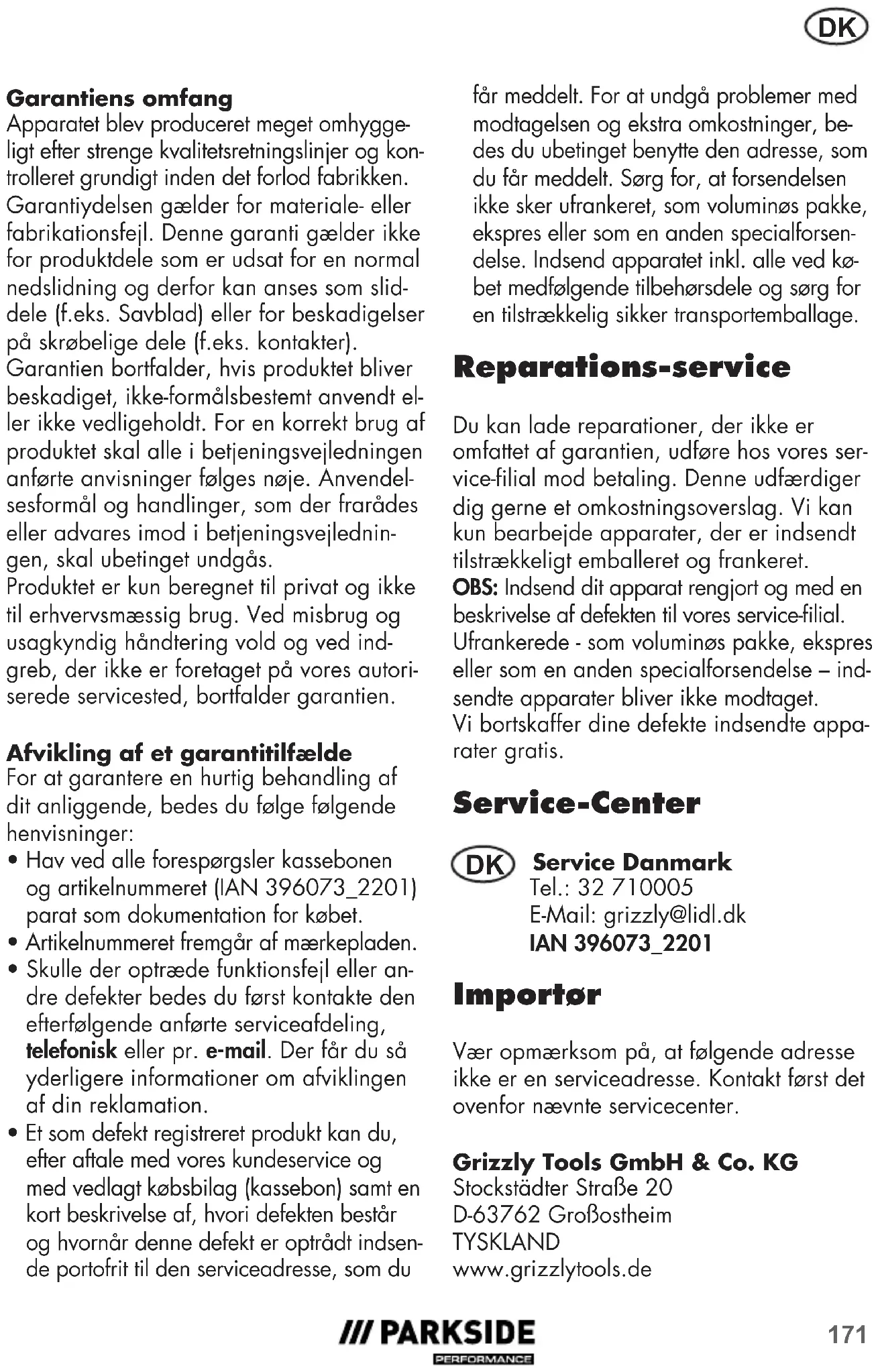 Servicio España Tel.:900984989 E-Mail:grizzly@lidl.es IAN 396073_2201 Importador Por favor, observe que la siguiente direc- ciónnoesunadireccióndeservicio.Con- tacte primeramente al centro de servicio mencionado arriba. Grizzly Tools GmbH & Co. KG StockstädterStraße20 63762 Großostheim ALEMANIA www.grizzlytools.deIT MT