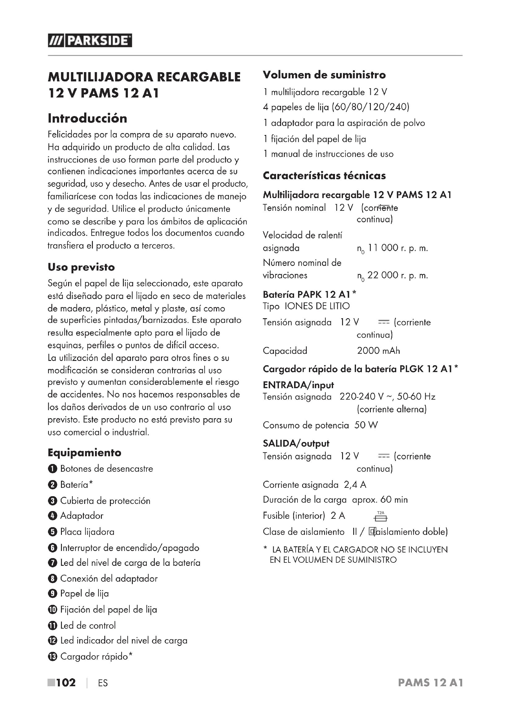 Introducción Felicidades por la compra de su aparato nuevo. Ha adquirido un producto de alta calidad. Las instrucciones de uso forman parte del producto y contienen indicaciones importantes acerca de su seguridad, uso y desecho. Antes de usar el producto, familiarícese con todas las indicaciones de manejo y de seguridad. Utilice el producto únicamente como se describe y para los ámbitos de aplicación indicados. Entregue todos los documentos cuando transfiera el producto a terceros. Uso previsto Según el papel de lija seleccionado, este aparato está diseñado para el lijado en seco de materiales de madera, plástico, metal y plaste, así como de superficies pintadas/barnizadas. Este aparato resulta especialmente apto para el lijado de esquinas, perfiles o puntos de difícil acceso. La utilización del aparato para otros fines o su modificación se consideran contrarias al uso previsto y aumentan considerablemente el riesgo de accidentes. No nos hacemos responsables de los daños derivados de un uso contrario al uso previsto. Este producto no está previsto para su uso comercial o industrial. Equipamiento 1 Botones de desencastre 2 Batería* 3 Cubierta de protección 4 Adaptador 5 Placa lijadora 6 Interruptor de encendido/apagado 7 Led del nivel de carga de la batería 8 Conexión del adaptador 9 Papel de lija 0 Fijación del papel de lija q Led de control w Led indicador del nivel de carga e Cargador rápido* Volumen de suministro 1 multilijadora recargable 12 V 4 papeles de lija (60/80/120/240) 1 adaptador para la aspiración de polvo 1 fijación del papel de lija 1manual de instrucciones de uso Características técnicas Multilijadora recargable 12 V PAMS 12 A1 Tensión nominal 12V (corriente continua) Velocidad de ralentí asignada n