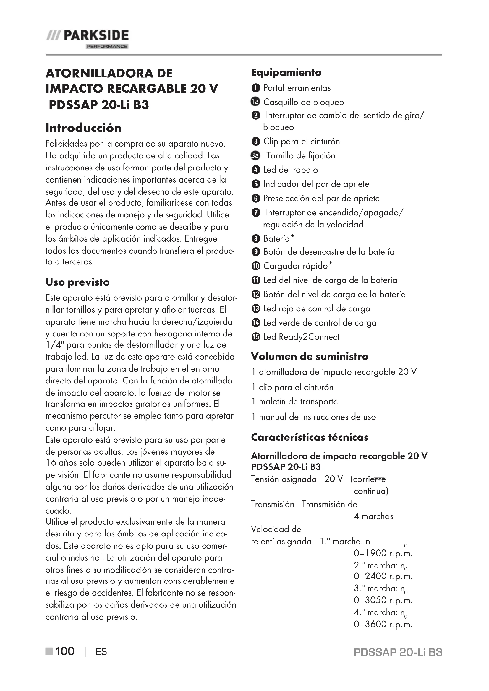 PDSSAP 20-Li B3 Introducción Felicidades por la compra de su aparato nuevo. Ha adquirido un producto de alta calidad. Las instrucciones de uso forman parte del producto y contienen indicaciones importantes acerca de la seguridad, del uso y del desecho de este aparato. Antes de usar el producto, familiarícese con todas las indicaciones de manejo y de seguridad. Utilice el producto únicamente como se describe y para los ámbitos de aplicación indicados. Entregue todos los documentos cuando transfiera el produc- to a terceros. Uso previsto Este aparato está previsto para atornillar y desator- nillar tornillos y para apretar y aflojar tuercas. El aparato tiene marcha hacia la derecha/izquierda y cuenta con un soporte con hexágono interno de 1/4" para puntas de destornillador y una luz de trabajo led. La luz de este aparato está concebida para iluminar la zona de trabajo en el entorno directo del aparato. Con la función de atornillado de impacto del aparato, la fuerza del motor se transforma en impactos giratorios uniformes. El mecanismo percutor se emplea tanto para apretar como para aflojar. Este aparato está previsto para su uso por parte de personas adultas. Los jóvenes mayores de 16años solo pueden utilizar el aparato bajo su- pervisión. El fabricante no asume responsabilidad alguna por los daños derivados de una utilización contraria al uso previsto o por un manejo inade- cuado. Utilice el producto exclusivamente de la manera descrita y para los ámbitos de aplicación indica- dos. Este aparato no es apto para su uso comer- cial o industrial. La utilización del aparato para otros fines o su modificación se consideran contra- rias al uso previsto y aumentan considerablemente el riesgo de accidentes. El fabricante no se respon- sabiliza por los daños derivados de una utilización contraria al uso previsto. Equipamiento 1 Portaherramientas