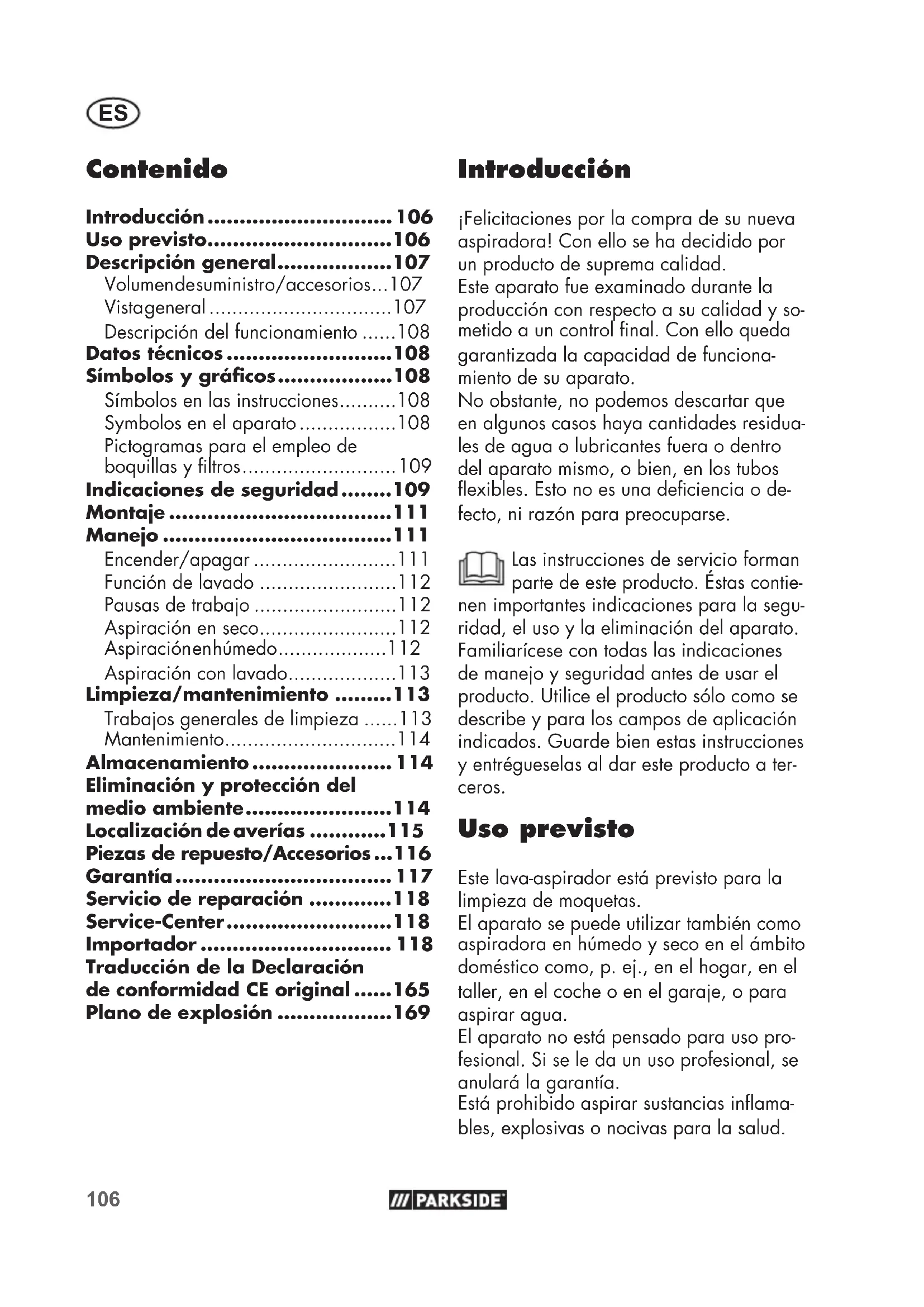 - Introducción ¡Felicitaciones por la compra de su nueva aspiradora! Con ello se ha decidido por un producto de suprema calidad. Este aparato fue examinado durante la producción con respecto a su calidad y so- metido a un control nal. Con ello queda garantizada la capacidad de funciona- miento de su aparato. No obstante, no podemos descartar que en algunos casos haya cantidades residua- les de agua o lubricantes fuera o dentro del aparato mismo, o bien, en los tubos exibles. Esto no es una deciencia o de- fecto, ni razón para preocuparse. Las instrucciones de servicio forman parte de este producto. Éstas contie- nen importantes indicaciones para la segu- ridad, el uso y la eliminación del aparato. Familiarícese con todas las indicaciones de manejo y seguridad antes de usar el producto. Utilice el producto sólo como se describe y para los campos de aplicación indicados. Guarde bien estas instrucciones y entrégueselas al dar este producto a ter- ceros. Uso previsto Este lava-aspirador está previsto para la limpieza de moquetas. El aparato se puede utilizar también como aspiradora en húmedo y seco en el ámbito doméstico como, p.ej., en el hogar, en el taller, en el coche o en el garaje, o para aspirar agua. El aparato no está pensado para uso pro- fesional. Si se le da un uso profesional, se anulará la garantía. Está prohibido aspirar sustancias inama- bles, explosivas o nocivas para la salud. Traducción de la Declaración de conformidad CE original p. 165