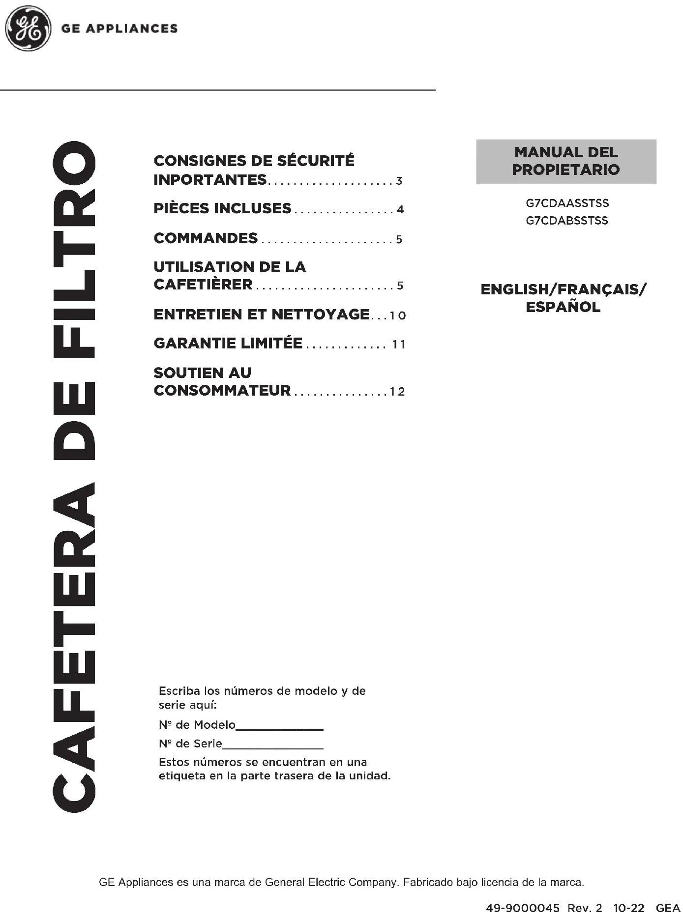 SOUTIEN AU CONSOMMATEUR ...............12 MANUAL DEL PROPIETARIO Escriba los números de modelo y de serie aquí: Nº de Modelo_____________ Nº de Serie_______________ Estos números se encuentran en una etiqueta en la parte trasera de la unidad. GE Appliances es una marca de General Electric Company. Fabricado bajo licencia de la marca.2 49-9000045 Rev. 2 GRACIAS POR HACER A GE APPLIANCES PARTE DE SU HOGAR Ya sea que haya crecido con GE Appliances, o que ésta sea su primera vez, estamos felices de tenerlo en la familia. Sentimos orgullo por la creación, innovación y diseño de cada producto de GE Appliances, y creemos que usted también. Entre otras cosas, el registro de su electrodoméstico nos asegura que podamos entregarle información importante del producto y detalles de la garantía cuando los necesite.49-9000045 Rev. 2 3