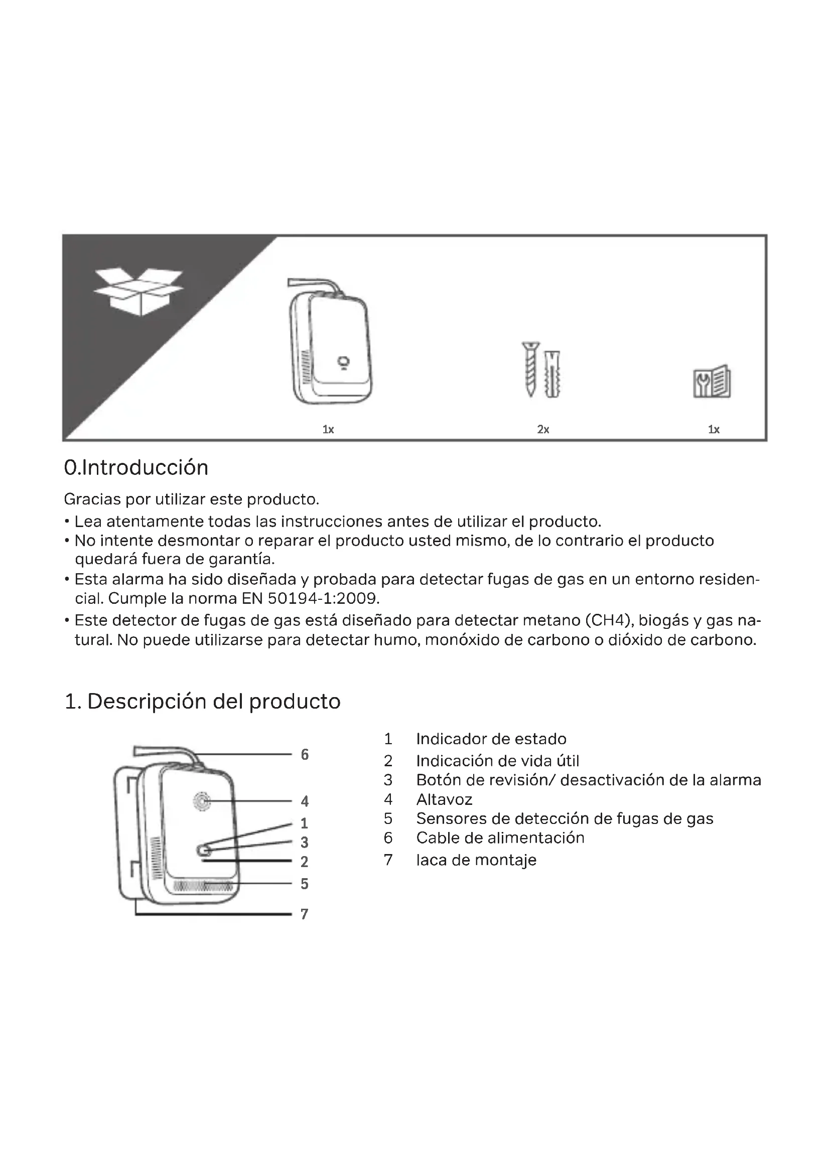 - Esta alarma ha sido diseñada y probada para detectar fugas de gas en un entorno residen- cial. Cumple la norma EN 50194-1:2009.