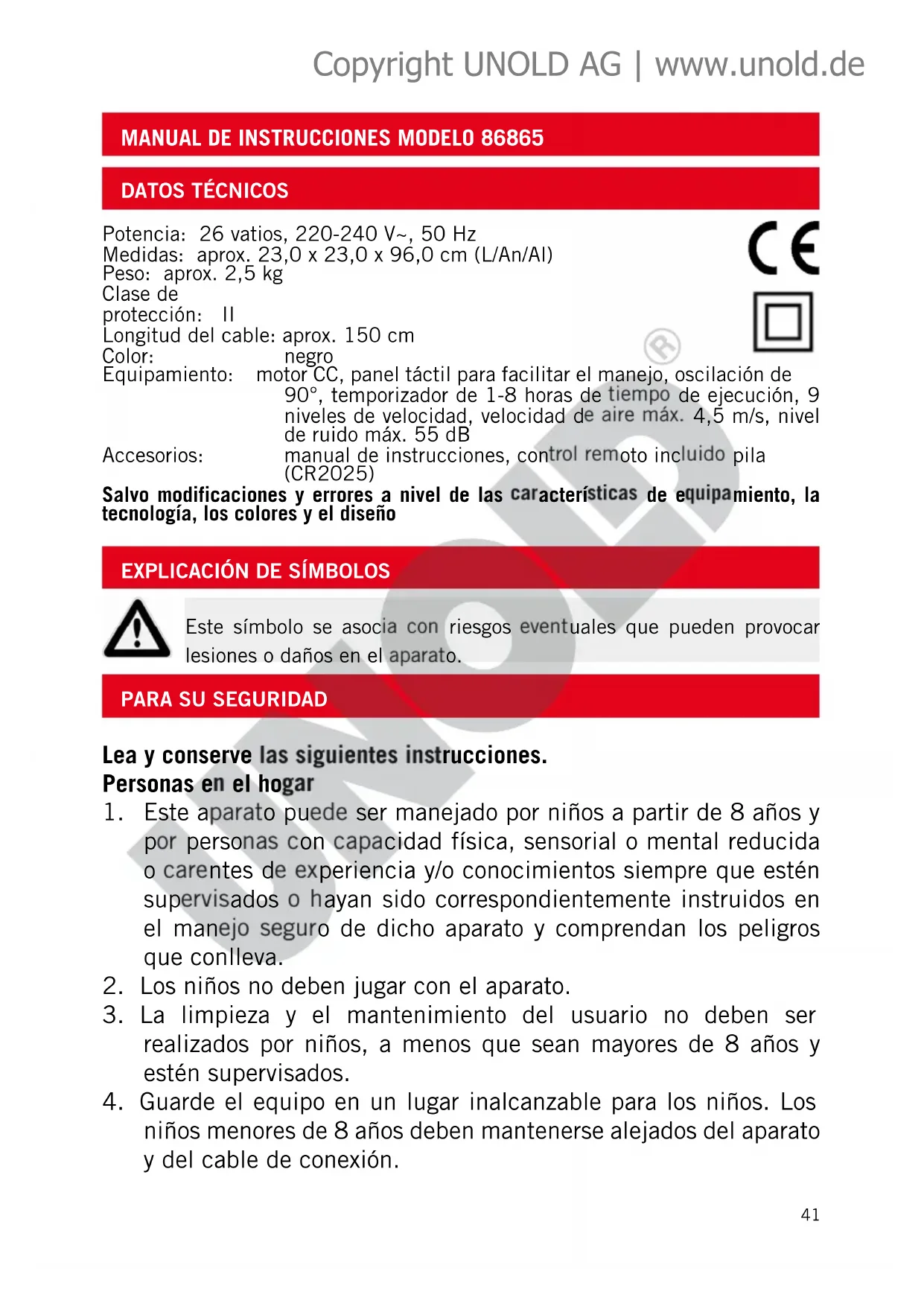 DISPOSICIÓN/PROTECCIÓN DEL MEDIO AMBIENTE Nuestros aparatos se fabrican con un alto nivel de calidad por un largo período de uso. El mantenimiento regular y las reparaciones de tipo técnico a través de nuestro servicio al cliente pueden prolongar la duración del aparato. Cuando un aparato está defectuoso y ya no puede repararse, por favor considere en la disposición final los siguientes puntos: Este producto no puede ser eliminado junto a la basura domiciliaria. Usted debe entregar este producto a un lu- gar oficial para el reciclaje de aparatos eléctricos o electrónicos. Mediante la clasificación por separado y el reciclaje de productos residuales, Usted contribuye a proteger los recursos natu- rales y asegura que el producto sea eliminado de forma salubre y acorde con el medio ambiente. No deseche las pilas agotadas en la basura doméstica. Elimínelas a través de las tiendas de artículos eléctricos o el punto de recogida local correspondiente. La garantía para nuestros equipos es de 24 meses, y de 12 meses en el caso de uso comercial, a partir de la fecha de compra, cubriendo los daños que con un uso acorde a lo prescrito pueden atribuirse fehacientemente a defectos de fabricación. Dentro del período de garantía, solucionamos errores de material y de fabricación a consideración nuestra mediante reparación o cambio. Nuestros servicios de garantía son válidos únicamente para los aparatos que han sido vendidos en Alemania y Austria. Para todos los demás casos diríjase por favor al importador correspondiente. Aquellos aparatos que se presentan para eliminar errores, por favor enviarlos junto a una copia del comprobante de compra extendido a máquina, del cual debe desprenderse la fecha de compra, así como una breve descripción de las deficiencias, apropiadamente embalado y con los sellos corres- pondientes a nuestro servicio al cliente. En caso de garantía, los gastos de envío serán restituidos al cliente solamente en Alemania y Austria. Aquellos daños causados por desgaste están excluidos de la garantía, así como manipulación incorrecta, e incumplimiento de las condiciones de mantenimiento y cuidado. El derecho a garantía expira si las reparaciones o mantenimiento son realizadas por terceros. Todo reclamo del consumidor final ante el vendedor, comerciante no se ve afectado por esta garantía. Copyright UNOLD AG | www.unold.de48 Moc: 26 W, 220-240 V~, 50 Hz Wymiary: ok. 23,0 x 23,0 x 96,0 cm (dł./szer./wys.) Ciężar: ok. 2,5 kg Stopień ochrony: II Długość przewodu: ok. 150 cm Kolor: czarny Wyposażenie: silnik DC, panel dotykowy do łatwej obsługi, oscylacja 90°, timer z czasem przebiegu 1-8 godzin, 9 stopni prędkości, prędkość przepływu powietrza maks. 4,5 m/s, poziom hałasu maks. 55 dB Akcesoria: instrukcja obsługi, pilot z baterią (CR2025) Zmiany i błędy w opisie wyposażenia, technice, kolorach i konstrukcji są zastrzeżone.