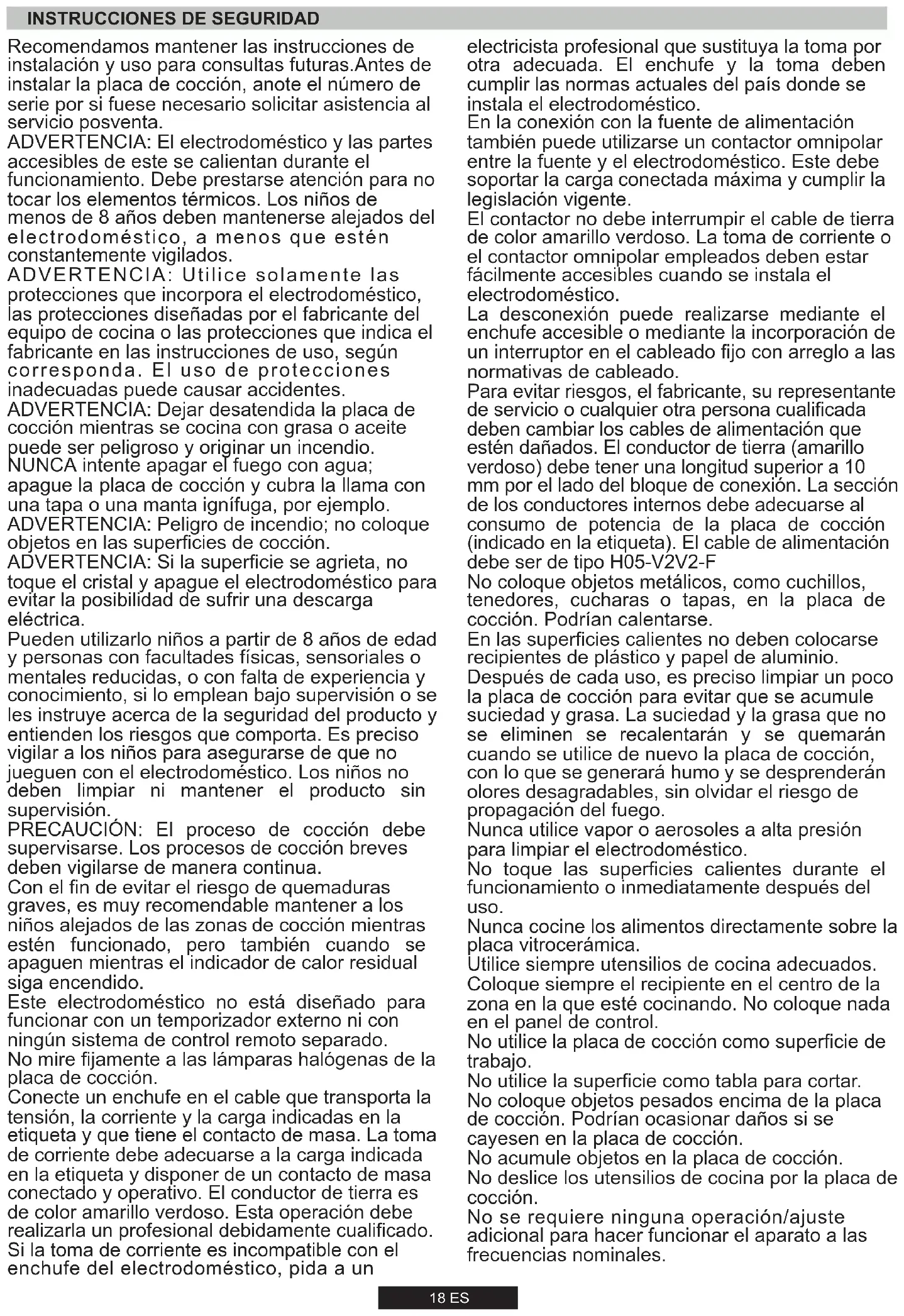 Recomendamos mantener las instrucciones de instalación y uso para consultas futuras.Antes de instalar la placa de cocción, anote el número de serie por si fuese necesario solicitar asistencia al servicio posventa. ADVERTENCIA: El electrodoméstico y las partes accesibles de este se calientan durante el funcionamiento. Debe prestarse atención para no tocar los elementos térmicos. Los niños de menos de 8 años deben mantenerse alejados del electrodoméstico, a menos que estén constantemente vigilados. ADVERTENCIA: Utilice solamente las protecciones que incorpora el electrodoméstico, las protecciones diseñadas por el fabricante del equipo de cocina o las protecciones que indica el fabricante en las instrucciones de uso, según corresponda. El uso de protecciones inadecuadas puede causar accidentes. ADVERTENCIA: Dejar desatendida la placa de cocción mientras se cocina con grasa o aceite puede ser peligroso y originar un incendio. NUNCA intente apagar el fuego con agua; apague la placa de cocción y cubra la llama con una tapa o una manta ignífuga, por ejemplo. ADVERTENCIA: Peligro de incendio; no coloque objetos en las superficies de cocción. ADVERTENCIA: Si la superficie se agrieta, no toque el cristal y apague el electrodoméstico para evitar la posibilidad de sufrir una descarga eléctrica. Pueden utilizarlo niños a partir de 8 años de edad y personas con facultades físicas, sensoriales o mentales reducidas, o con falta de experiencia y conocimiento, si lo emplean bajo supervisión o se les instruye acerca de la seguridad del producto y entienden los riesgos que comporta. Es preciso vigilar a los niños para asegurarse de que no jueguen con el electrodoméstico. Los niños no deben limpiar ni mantener el producto sin supervisión. PRECAUCIÓN: El proceso de cocción debe supervisarse. Los procesos de cocción breves deben vigilarse de manera continua. Con el fin de evitar el riesgo de quemaduras graves, es muy recomendable mantener a los niños alejados de las zonas de cocción mientras estén funcionado, pero también cuando se apaguen mientras el indicador de calor residual siga encendido. Este electrodoméstico no está diseñado para funcionar con un temporizador externo ni con ningún sistema de control remoto separado. No mire fijamente a las lámparas halógenas de la placa de cocción. Conecte un enchufe en el cable que transporta la tensión, la corriente y la carga indicadas en la etiqueta y que tiene el contacto de masa. La toma de corriente debe adecuarse a la carga indicada en la etiqueta y disponer de un contacto de masa conectado y operativo. El conductor de tierra es de color amarillo verdoso. Esta operación debe realizarla un profesional debidamente cualificado. Si la toma de corriente es incompatible con el enchufe del electrodoméstico, pida a un