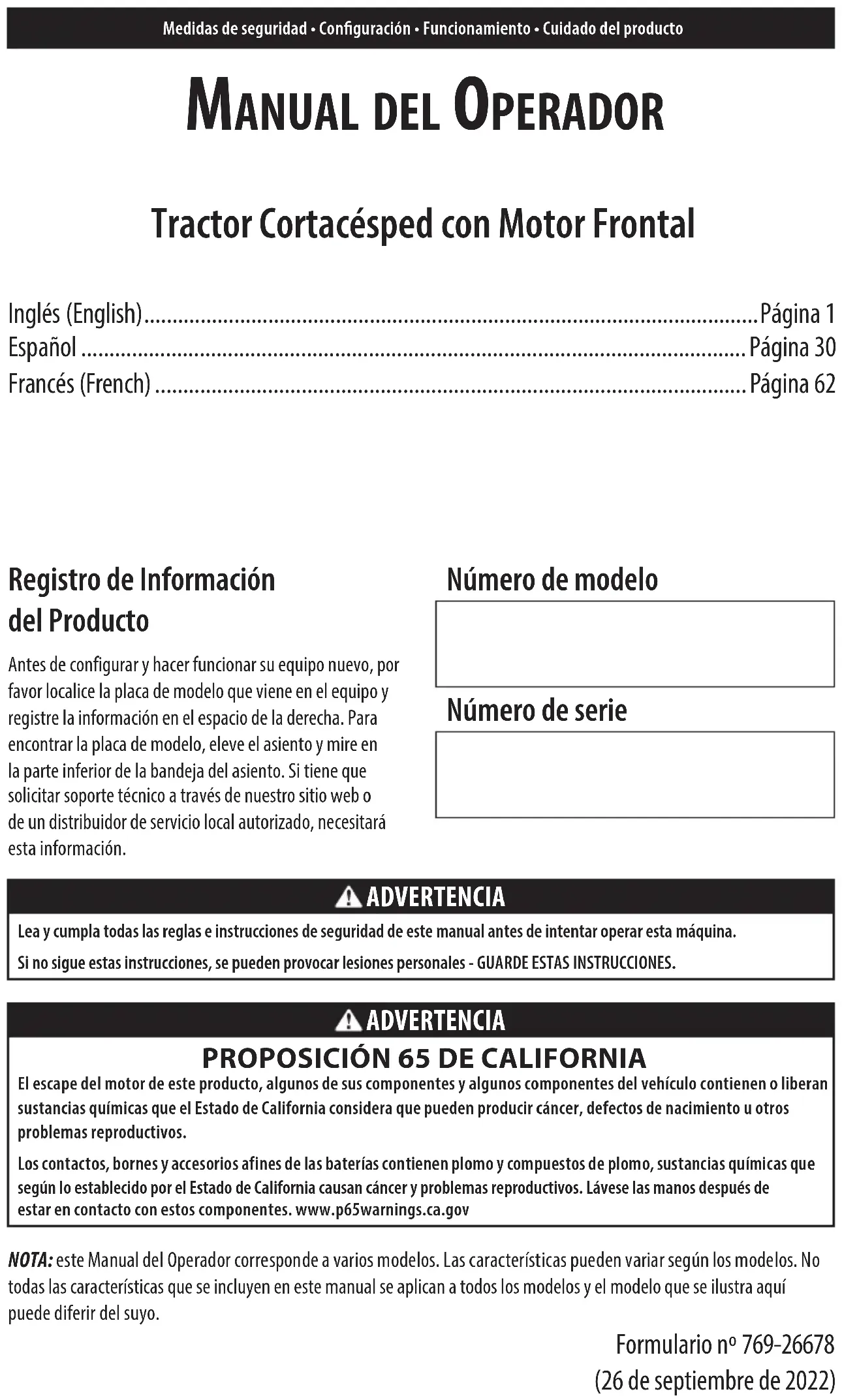 TROUBLESHOOTING WARNING Before performing any type of maintenance/service, disengage all controls and stop the engine. Wait until all moving parts have come to a complete stop. Allow the engine to cool. Disconnect spark plug wire(s) and negative battery cable to prevent unintended starting. Always wear safety glasses during operation or while performing any adjustments or repairs. This section addresses minor service issues. To locate the nearest authorized service center consult the separate supplement sheet for contact information.Manual del OperadOr Tractor Cortacésped con Motor Frontal Inglés (English) .............................................................................................................Página 1 Español ......................................................................................................................Página 30 Francés (French) .........................................................................................................Página 62 Medidas de seguridad • Conguración • Funcionamiento • Cuidado del producto Registro de Información del Producto Antes de configurar y hacer funcionar su equipo nuevo, por favor localice la placa de modelo que viene en el equipo y registre la información en el espacio de la derecha. Para encontrar la placa de modelo, eleve el asiento y mire en la parte inferior de la bandeja del asiento. Si tiene que solicitar soporte técnico a través de nuestro sitio web o de un distribuidor de servicio local autorizado, necesitará esta información. Número de modelo Número de serie ADVERTENCIA Lea y cumpla todas las reglas e instrucciones de seguridad de este manual antes de intentar operar esta máquina. Si no sigue estas instrucciones, se pueden provocar lesiones personales - GUARDE ESTAS INSTRUCCIONES. ADVERTENCIA