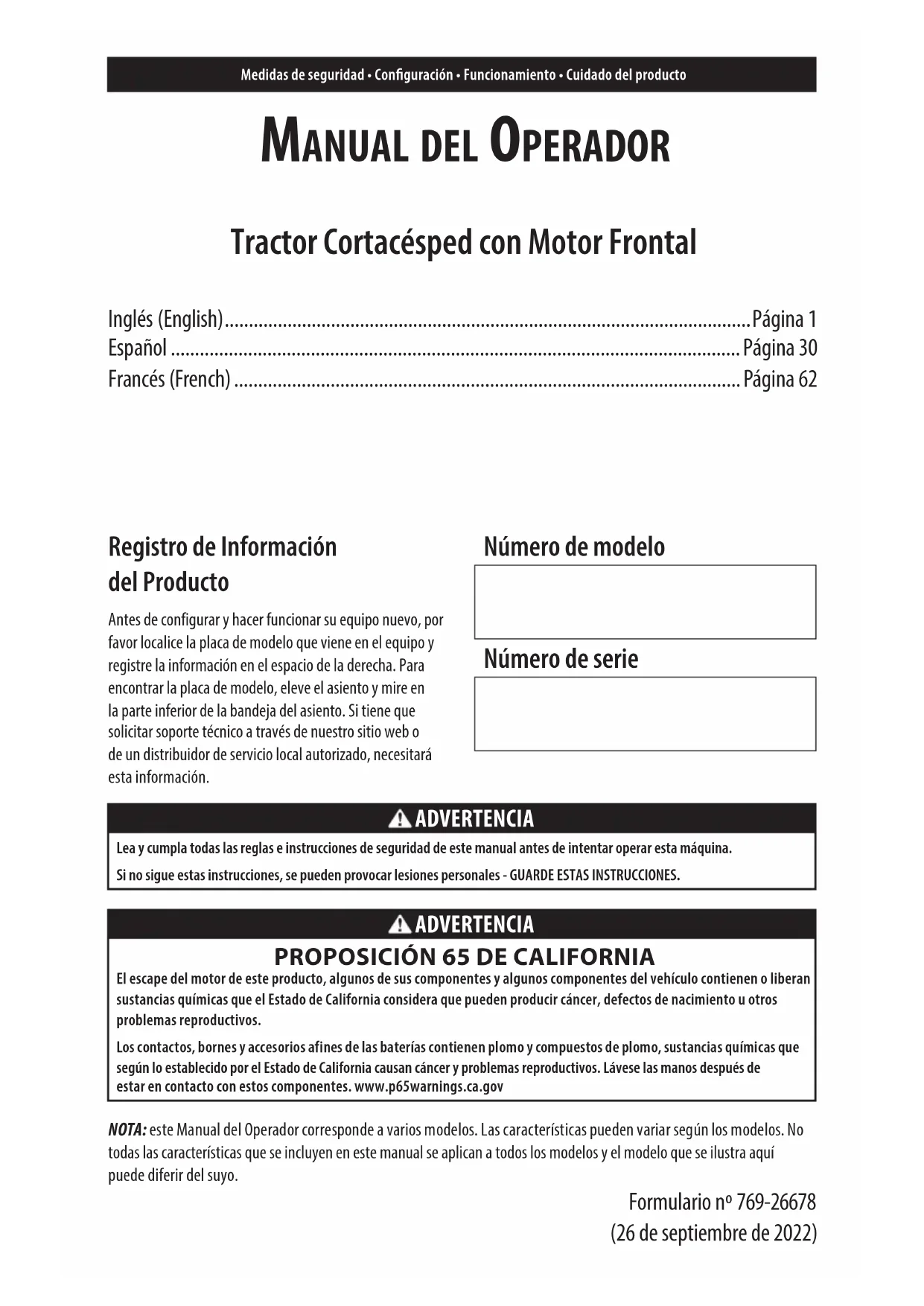 TROUBLESHOOTING WARNING Before performing any type of maintenance/service, disengage all controls and stop the engine. Wait until all moving parts have come to a complete stop. Allow the engine to cool. Disconnect spark plug wire(s) and negative battery cable to prevent unintended starting. Always wear safety glasses during operation or while performing any adjustments or repairs. This section addresses minor service issues. To locate the nearest authorized service center consult the separate supplement sheet for contact information.Manual del OperadOr Tractor Cortacésped con Motor Frontal Inglés (English) .............................................................................................................Página 1 Español ......................................................................................................................Página 30 Francés (French) .........................................................................................................Página 62 Medidas de seguridad • Conguración • Funcionamiento • Cuidado del producto Registro de Información del Producto Antes de configurar y hacer funcionar su equipo nuevo, por favor localice la placa de modelo que viene en el equipo y registre la información en el espacio de la derecha. Para encontrar la placa de modelo, eleve el asiento y mire en la parte inferior de la bandeja del asiento. Si tiene que solicitar soporte técnico a través de nuestro sitio web o de un distribuidor de servicio local autorizado, necesitará esta información. Número de modelo Número de serie ADVERTENCIA Lea y cumpla todas las reglas e instrucciones de seguridad de este manual antes de intentar operar esta máquina. Si no sigue estas instrucciones, se pueden provocar lesiones personales - GUARDE ESTAS INSTRUCCIONES. ADVERTENCIA