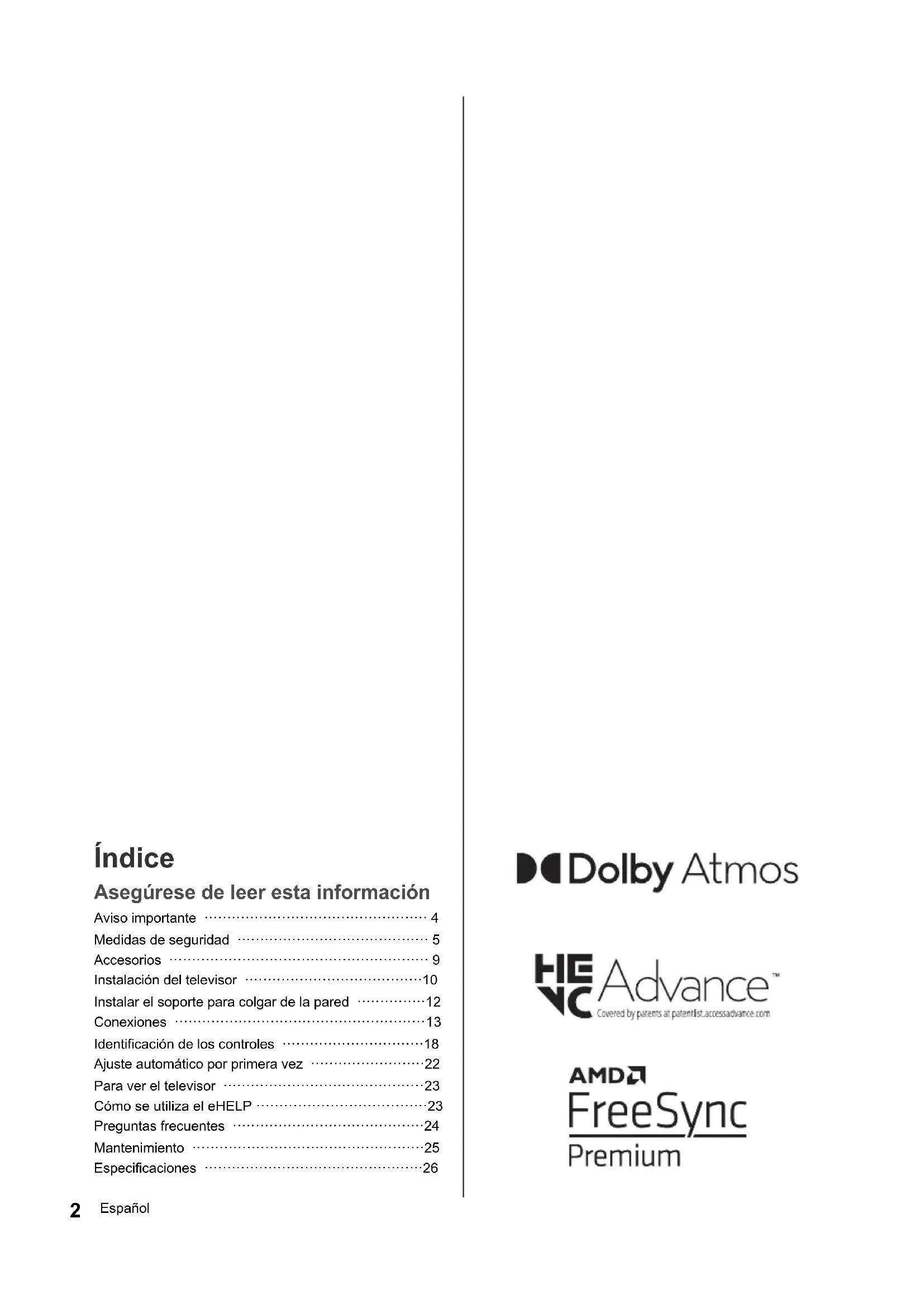 son marcas comerciales registradas propiedad de Bluetooth SIG, Inc. y todo uso de dichas marcas por parte de Panasonic Corporation se realiza bajo licencia. DVB y los logotipos DVB son marcas comerciales de DVB Project. x.v.Colour™ es una marca de fábrica. DiSEqC™ es una marca comercial de EUTELSAT. Google es una marca comercial de Google LLC. YouTube y el logotipo de YouTube son marcas comerciales de Google LLC. Amazon, Prime Video, Alexa y todos los logotipos relacionados son marcas comerciales de Amazon.com, Inc. o sus empresas afiliadas. © Disney Este producto cumple con las especificaciones técnicas de la UHD Alliance: Modo de referencia específico de la UHDA, versión 1.0. El logotipo FILMMAKER MODE™ es una marca comercial de la UHD Alliance, Inc. en los Estados Unidos y otros países. © 2020 Advanced Micro Devices, Inc, Todos los derechos reservados. AMD, FreeSync y sus combinaciones son marcas comerciales de Advanced Micro Devices, Inc. ≥ Para obtener información sobre las marcas comerciales, consulte el [eHELP] (Buscar por finalidad > Antes de empezar > Antes de usar este producto > Licencia). A menos que se indique lo contrario, en este manual, se utiliza la ilustración para TX-65LX940E. Las ilustraciones pueden ser diferentes dependiendo del modelo. TX-43_49_55_65LX940E_TQB4GA0108_spa.book 3 ページ 2022年1月7日 金曜日 午後7時6分4 Español Aviso importante Aviso para las funciones DVB/emisión de datos/IPTV ≥ Este televisor está diseñado para cumplir con los estándares (a partir de enero de 2022) de los servicios digitales terrestres DVB-T/T2 (MPEG2, MPEG4- AVC(H.264) y MPEG HEVC(H.265)), los servicios digitales de cable DVB-C (MPEG2, MPEG4- AVC(H.264) y MPEG HEVC(H.265)), y los servicios digitales de satélite DVB-S (MPEG2, MPEG4- AVC(H.264) y MPEG HEVC(H.265)). Con respecto a la disponibilidad de servicios DVB-T/T2 o DVB-S en su área, consulte a su proveedor local. Con respecto a la disponibilidad de servicios DVB-C para este televisor, consulte a su proveedor de servicios de cable. ≥ Este televisor puede no funcionar correctamente con una señal que no cumpla las normas de DVB-T/T2, DVB-C o DVB-S. ≥ No todas las funciones estarán, dependerá dependiendo del país, el área, el difusor, el proveedor del servicio, el satélite y el entorno de red. ≥ No todos los módulos CI trabajan adecuadamente con este televisor.Consulte al proveedor del servicio en relación con el módulo CI disponible.