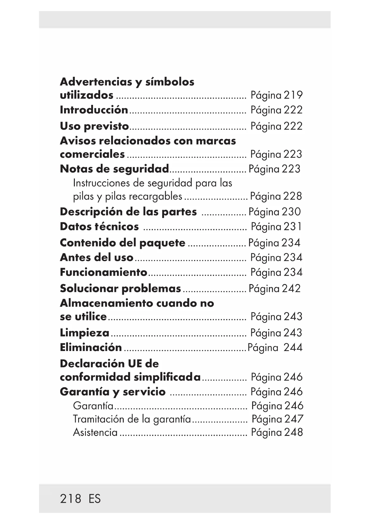 Ak sa vyskytnú funkčné poruchy alebo iné nedostatky, najskôr telefonicky alebo e-mailom kontaktujte následne uvedené servisné oddelenie. Produkt označený ako defektný potom môžete s priloženým dokladom o kúpe (pokladničný lístok) a uvedením, v čom spočíva nedostatok a kedy sa vyskytol, bezplatne odoslať na Vám oznámenú adresu servisného pracoviska. P Servis Servis Slovensko Tel.: 0800 008158 E-pošta: owim@lidl.sk218 ES Advertencias y símbolos utilizados ................................................. Página 219 Introducción ............................................ Página 222 Uso previsto ............................................ Página 222 Avisos relacionados con marcas comerciales ............................................. Página 223 Notas de seguridad............................. Página 223 Instrucciones de seguridad para las pilas y pilas recargables ........................ Página 228 Descripción de las partes ................. Página 230 Datos técnicos ....................................... Página 231 Contenido del paquete ...................... Página 234 Antes del uso .......................................... Página 234 Funcionamiento ..................................... Página 234 Solucionar problemas ........................ Página 242 Almacenamiento cuando no se utilice .................................................... Página 243 Limpieza ................................................... Página 243 Eliminación ..............................................Página 244 Declaración UE de conformidad simplificada ................. Página 246 Garantía y servicio ............................. Página 246 Garantía .................................................. Página 246 Tramitación de la garantía ..................... Página 247 Asistencia ................................................ Página 248219