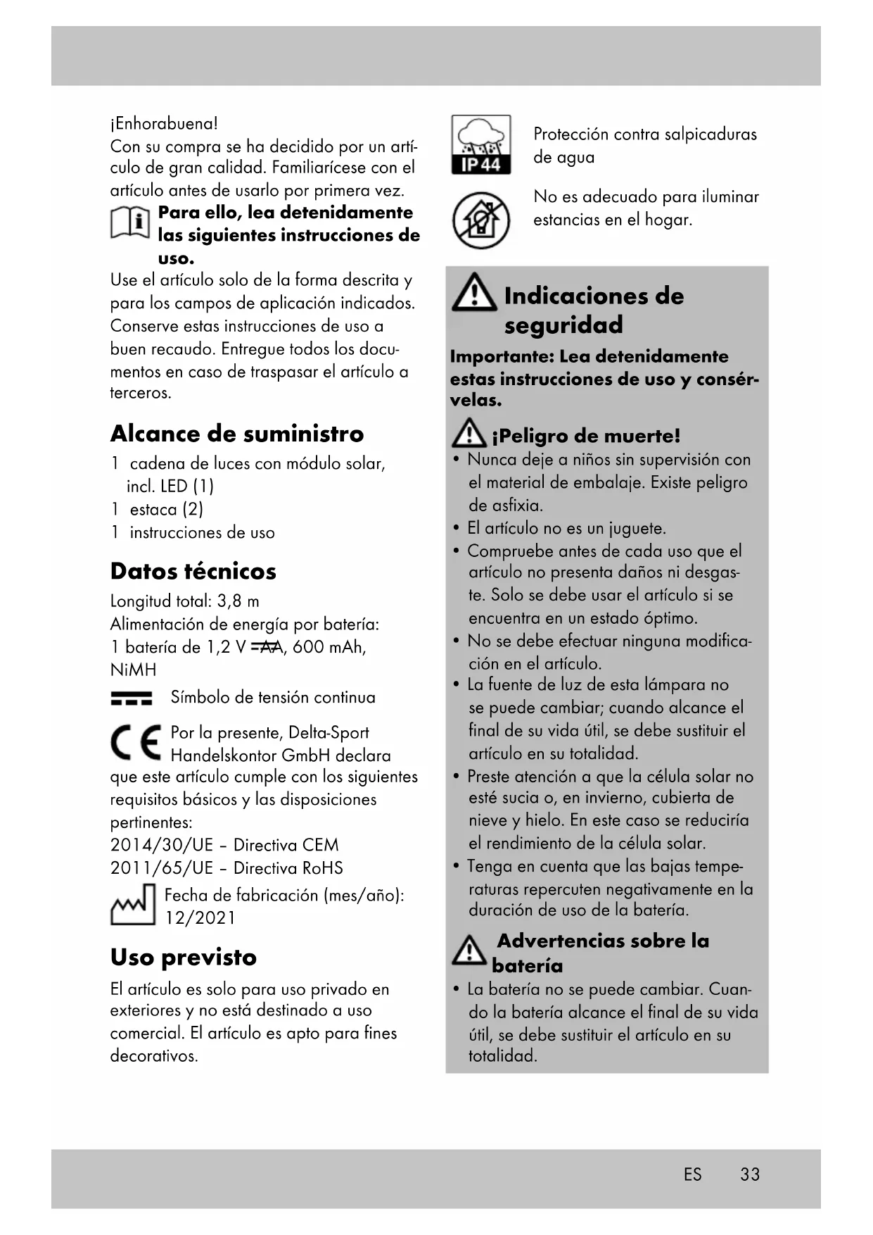 - Deslice el interruptor de encendido y apagado a la posición OFF. El artículo queda apagado de forma permanente. Almacenamiento, limpieza Si no va a utilizarlo, almacene siempre el artículo apagado, seco y limpio y a temperatura ambiente. Limpie el exterior solo con un paño de limpieza húmedo y después seque frotándolo. ¡IMPORTANTE! No lo limpie con produc- tos de limpieza agresivos.35 Indicaciones para la eliminación Cuando ya no se pueda volver a usar, no deseche el artículo con la basura doméstica, sino que, por el bien del medio ambiente, elimínelo de forma correcta. Puede informarse acerca de los centros de recogida y sus horarios de apertura en una administración competente. Las pilas/acumuladores se deben reciclar de conformidad con la directiva 2006/66/EG y sus enmiendas. Deseche las pilas/acumuladores o el artículo en las instalaciones de recogida disponibles. Los materiales de embalaje, como bolsas de plástico, no se deben dejar en manos de los niños. Conserve el material de embala- je fuera del alcance de los niños. Daños medioambientales por la eliminación incorrecta de pilas/ acumuladores. No deseche las pilas/acumuladores con la basura doméstica. Pueden contener metales pesados y deben ser tratados como residuos especiales. Los símbolos químicos de los metales pesados son estos: Cd = cadmio, Hg = mercurio, Pb = plomo. Por ello, elimine las pilas/acumuladores en un punto de recogida comunitario. Deseche el artículo y el embalaje de manera respetuosa con el medio ambiente. Al separar los residuos, tenga en cuenta la marcación de los materiales de embalaje, que se indica con abreviaturas (a) y números (b) que significan lo siguiente: 1-7: plásticos/20-22: papel y cartón/ 80-98: materiales compuestos. El artículo y su material de embalaje son reciclables, deséchelos separados para un mejor tratamiento de los residuos. El logo «Triman» solo se aplica en Francia. Para más información sobre la eliminación del artículo, acuda a su ayuntamiento o a las autoridades municipales. Indicaciones relativas a la garantía y la gestión de servicios El artículo ha sido fabricado con gran esmero y sometido a controles constantes. Para el mismo, DELTA-SPORT HANDELS- KONTOR GmbH ofrece a los clientes finales particulares una garantía de tres años a contar desde la fecha de compra (periodo de garantía) con arreglo a las condiciones que se exponen a continua- ción. La garantía tiene validez únicamente para fallos del material y fabricación. La garantía no cubre las piezas sometidas a un desgaste normal, las cuales se con- sideran piezas de desgaste (p. ej., pilas) así como tampoco piezas frágiles como, p. ej., interruptores, baterías o piezas fabricadas en vidrio o cristal. Se excluyen derechos derivados de esta garantía, si se ha realizado un uso incorrecto o abusivo del artículo o que no se encuentre dentro del marco del uso o ámbito de uso previstos o si no se ha observado lo recogido en el manual de instrucciones, a no ser que el cliente final demuestre que existen fallos del material o fabricación no derivados de una de las circunstancias expuestas anteriormente. Las demandas derivadas de la garantía sólo podrán presentarse dentro del pe- riodo de garantía exhibiendo el compro- bante de compra original. Le rogamos, por ello, que conserve el comprobante de compra original. ES36 ES El periodo de garantía no se verá pro- longado por ningún tipo de reparación realizada con motivo de la garantía, la garantía legal o como gesto de buena vo- luntad. Esto se aplica también a las piezas sustituidas o reparadas. Por favor, dirija sus quejas primero a la línea telefónica del servicio de atención al cliente que se indica a continuación o póngase en contacto con nosotros por correo electrónico. Si el caso está cubierto por la garantía, a nuestra elección, repa- raremos o cambiaremos gratuitamente el artículo o le restituiremos el precio de compra del mismo. De la garantía no se derivan otros derechos. Esta garantía no limitará sus derechos legales, especialmente los derechos de garantía frente al vendedor correspon- diente. IAN: 398838_2107 Servicio España Tel.: 900 984 989 E-Mail: deltasport@lidl.es37 Hjertelig tillykke! Du har valgt at købe et kvalitetsprodukt. Lær produktet at kende, inden du bruger det første gang. Det gør du ved at læse nedenstående brugervejled- ning omhyggeligt. Brug kun produktet som beskrevet og til de angivne anvendelsesområder. Opbevar denne brugervejledning et sikkert sted. Ud- lever også alle dokumenter, hvis produktet videregives til en tredjepart. Leveringsomfang 1 x lyskæde med solcellemodul inkl. LED (1) 1 x pløk (2) 1 x brugervejledning Tekniske data Længde i alt: 3,8 m Strømforsyning, genopladeligt batteri: 1 x 1,2 V AA, 600 mAh, NiMH Symbol for jævnspænding Hermed erklærer Delta-Sport Handelskontor GmbH, at denne artikel er i overensstemmelse med følgende grundlæggende krav og de øvrige gældende bestemmelser: 2014/30/EU – EMC-direktivet 2011/65/EU – RoHS-direktivet Fremstillingsdato (måned/år): 12/2021 Bestemmelsesmæssig brug Artiklen er kun beregnet til privat, uden- dørs brug og ikke til erhvervsmæssig brug. Artiklen egner sig til dekorationsformål. Stænktæt Ikke egnet til almindelig rumbelysning i husholdningen. Sikkerhedsanvisninger Vigtigt: Læs denne brugervejled- ning omhyggeligt, og opbevar den til senere brug! Livsfare!