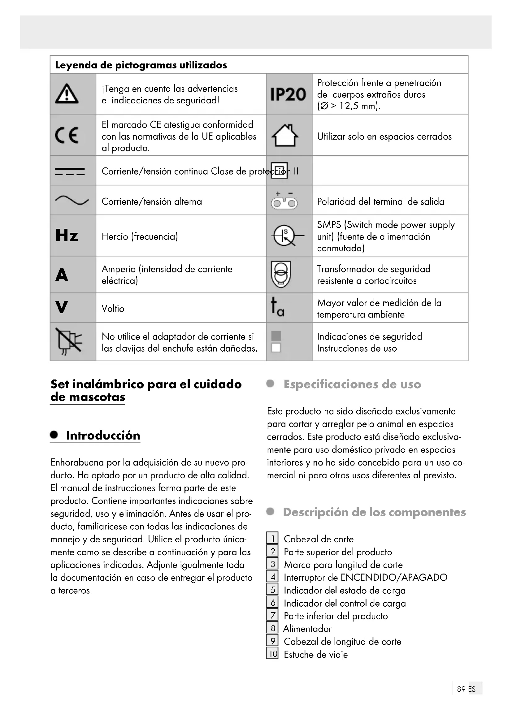 Voltio Mayor valor de medición de la temperatura ambiente No utilice el adaptador de corriente si las clavijas del enchufe están dañadas. Indicaciones de seguridad Instrucciones de uso Set inalámbrico para el cuidado de mascotas Introducción Enhorabuena por la adquisición de su nuevo pro- ducto. Ha optado por un producto de alta calidad. El manual de instrucciones forma parte de este producto. Contiene importantes indicaciones sobre seguridad, uso y eliminación. Antes de usar el pro- ducto, familiarícese con todas las indicaciones de manejo y de seguridad. Utilice el producto única- mente como se describe a continuación y para las aplicaciones indicadas. Adjunte igualmente toda la documentación en caso de entregar el producto a terceros. Especificaciones de uso Este producto ha sido diseñado exclusivamente para cortar y arreglar pelo animal en espacios cerrados. Este producto está diseñado exclusiva- mente para uso doméstico privado en espacios interiores y no ha sido concebido para un uso co- mercial ni para otros usos diferentes al previsto. Descripción de los componentes