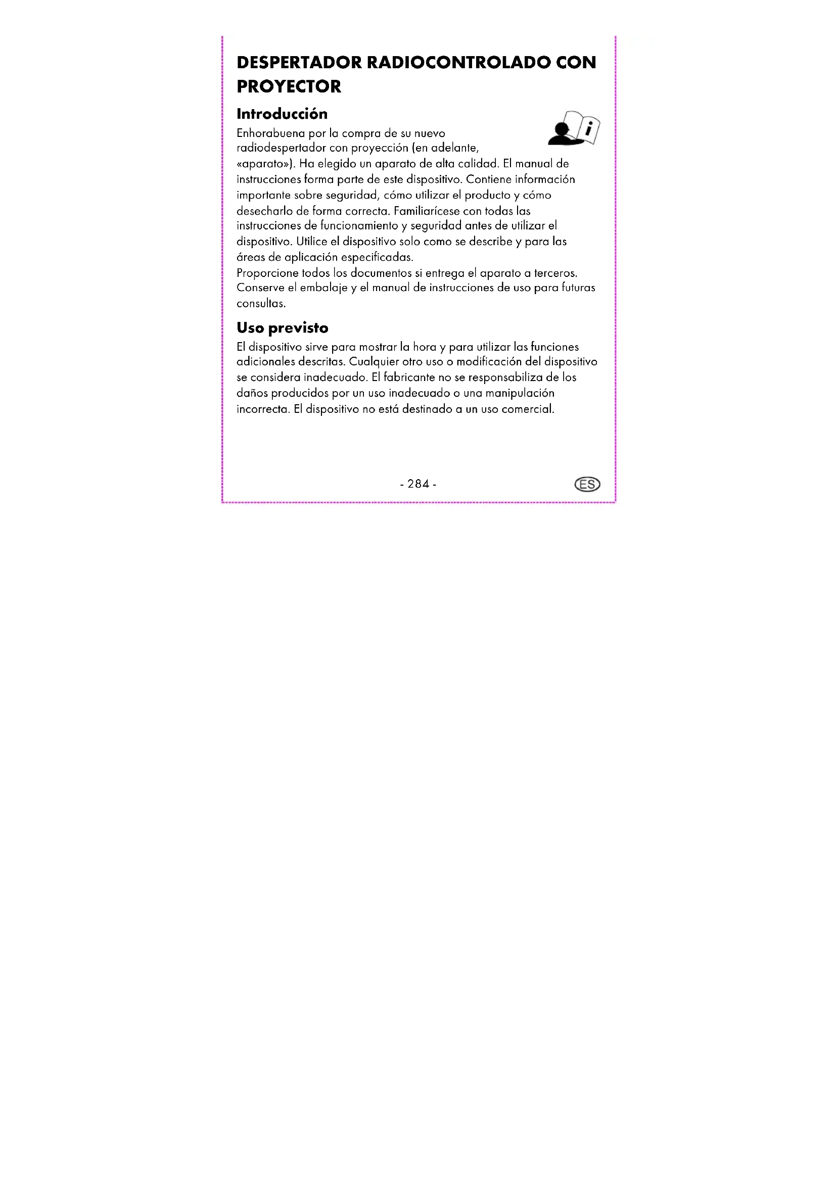 PROYECTOR Introducción Enhorabuena por la compra de su nuevo radiodespertador con proyección (en adelante, «aparato»). Ha elegido un aparato de alta calidad. El manual de instrucciones forma parte de este dispositivo. Contiene información importante sobre seguridad, cómo utilizar el producto y cómo desecharlo de forma correcta. Familiarícese con todas las instrucciones de funcionamiento y seguridad antes de utilizar el dispositivo. Utilice el dispositivo solo como se describe y para las áreas de aplicación especificadas. Proporcione todos los documentos si entrega el aparato a terceros. Conserve el embalaje y el manual de instrucciones de uso para futuras consultas. Uso previsto El dispositivo sirve para mostrar la hora y para utilizar las funciones adicionales descritas. Cualquier otro uso o modificación del dispositivo se considera inadecuado. El fabricante no se responsabiliza de los daños producidos por un uso inadecuado o una manipulación incorrecta. El dispositivo no está destinado a un uso comercial.- 285 - Contenido de la entrega Advertencia: Compruebe el contenido de la entrega después de la compra. Asegúrese de que todas las piezas estén presentes y no tengan defectos. Si la entrega está incompleta o hay piezas dañadas, no utilice el aparato. Póngase en contacto con el servicio de asistencia técnica (véase «Gestión de una reclamación de garantía»). 1 radiodespertador con proyección 1 x fuente de alimentación 2 x pilas alcalinas 1,5 V AA LR6 1 x manual de instrucciones Especificaciones técnicas Radiodespertador con proyección Hora de radio DCF77 Frecuencia de transmisión: 77,5 kHz Dimensiones: aprox. 130 x 96 x 50 mm Peso: aprox. Modelo 1: 177 g (sin pilas) Modelo 2: 173 g (sin pilas) Entrada: 5,0 V 1,0 A; 5,0 W Condiciones climáticas de almacenamiento: -10 °C ~ 60 °C Funcionamiento con dos pilas LR6/R6 AA de 1,5 V Batería - Indicador de tensión continua- 286 - Funcionamiento con fuente de alimentación enchufable, modelo: YJTH05 Fuente de alimentación Modelo: YJTH05 Fabricante: Putian Yijia Electronic Co., Ltd. Dimensiones: aprox. 63,6 x 37,7 x 65,1 mm Peso: Modelo 1: 71 g Modelo 2: 67 g Longitud del cable: aprox. 1,5 m Entrada: 100-240 V, ~50/60 Hz, 0,3 A máx. Salida: 5,0 V 1,0 A, 5,0 W Eficiencia media en funcionamiento: 74,1 % Eficiencia con carga ligera (10 %): 73,63 % Consumo de energía sin carga: 0,07 W Clase de protección: II Grado de protección: IP20- 287 - Explicación de los símbolos ¡PELIGRO! Este término/símbolo de advertencia denota un peligro con un nivel de riesgo alto que, de no evitarse, provocará la muerte o lesiones graves. ¡ADVERTENCIA! Esta palabra de señal/símbolo de advertencia denota un peligro con un nivel de riesgo medio que, de no evitarse, puede provocar la muerte o lesiones graves. ¡PELIGRO DE DESCARGA ELÉCTRICA/PARA LA VIDA! Este término/símbolo de advertencia denota un peligro debido a una descarga eléctrica. Nota: Esta palabra de advertencia se utiliza para ofrecer información adicional. Existe un riesgo de explosión y de fuga del líquido de las pilas o baterías si estas se utilizan de forma inadecuada.- 288 -