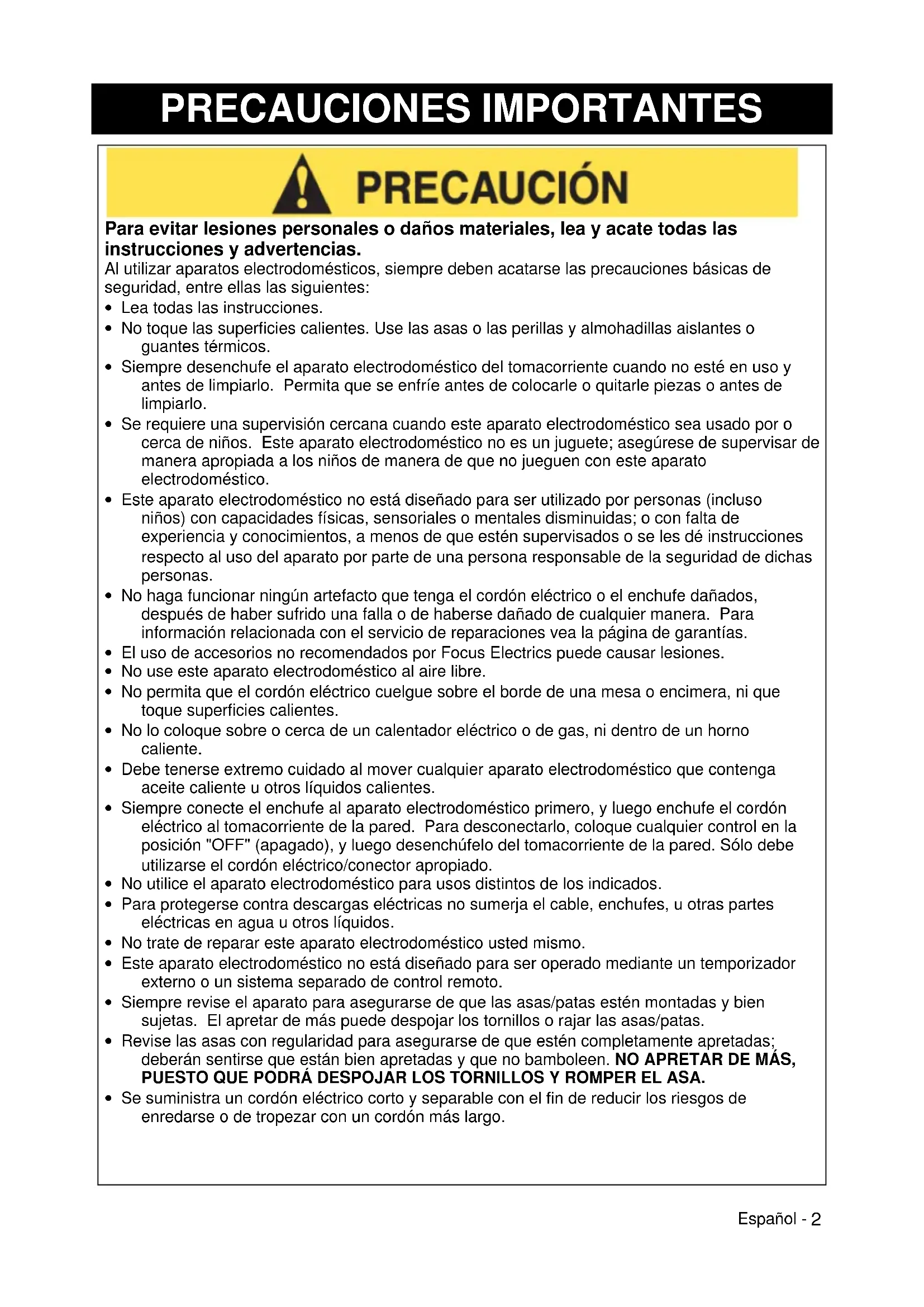Garantía Limitada de 1 Año del Artefacto Electrodoméstico Focus Electrics, LLC (“Focus Electrics”) garantiza que este aparato no presentará fallas de material ni fabricación durante un (1) año a partir de la fecha original de compra con prueba de dicha compra, siempre y cuando el aparato sea operado y mantenido tal como se indica en el manual de instrucciones provisto. Toda pieza del aparato que presente fallas será reparada o reemplazada sin costo alguno a criterio de Focus Electrics. Esta garantía rige solamente para el uso domestico dentro de la casa. Esta garantía no cubre ningún daño, incluyendo la decoloración, de superficie anti-adherente alguna del aparato electrodoméstico. Esta garantía es nula y sin valor, según lo determine exclusivamente Focus Electrics si el artefacto electrodoméstico es dañado a causa de accidente, mal uso, abuso, negligencia, rayaduras, o si el artefacto electrodoméstico es cambiado de algún modo. ESTA GARANTÍA REEMPLAZA A TODAS LAS DEMÁS GARANTÍAS IMPLÍCITAS, INCLUYENDO AQUÉLLAS DE COMERCIABILIDAD, IDONEIDAD PARA UN FIN O USO EN PARTICULAR, DESEMPEÑO, U OTROS TIPOS, LAS CUALES QUEDAN EXCLUIDAS MEDIANTE EL PRESENTE DOCUMENTO. FOCUS ELECTRICS, LLC RECHAZA TODA RESPONSABILIDAD POR DAÑOS, YA SEAN DIRECTOS, INDIRECTOS, INCIDENTALES, PREVISIBLES, CONSECUENTES O ESPECIALES QUE SURJAN DE ESTE APARATO ELECTRODOMÉSTICO O GUARDEN RELACIÓN CON EL MISMO. Si piensa que el artefacto electrodoméstico se ha dañado o requiere de servicio dentro de su período de garantía, por favor póngase en contacto con el Departamento de Atención al Cliente de Focus Electrics por el (866) 290-1851 o contáctenos por correo electrónico a la service@focuselectrics.com . Los gastos de devolución no son reembolsables. Para todas las reclamaciones de garantía, se requerirá un recibo que demuestra la fecha de compra original, los recibos escritos a mano no son aceptados. Focus Electrics, LLC no se hace responsable de las devoluciones perdidas en tránsito. Válido sólo en EE.UU. y Canadá