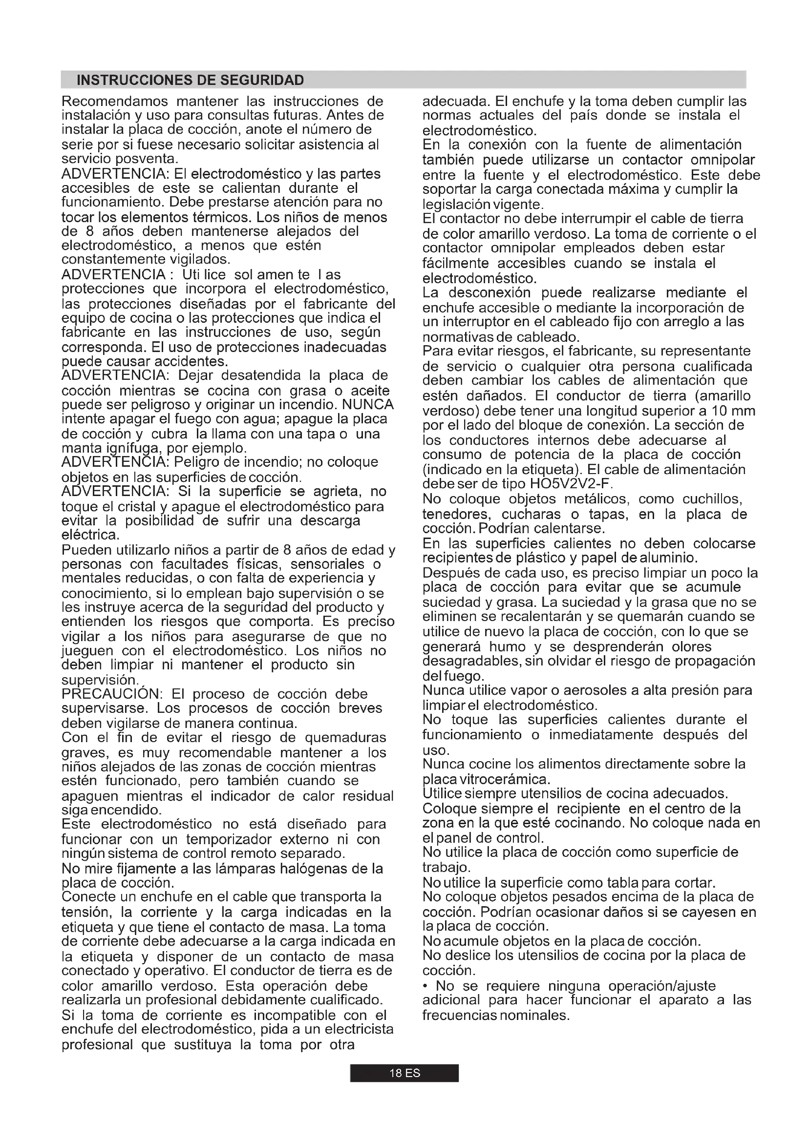 7,7 kW734 l/h560 g/h -18 ES Conecte un enchufe en el cable que transporta la tensión, la corriente y la carga indicadas en la etiqueta y que tiene el contacto de masa. La toma de corriente debe adecuarse a la carga indicada en la etiqueta y disponer de un contacto de masa conectado y operativo. El conductor de tierra es de color amarillo verdoso. Esta operación debe realizarla un profesional debidamente cualificado. Si la toma de corriente es incompatible con el enchufe del electrodoméstico, pida a un electricista profesional que sustituya la toma por otra ADVERTENCIA: El electrodoméstico y las partes accesibles de este se calientan durante el funcionamiento. Debe prestarse atención para no tocar los elementos térmicos. Los niños de menos de 8 años deben mantenerse alejados del electrodoméstico, a menos que estén constantemente vigilados. ADVERTENCIA: Dejar desatendida la placa de cocción mientras se cocina con grasa o aceite puede ser peligroso y originar un incendio. NUNCA intente apagar el fuego con agua; apague la placa de cocción y cubra la llama con una tapa o una manta ignífuga, por ejemplo. Pueden utilizarlo niños a partir de 8 años de edad y personas con facultades físicas, sensoriales o mentales reducidas, o con falta de experiencia y conocimiento, si lo emplean bajo supervisión o se les instruye acerca de la seguridad del producto y entienden los riesgos que comporta. Es preciso vigilar a los niños para asegurarse de que no jueguen con el electrodoméstico. Los niños no deben limpiar ni mantener el producto sin supervisión. Recomendamos mantener las instrucciones de instalación y uso para consultas futuras. Antes de instalar la placa de cocción, anote el número de serie por si fuese necesario solicitar asistencia al servicio posventa. ADVERTENCIA : Uti lice sol amen te l as protecciones que incorpora el electrodoméstico, las protecciones diseñadas por el fabricante del equipo de cocina o las protecciones que indica el fabricante en las instrucciones de uso, según corresponda. El uso de protecciones inadecuadas puede causar accidentes. No mire fijamente a las lámparas halógenas de la placa de cocción. PRECAUCIÓN: El proceso de cocción debe supervisarse. Los procesos de cocción breves deben vigilarse de manera continua. ADVERTENCIA: Peligro de incendio; no coloque objetos en las superficies de cocción. Con el fin de evitar el riesgo de quemaduras graves, es muy recomendable mantener a los niños alejados de las zonas de cocción mientras estén funcionado, pero también cuando se apaguen mientras el indicador de calor residual siga encendido. ADVERTENCIA: Si la superficie se agrieta, no toque el cristal y apague el electrodoméstico para evitar la posibilidad de sufrir una descarga eléctrica. Este electrodoméstico no está diseñado para funcionar con un temporizador externo ni con ningún sistema de control remoto separado.