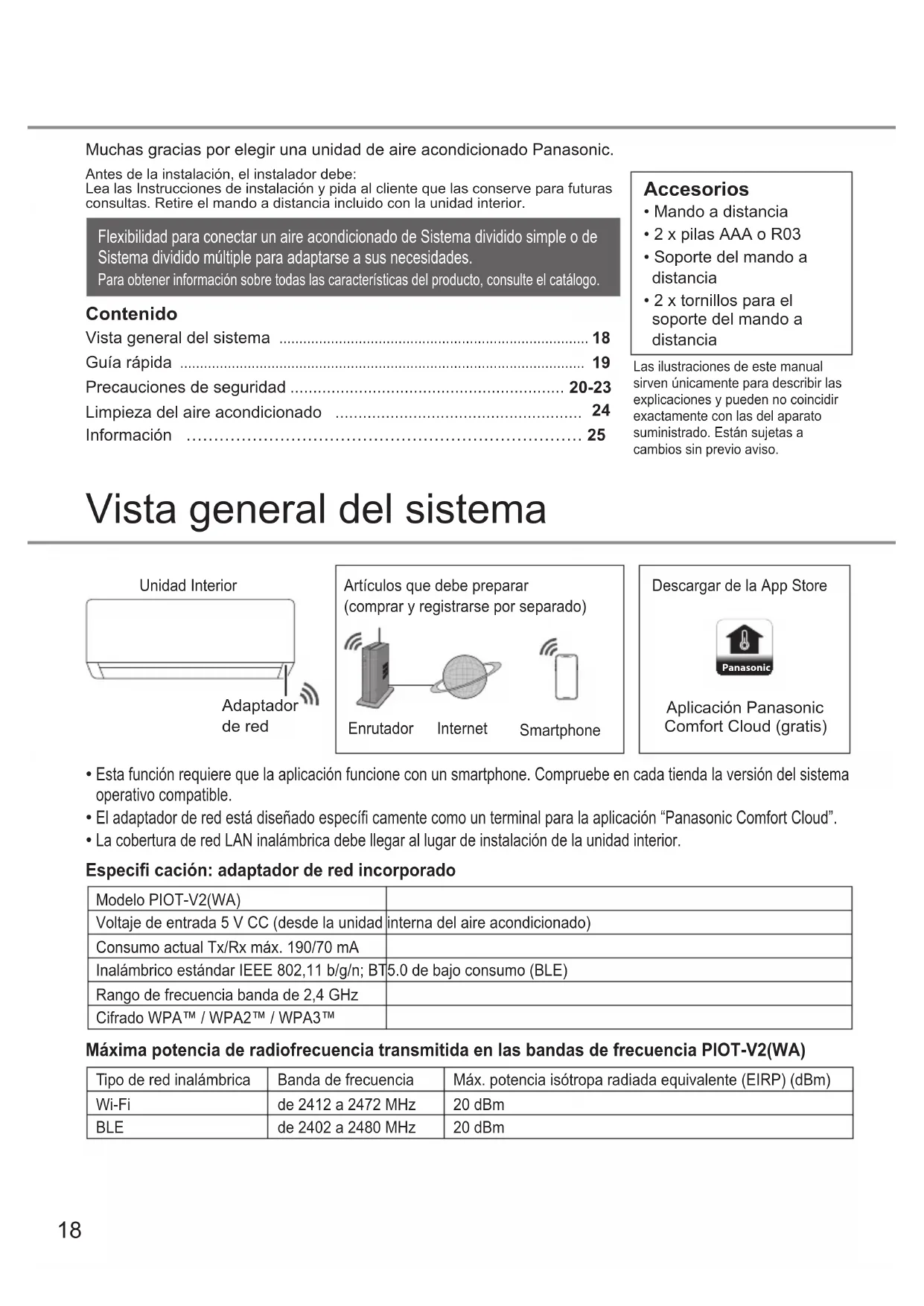 La cobertura de red LAN inalámbrica debe llegar al lugar de instalación de la unidad interior. Panasonic Descargar de la App Store Enrutador Internet Smartphone Artículos que debe preparar (comprar y registrarse por separado) Aplicación Panasonic Comfort Cloud (gratis) Unidad Interior Adaptador de red Modelo PIOT-V2(WA) Voltaje de entrada 5 V CC (desde la unidad interna del aire acondicionado) Consumo actual Tx/Rx máx. 190/70 mA Inalámbrico estándar IEEE 802,11 b/g/n; BT5.0 de bajo consumo (BLE) Rango de frecuencia banda de 2,4 GHz Cifrado WPA™ / WPA2™ / WPA3™ Especifi cación: adaptador de red incorporado Máxima potencia de radiofrecuencia transmitida en las bandas de frecuencia PIOT-V2(WA) Tipo de red inalámbrica Banda de frecuencia Máx. potencia isótropa radiada equivalente (EIRP) (dBm) Wi-Fi de 2412 a 2472 MHz 20 dBm BLE de 2402 a 2480 MHz 20 dBm19