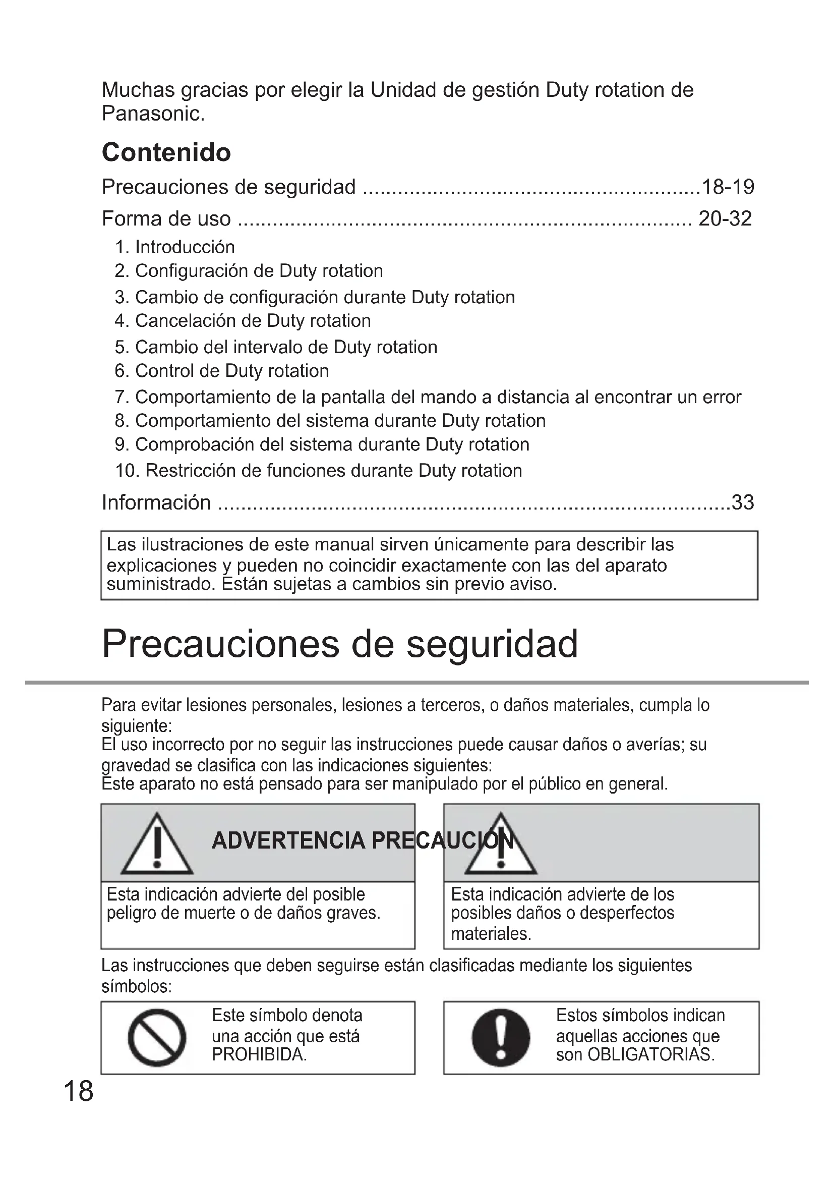 Esta indicación advierte del posiblepeligro de muerte o de daños graves.Esta indicación advierte de losposibles daños o desperfectosmateriales.Las instrucciones que deben seguirse están clasificadas mediante los siguientes símbolos:Este símbolo denota una acción que está PROHIBIDA.Estos símbolos indicanaquellas acciones que son OBLIGATORIAS.Las ilustraciones de este manual sirven únicamente para describir lasexplicaciones y pueden no coincidir exactamente con las del aparato suministrado. Están sujetas a cambios sin previo aviso. Contenido Precauciones de seguridad ..........................................................18-19 Forma de uso .............................................................................. 20-32 1. Introducción2. Configuración de Duty rotation3. Cambio de configuración durante Duty rotation4. Cancelación de Duty rotation5. Cambio del intervalo de Duty rotation6. Control de Duty rotation7. Comportamiento de la pantalla del mando a distancia al encontrar un error8. Comportamiento del sistema durante Duty rotation9. Comprobación del sistema durante Duty rotation10. Restricción de funciones durante Duty rotation Información ........................................................................................3319 Español Precauciones de seguridad ADVERTENCIA Esto puede ocasionar descarga eléctrica o ignición.