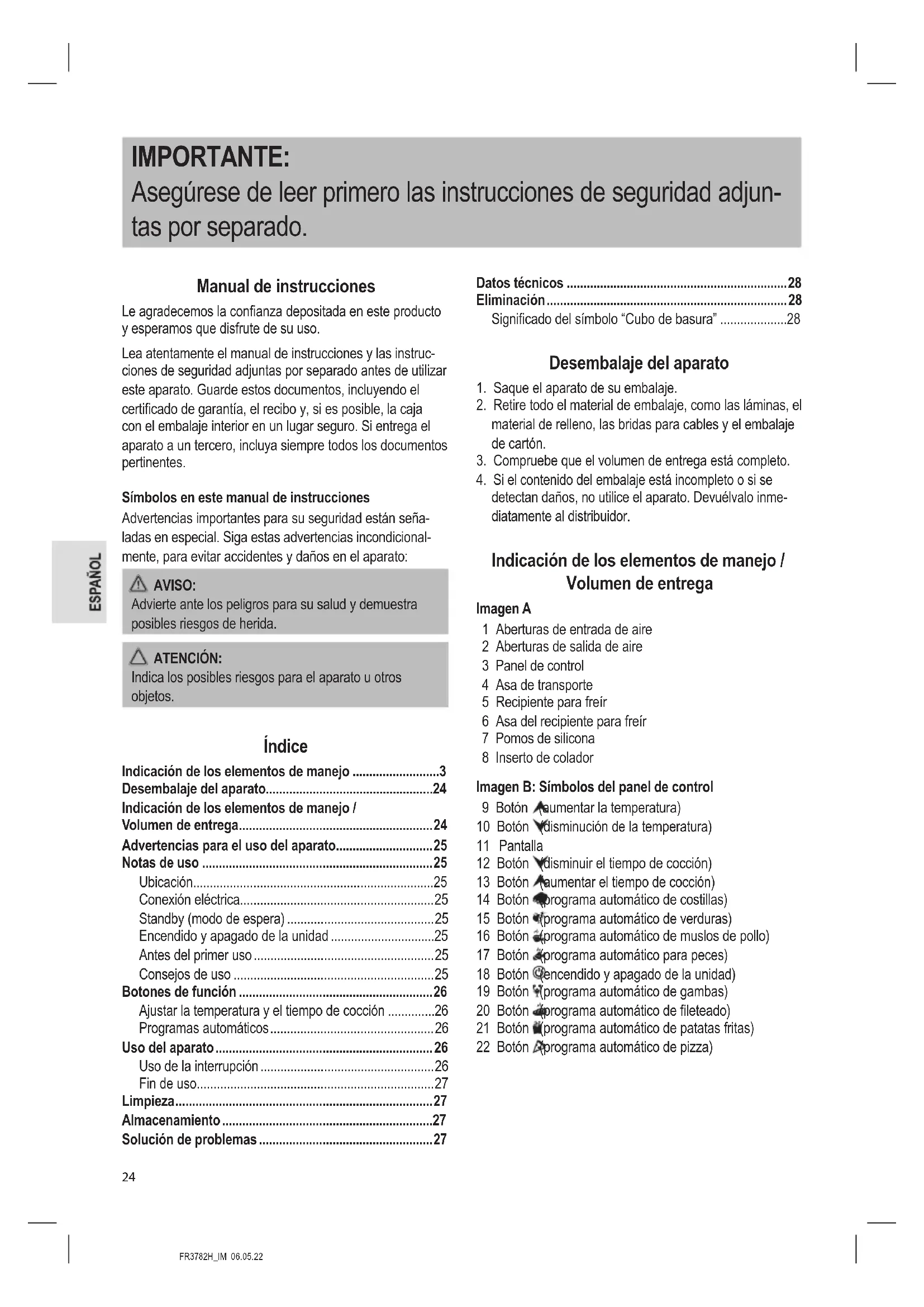detectan daños, no utilice el aparato. Devuélvalo inme- diatamente al distribuidor. Indicación de los elementos de manejo / Volumen de entrega Imagen A 1 Aberturas de entrada de aire 2 Aberturas de salida de aire 3 Panel de control 4 Asa de transporte 5 Recipiente para freír 6 Asa del recipiente para freír 7 Pomos de silicona 8 Inserto de colador Imagen B: Símbolos del panel de control 9 Botón (aumentar la temperatura) 10 Botón (disminución de la temperatura) 11 Pantalla 12 Botón (disminuir el tiempo de cocción) 13 Botón (aumentar el tiempo de cocción) 14 Botón (programa automático de costillas) 15 Botón (programa automático de verduras) 16 Botón (programa automático de muslos de pollo) 17 Botón (programa automático para peces) 18 Botón (encendido y apagado de la unidad) 19 Botón (programa automático de gambas) 20 Botón (programa automático de leteado) 21 Botón (programa automático de patatas fritas) 22 Botón (programa automático de pizza)FR3782H_IM 06.05.22