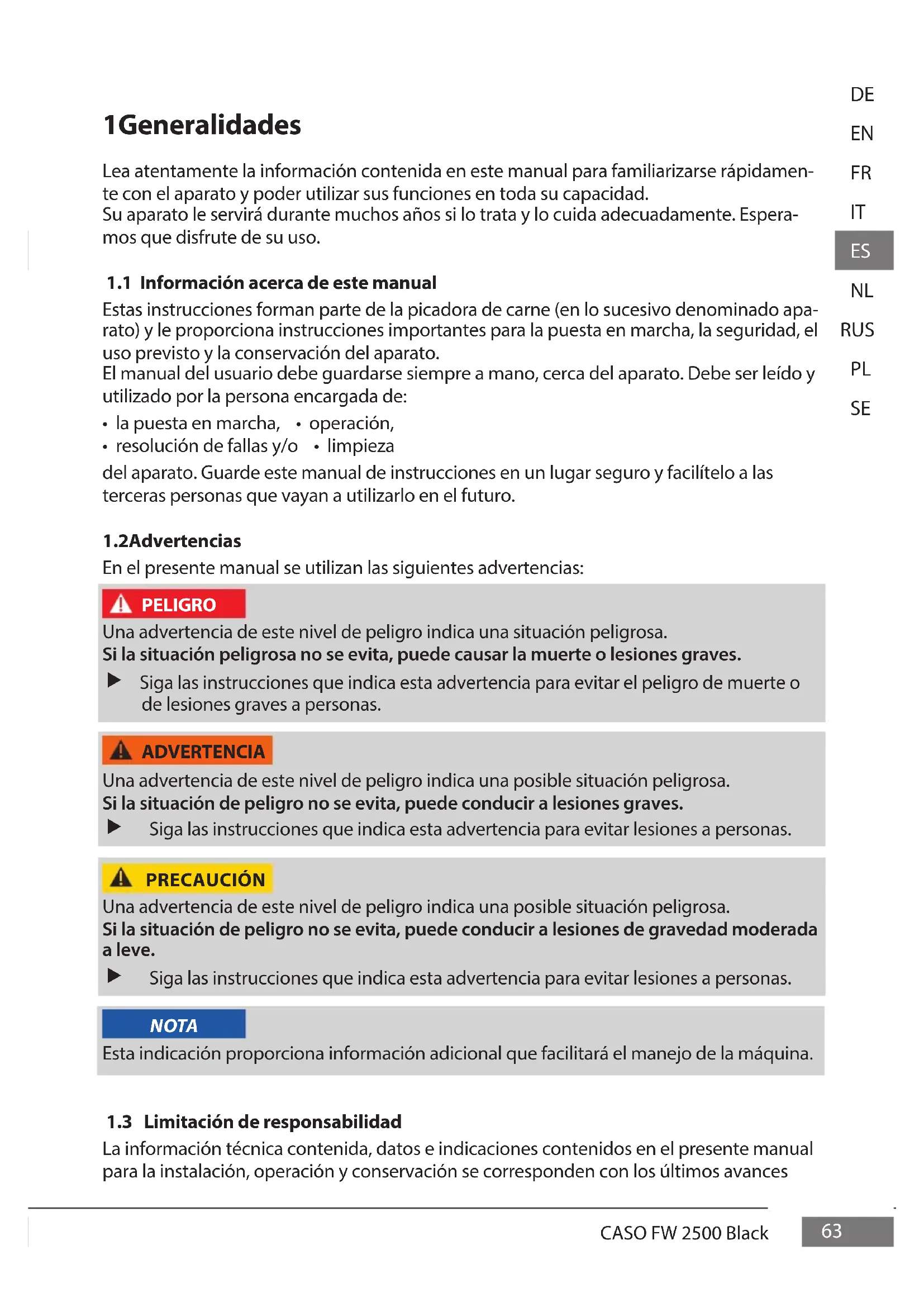 Estas instrucciones forman parte de la picadora de carne (en lo sucesivo denominado apa- rato) y le proporciona instrucciones importantes para la puesta en marcha, la seguridad, el uso previsto y la conservación del aparato. El manual del usuario debe guardarse siempre a mano, cerca del aparato. Debe ser leído y utilizado por la persona encargada de: