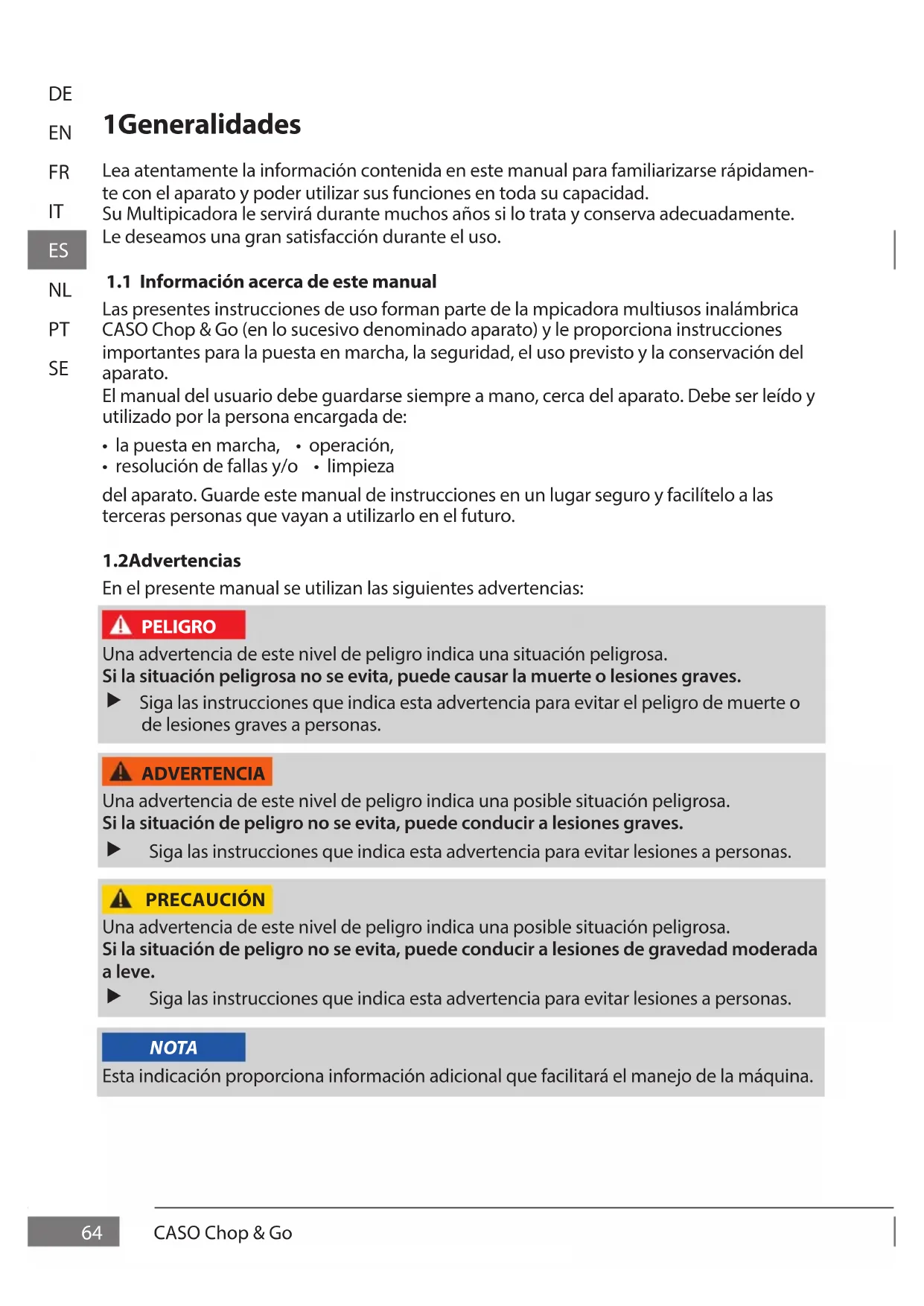 Las presentes instrucciones de uso forman parte de la mpicadora multiusos inalámbrica CASO Chop & Go (en lo sucesivo denominado aparato) y le proporciona instrucciones importantes para la puesta en marcha, la seguridad, el uso previsto y la conservación del aparato. El manual del usuario debe guardarse siempre a mano, cerca del aparato. Debe ser leído y utilizado por la persona encargada de: