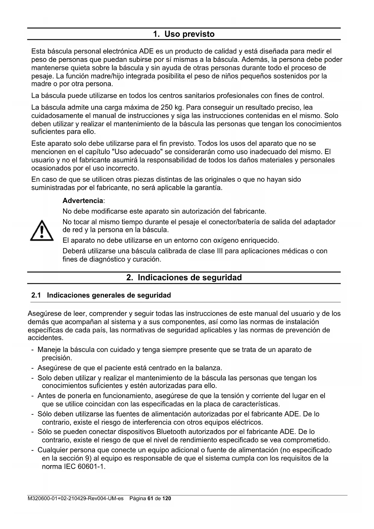 Asegúrese de leer, comprender y seguir todas las instrucciones de este manual del usuario y de los demás que acompañan al sistema y a sus componentes, así como las normas de instalación específicas de cada país, las normativas de seguridad aplicables y las normas de prevención de accidentes. - Maneje la báscula con cuidado y tenga siempre presente que se trata de un aparato de precisión. - Asegúrese de que el paciente está centrado en la balanza. - Solo deben utilizar y realizar el mantenimiento de la báscula las personas que tengan los conocimientos suficientes y estén autorizadas para ello. - Antes de ponerla en funcionamiento, asegúrese de que la tensión y corriente del lugar en el que se utilice coincidan con las especificadas en la placa de características. - Sólo deben utilizarse las fuentes de alimentación autorizadas por el fabricante ADE. De lo contrario, existe el riesgo de interferencia con otros equipos eléctricos. - Sólo se pueden conectar dispositivos Bluetooth autorizados por el fabricante ADE. De lo contrario, existe el riesgo de que el nivel de rendimiento especificado se vea comprometido. - Cualquier persona que conecte un equipo adicional o fuente de alimentación (no especificado en la sección 9) al equipo es responsable de que el sistema cumpla con los requisitos de la norma IEC 60601-1.Página 62 de 120 M320600-01+02-210429-Rev004-UM-es - Tienda el cable de conexión entre la báscula y la toma de red de tal modo que no suponga un riesgo de tropiezos. - La clavija de enchufe/adaptador aísla el aparato de la fuente de alimentación. No coloque el aparato en una posición en la que sea difícil desconectarlo de la red eléctrica para interrumpir el funcionamiento del equipo. - Tienda el cable de conexión entre la báscula y la toma de red de tal modo que no pueda ocasionar un riesgo de estrangulación. - No deslice nunca la báscula sobre la superficie de apoyo ya que podría dañar los sensores. - Utilice el aparato sólo en las condiciones ambientales admisibles. - Utilice la báscula únicamente en las condiciones de entorno permitidas. No someta la báscula a temperaturas elevadas, ya sea debidas a aparatos colocados junto a ella o a la radiación del sol. - Podrían dañarse los indicadores de cristal líquido. Utilice la báscula con temperaturas ambiente estables y evite emplearla en corrientes de aire, ya que podrían provocar resultados erróneos. - Después del almacenamiento bajo condiciones extremas se necesitan al menos 30 minutos hasta que la báscula se haya aclimatado y esté lista para el uso previsto. - Coloque la báscula lo más alejada posible de otros aparatos o fuentes de interferencias electromagnéticas o de otro tipo, ya que podrían provocar resultados erróneos. - Utilice exclusivamente los accesorios y dispositivos periféricos permitidos. - Desenchufe el aparato antes de limpiarlo. - No sumerja el aparato en agua ni en ningún otro líquido. - Si no va a utilizar la báscula durante un periodo de tiempo prolongado, límpiela y guárdela envuelta en una lámina de protección. Opcionalmente puede colocar un agente secante. - Quite las pilas cuando no vaya a utilizar la báscula durante un periodo prolongado de tiempo. - Si tiene algún problema con este dispositivo, como la configuración, el mantenimiento o el uso, póngase en contacto con el servicio de atención al cliente autorizado. No abra o repare el aparato usted mismo. - Por favor, informe al servicio de atención al cliente autorizado si se produce cualquier operación o evento inesperado. NO utilice la báscula: - si el adaptador de red está dañado; - si el adaptador de red no funciona; - si el compartimento de las pilas está anormalmente curvado; - después de haber estado guardada durante mucho tiempo en un ambiente húmedo. En estos casos, diríjase al servicio de atención al cliente autorizado.M320600-01+02-210429-Rev004-UM-es Página 63 de 120