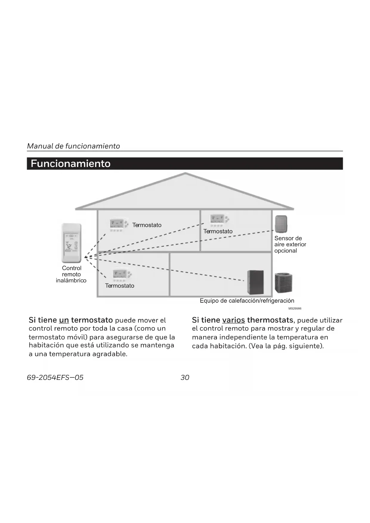 Información reguladora ............................................................................................ 43Manual de funcionamiento 69-2054EFS—05 30 Funcionamiento Si tiene un termostato puede mover el control remoto por toda la casa (como un termostato móvil) para asegurarse de que la habitación que está utilizando se mantenga a una temperatura agradable. Si tiene varios thermostats, puede utilizar el control remoto para mostrar y regular de manera independiente la temperatura en cada habitación. (Vea la pág. siguiente). Control remoto inalámbric