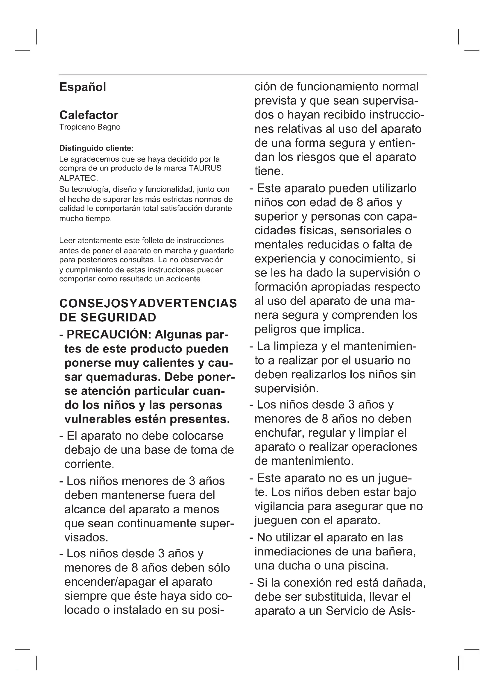 DEspañol Calefactor Tropicano Bagno Distinguido cliente: Le agradecemos que se haya decidido por la compra de un producto de la marca TAURUS ALPATEC. Su tecnología, diseño y funcionalidad, junto con el hecho de superar las más estrictas normas de calidad le comportarán total satisfacción durante mucho tiempo. Leer atentamente este folleto de instrucciones antes de poner el aparato en marcha y guardarlo para posteriores consultas. La no observación y cumplimiento de estas instrucciones pueden comportar como resultado un accidente.