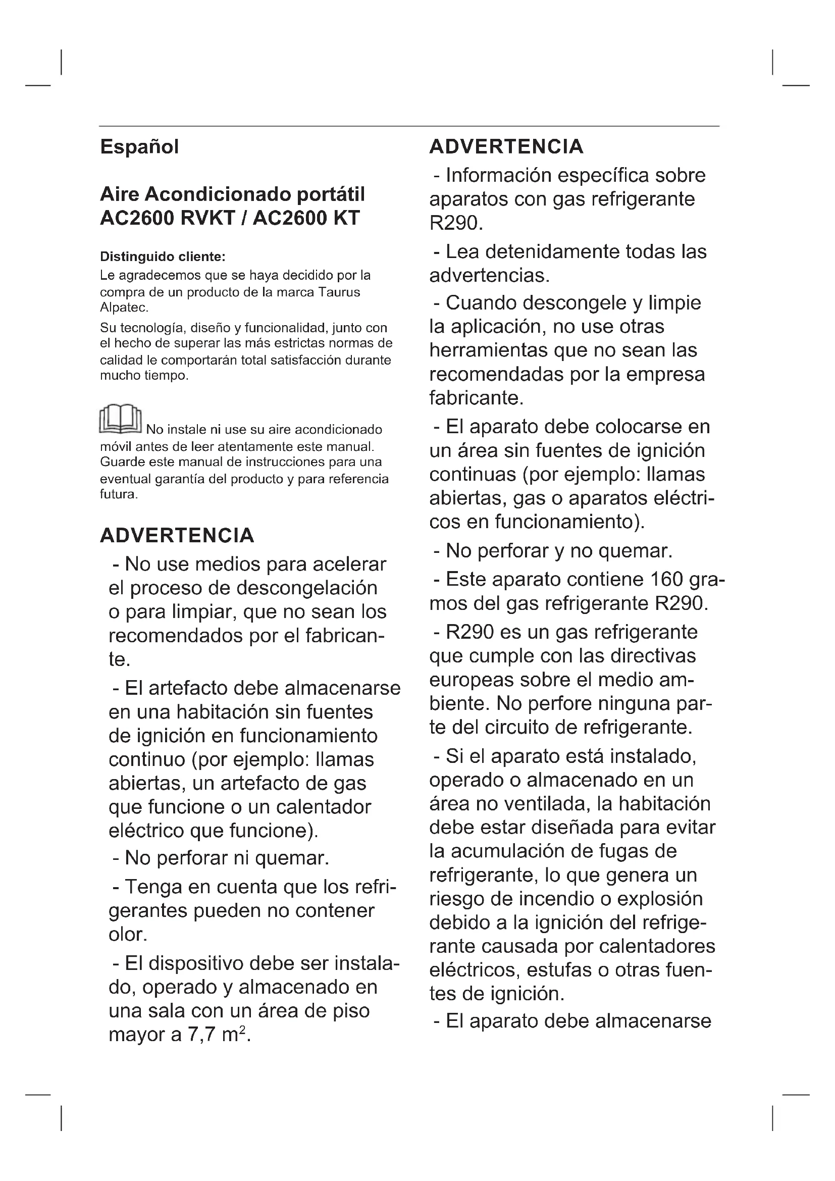 Distinguido cliente: Le agradecemos que se haya decidido por la compra de un producto de la marca Taurus Alpatec. Su tecnología, diseño y funcionalidad, junto con el hecho de superar las más estrictas normas de calidad le comportarán total satisfacción durante mucho tiempo. No instale ni use su aire acondicionado móvil antes de leer atentamente este manual. Guarde este manual de instrucciones para una eventual garantía del producto y para referencia futura. ADVERTENCIA - No use medios para acelerar el proceso de descongelación o para limpiar, que no sean los recomendados por el fabrican- te. - El artefacto debe almacenarse en una habitación sin fuentes de ignición en funcionamiento continuo (por ejemplo: llamas abiertas, un artefacto de gas que funcione o un calentador eléctrico que funcione). - No perforar ni quemar. - Tenga en cuenta que los refri- gerantes pueden no contener olor. - El dispositivo debe ser instala- do, operado y almacenado en una sala con un área de piso mayor a 7,7 m