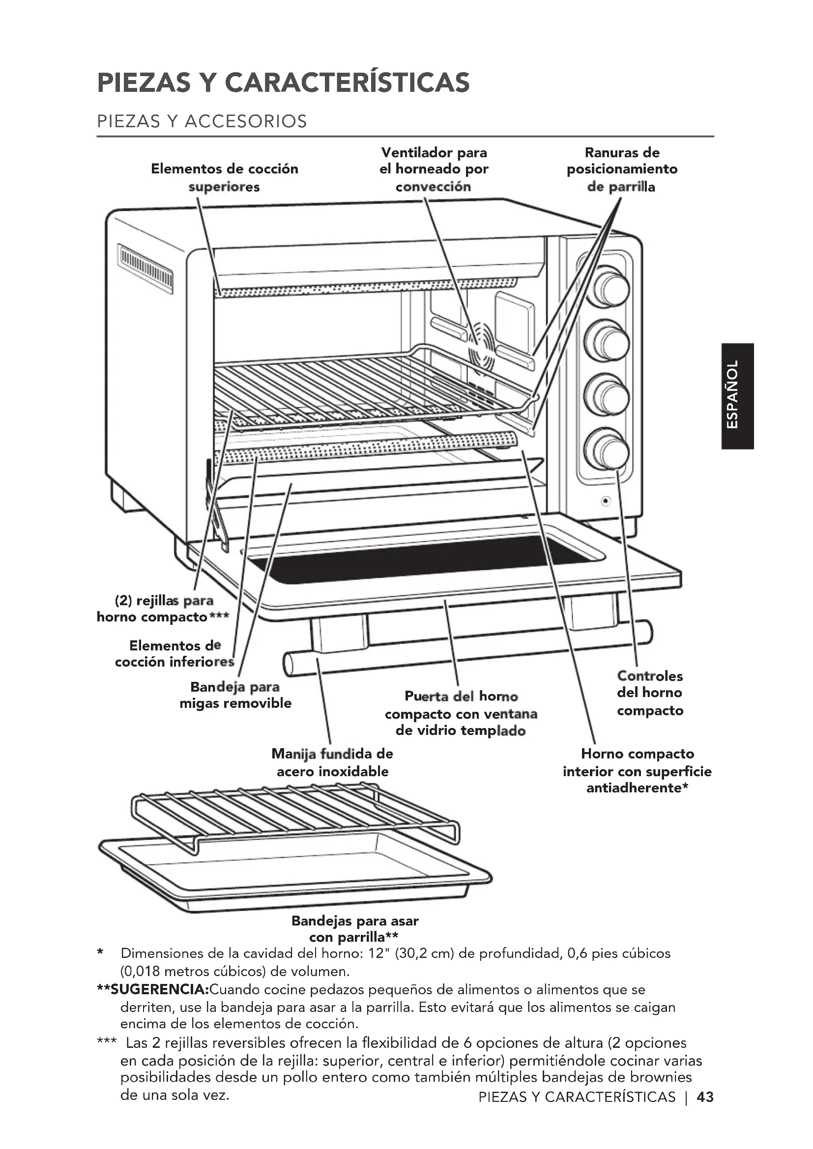 *** Las 2 rejoillas revisibles ofrecen la flexibilidad de 6 optiones de alta (2 optiones en cada posicion de la rejoilla: superior, central e inferior) permitiendole cocinar varias posibilidades desde un pollo entero como también multipoles bandejas de brownies de una sola vez. PIEZAS Y CARACTERISTICAS | 4