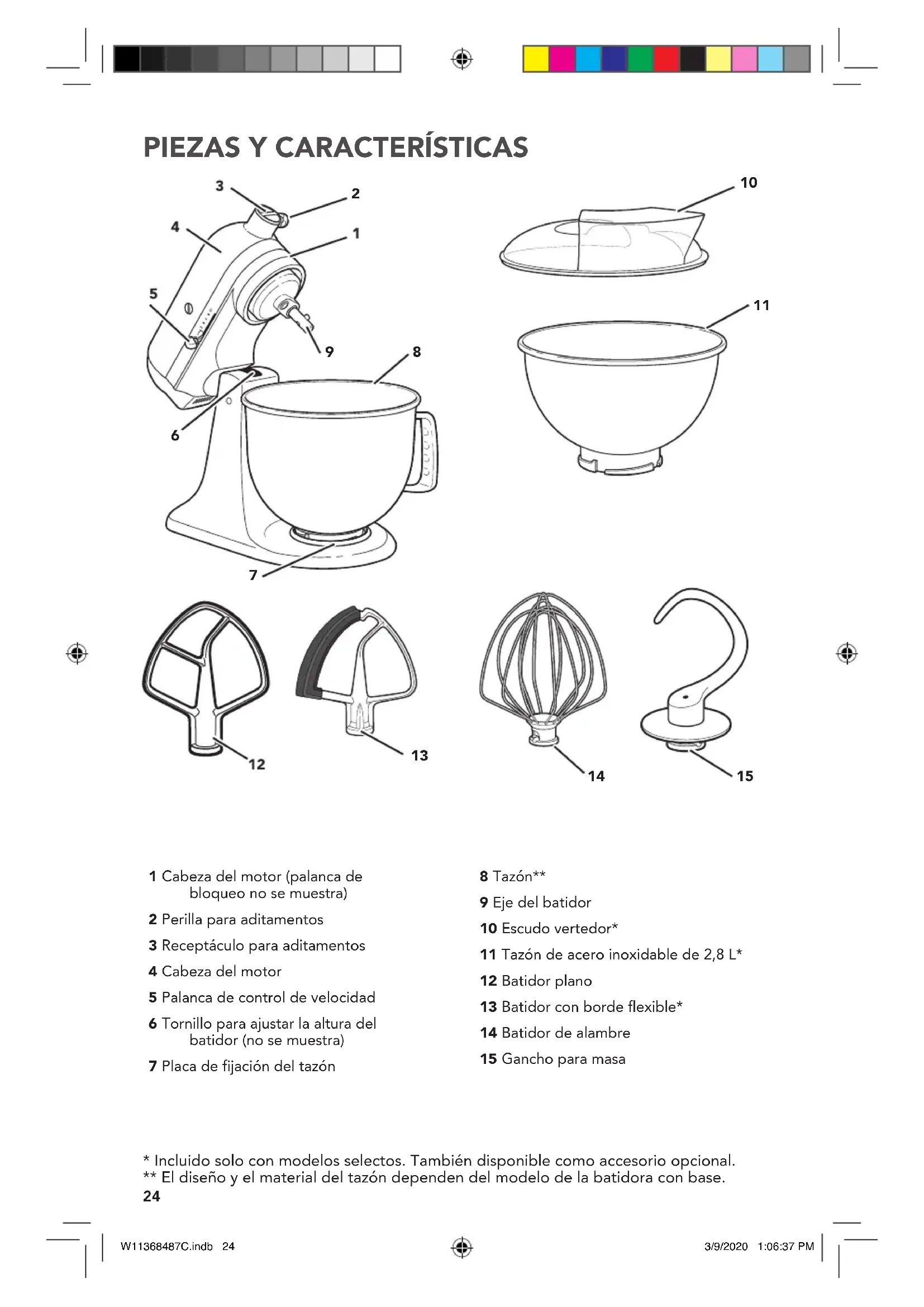 - Incluido solo con modelos selectos. También disponible como accesorio opcional. ** El diseño y el material del tazón dependen del modelo de la batidora con base. W11368487C.indb 24W11368487C.indb 24 3/9/2020 1:06:37 PM3/9/2020 1:06:37 PM25 ESPAÑOL