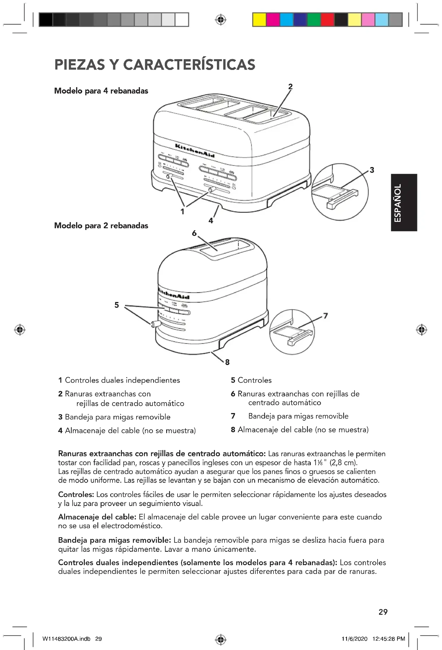 " (2,8 cm). Lasrejillas de centrado automático ayudan a asegurar que los panes finos o gruesos se calienten demodo uniforme. Las rejillas se levantan y se bajan con un mecanismo de elevación automático. Controles: Los controles fáciles de usar le permiten seleccionar rápidamente los ajustes deseados y la luz para proveer un seguimiento visual. Almacenaje del cable: El almacenaje del cable provee un lugar conveniente para este cuando no se usa el electrodoméstico. Bandeja para migas removible: La bandeja removible para migas se desliza hacia fuera para quitar las migas rápidamente. Lavar a mano únicamente. Controles duales independientes (solamente los modelos para 4 rebanadas): Los controles duales independientes le permiten seleccionar ajustes diferentes para cada par de ranuras.