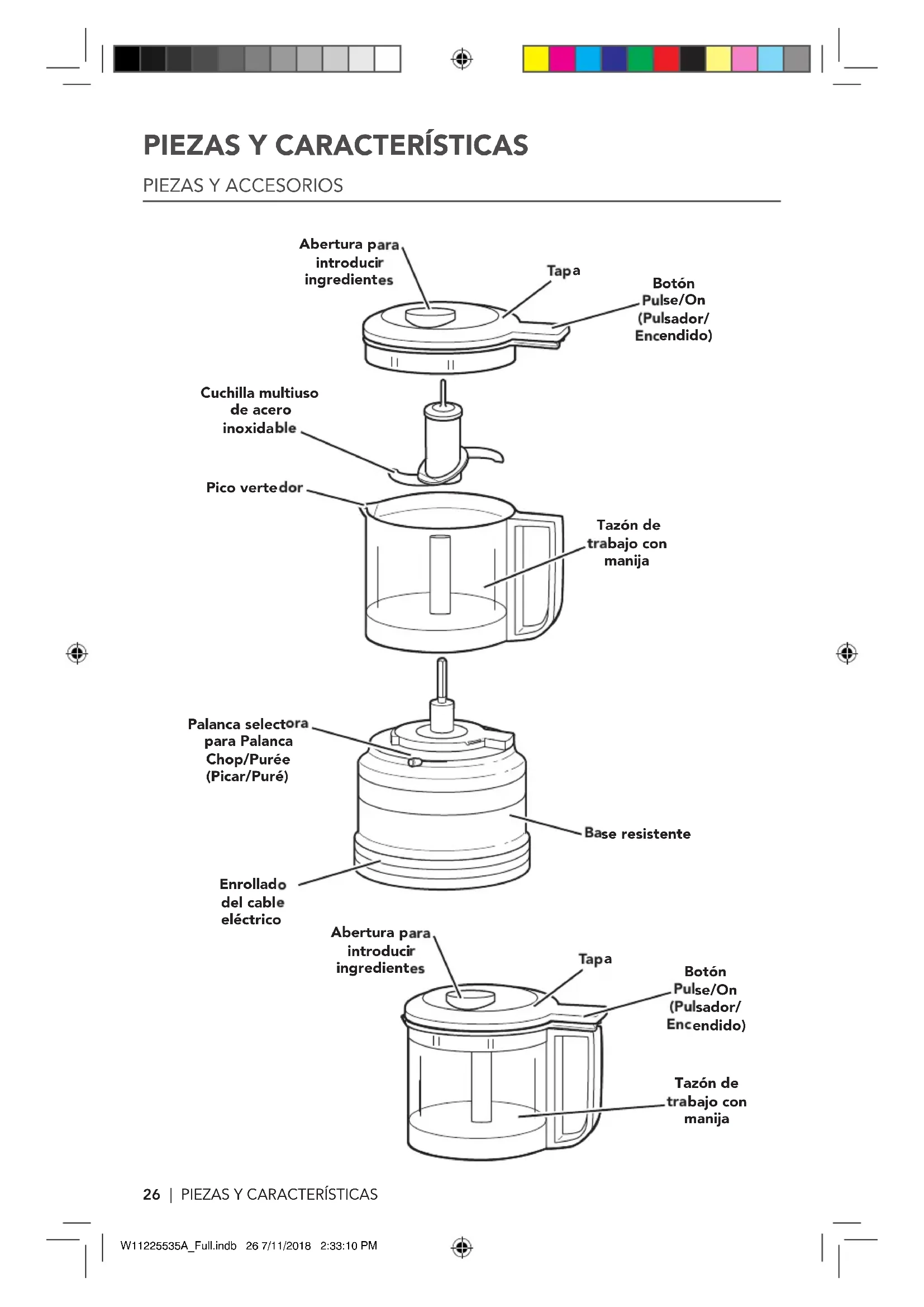 Tapa Tapa Tazón de trabajo con manija Tazón de trabajo con manija Enrollado del cable eléctrico Cuchilla multiuso de acero inoxidable Base resistente Palanca selectora para Palanca Chop/Purée (Picar/Puré) Abertura para introducir ingredientes Abertura para introducir ingredientes Botón Pulse/On (Pulsador/ Encendido) Botón Pulse/On (Pulsador/ Encendido) Pico vertedor W11225535A_Full.indb 26 7/11/2018 2:33:10 PMSEGURIDAD DE LA PICADORA | 27 ESPAÑOL