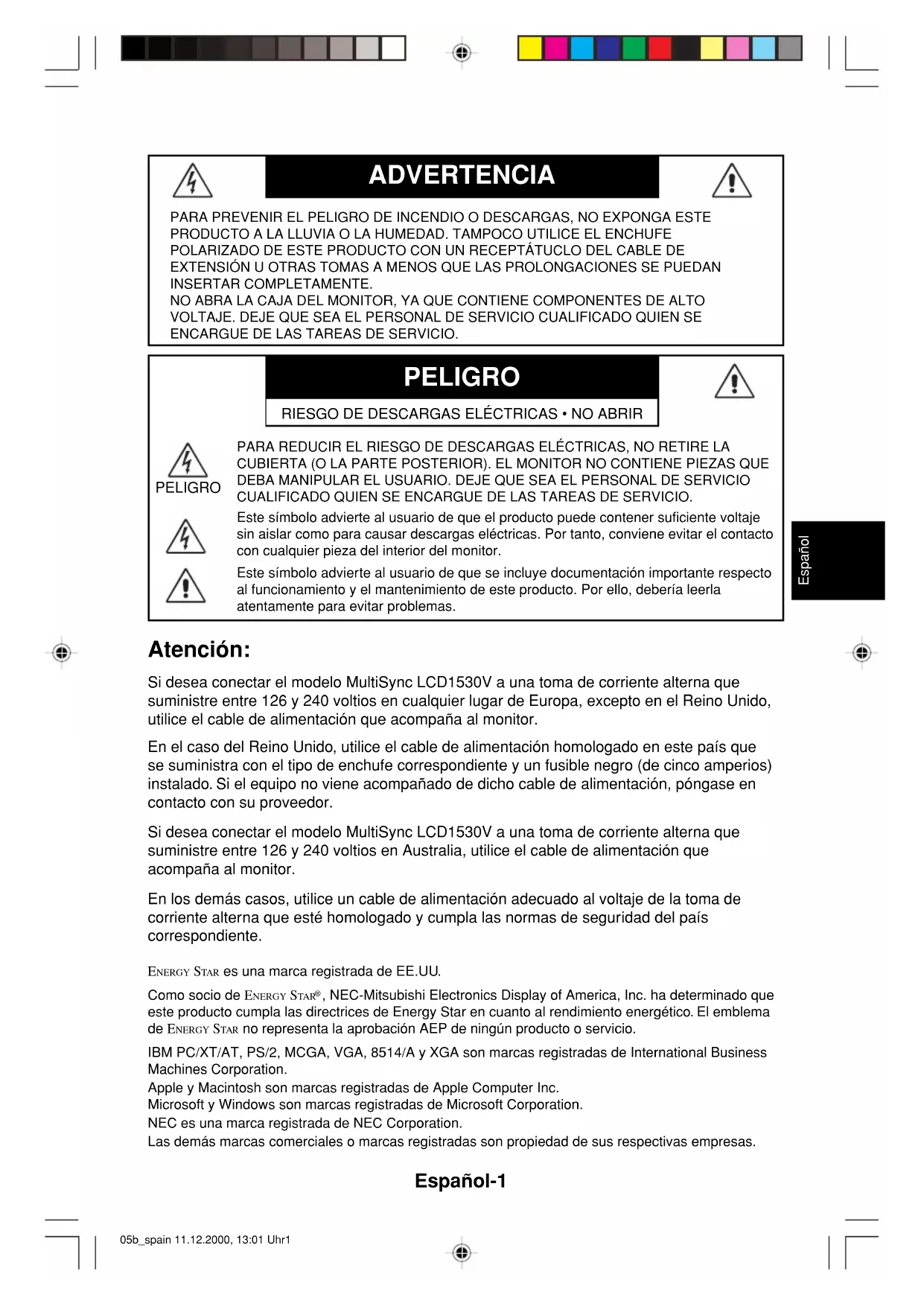 , NEC-Mitsubishi Electronics Display of America, Inc. ha determinado que este producto cumpla las directrices de Energy Star en cuanto al rendimiento energético. El emblema de ENERGY STAR no representa la aprobación AEP de ningún producto o servicio. IBM PC/XT/AT, PS/2, MCGA, VGA, 8514/A y XGA son marcas registradas de International BusinessMachines Corporation.Apple y Macintosh son marcas registradas de Apple Computer Inc.Microsoft y Windows son marcas registradas de Microsoft Corporation.NEC es una marca registrada de NEC Corporation.Las demás marcas comerciales o marcas registradas son propiedad de sus respectivas empresas. Atención: Si desea conectar el modelo MultiSync LCD1530V a una toma de corriente alterna que suministre entre 126 y 240 voltios en cualquier lugar de Europa, excepto en el Reino Unido, utilice el cable de alimentación que acompaña al monitor. En el caso del Reino Unido, utilice el cable de alimentación homologado en este país que se suministra con el tipo de enchufe correspondiente y un fusible negro (de cinco amperios) instalado. Si el equipo no viene acompañado de dicho cable de alimentación, póngase en contacto con su proveedor. Si desea conectar el modelo MultiSync LCD1530V a una toma de corriente alterna que suministre entre 126 y 240 voltios en Australia, utilice el cable de alimentación que acompaña al monitor. En los demás casos, utilice un cable de alimentación adecuado al voltaje de la toma de corriente alterna que esté homologado y cumpla las normas de seguridad del país correspondiente. 05b_spain 11.12.2000, 13:01 Uhr1Español-2 Declaración Declaraciones del fabricante Por la presente certificamos que el monitor en color MultiSync LCD1530V (LA-15R01) cumple la Directiva 73/23/EEC: - EN 60950 Directiva 89/336/EEC: - EN 55022 - EN 61000-3-2 - EN 61000-3-3 - EN 55024 y se comercializa con las marcas NEC-Mitsubishi Electric Visual Systems, Corp.