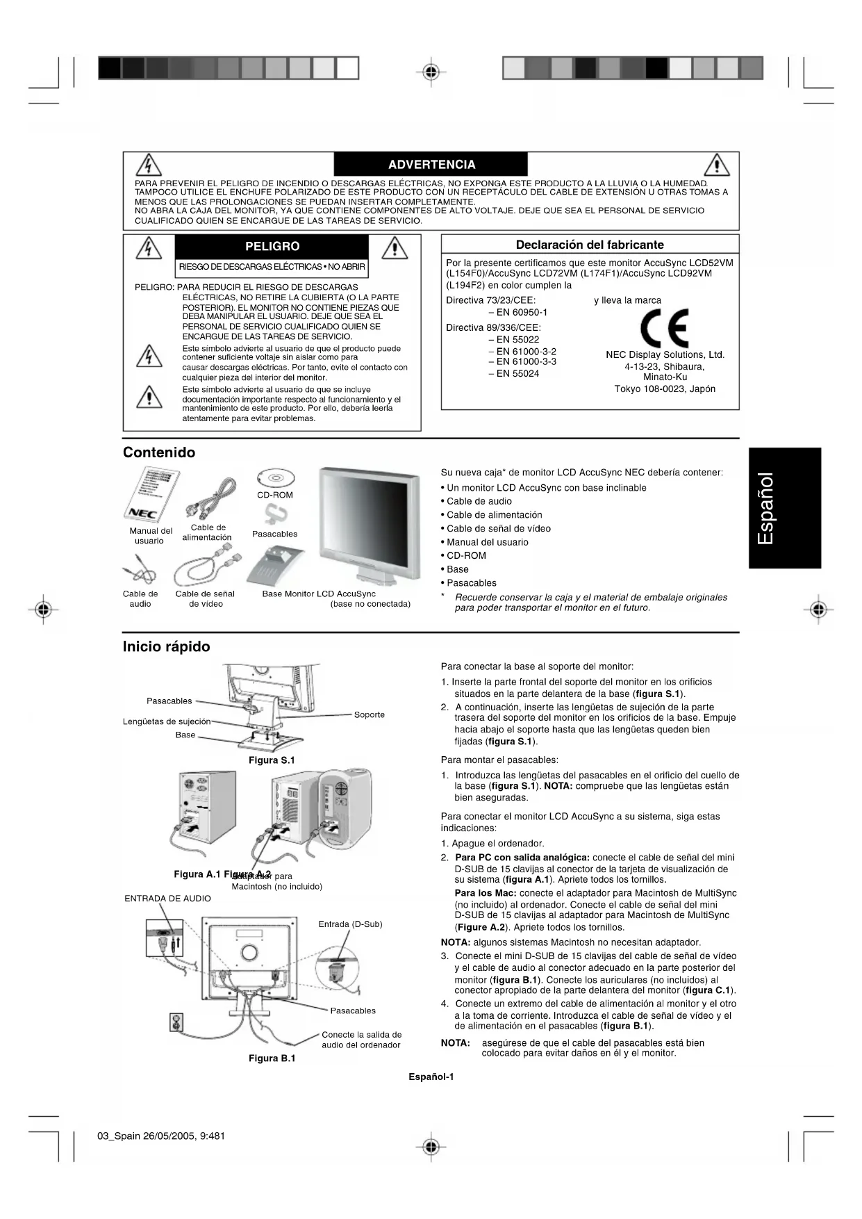 Indica el número de modelo y de serie del monitor. Mensaje de advertencia OSM Los mensajes de advertencia OSM desaparecen con el botón Exit. NO HAY SEÑAL: esta función avisa al usuario cuando no se recibe ninguna señal. Una vez conectada la alimentación, cuando se modifica la señal de entrada o el vídeo no está activo, aparecerá la ventana No hay señal. AVISO DE RESOLUCIÓN: esta función advierte de que se debe optimizar la resolución. Al encender el monitor, al modificar la señal de entrada y cuando la resolución de la señal de vídeo no es la adecuada, aparecerá la ventana de alerta de Aviso de resolución. Esta función se puede desactivar en el menú TOOL (herramienta). FUERA DE RANGO: esta función recomienda optimizar la resolución y la velocidad de regeneración de la imagen. El menú Fuera de rango puede aparecer después de encender el monitor, al modificar la señal de entrada o si la cadencia de la señal de vídeo no es la adecuada. 03_Spain 26/05/2005, 9:483Français Français-1 Déclaration du constructeur Nous certifions par le présent document que le moniteur couleur AccuSync LCD52VM (L154F0)/AccuSync LCD72VM (L174F1) et AccuSync LCD92VM (L194F2) sont en conformité avec la directive européenne 73/23/EEC : – EN 60950-1 la directive européenne 89/336/EEC : – EN 55022 – EN 61000-3-2 – EN 61000-3-3 – EN 55024