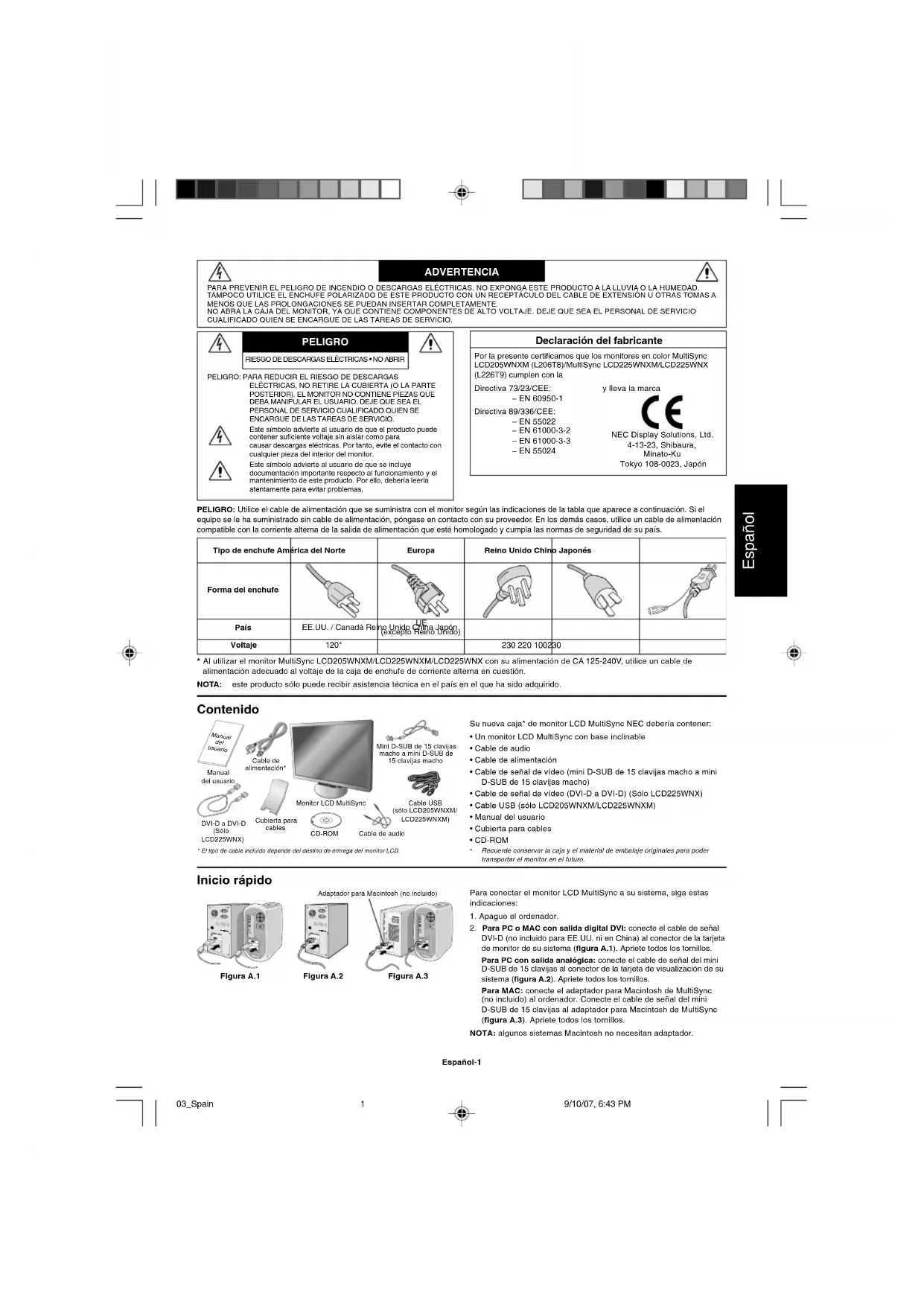 DVI-D (no incluido para EE.UU. ni en China) al conector de la tarjeta de monitor de su sistema (figura A.1). Apriete todos los tornillos. Para PC con salida analógica: conecte el cable de señal del mini D-SUB de 15 clavijas al conector de la tarjeta de visualización de su sistema (figura A.2). Apriete todos los tornillos. Para MAC: conecte el adaptador para Macintosh de MultiSync (no incluido) al ordenador. Conecte el cable de señal del mini D-SUB de 15 clavijas al adaptador para Macintosh de MultiSync (figura A.3). Apriete todos los tornillos. NOTA: algunos sistemas Macintosh no necesitan adaptador. Figura A.1 Figura A.2 Adaptador para Macintosh (no incluido)CD-ROM Figura A.3 Manual del usuario* El tipo de cable incluido depende del destino de entrega del monitor LCD.Cable USB(sólo LCD205WNXM/LCD225WNXM)Cubierta paracables 03_Spain 9/10/07, 6:43 PM1Español-2 Español